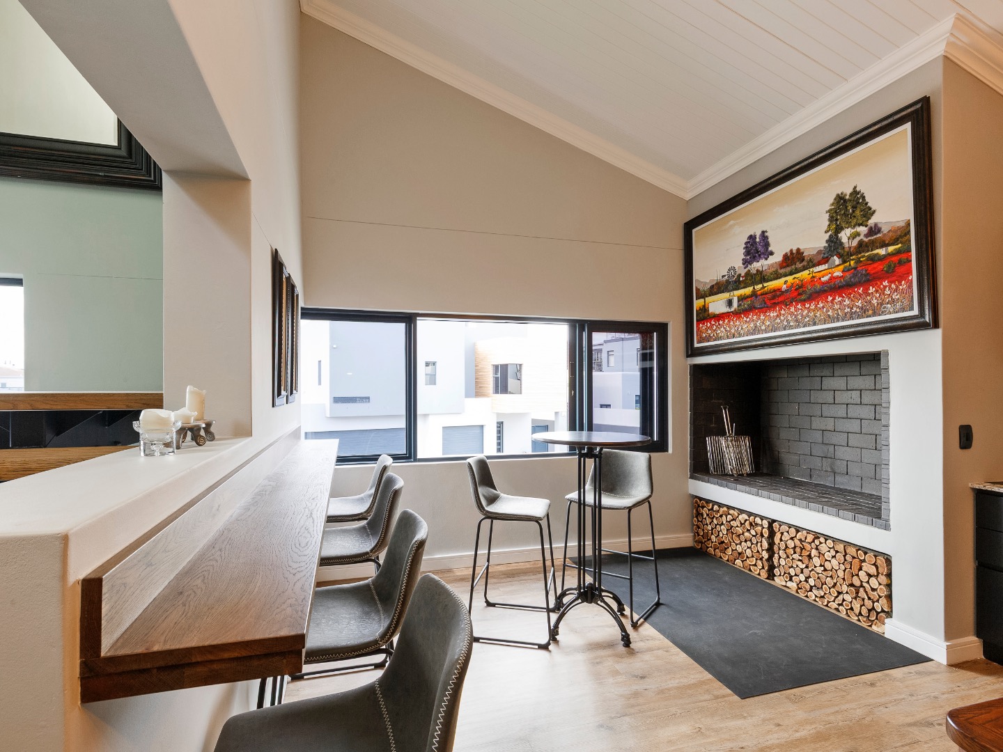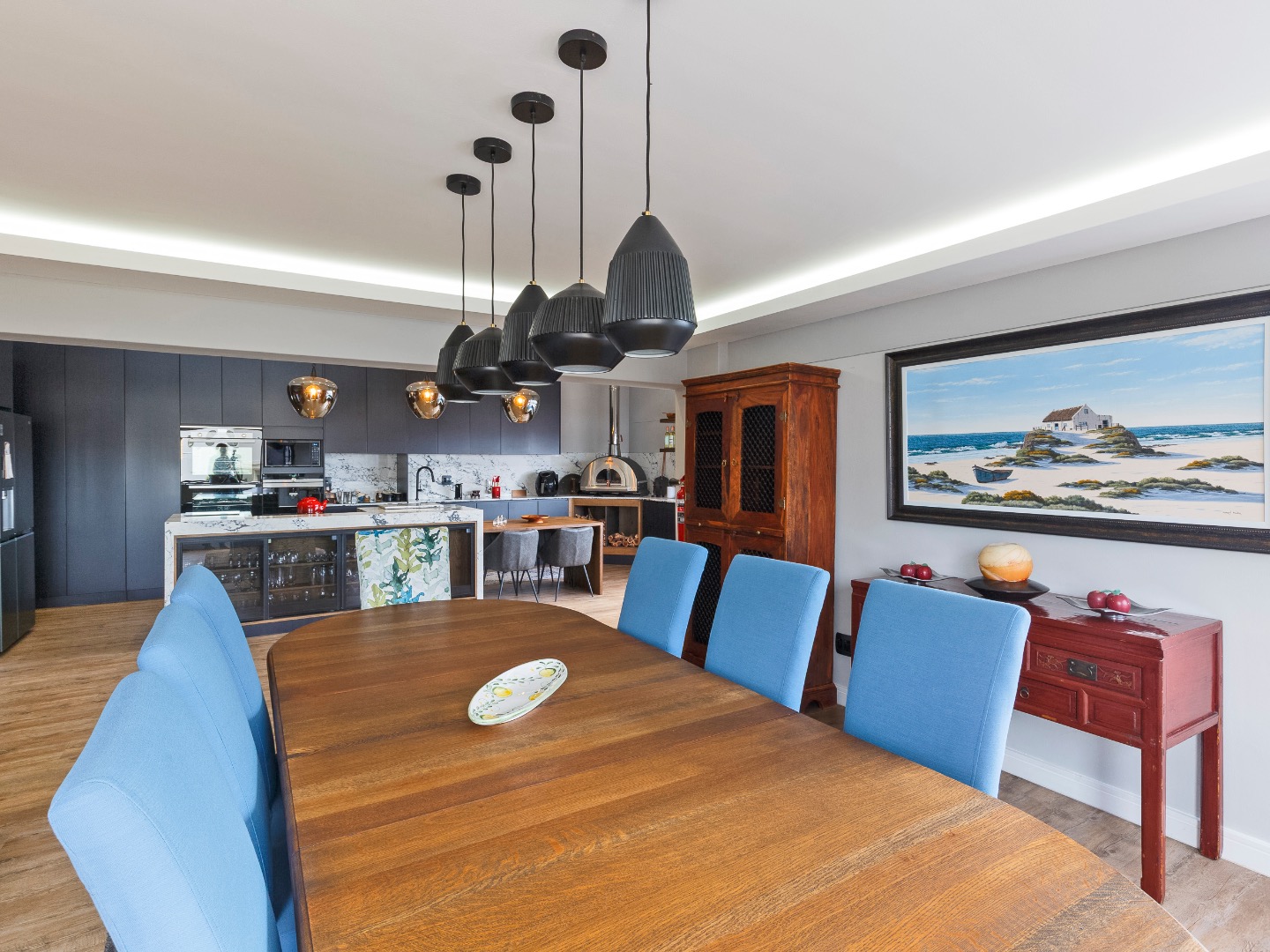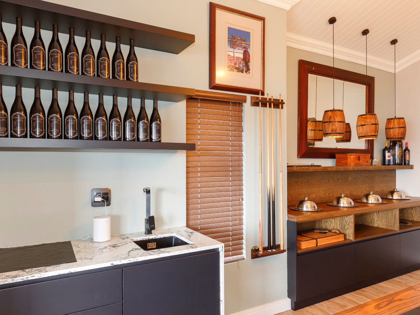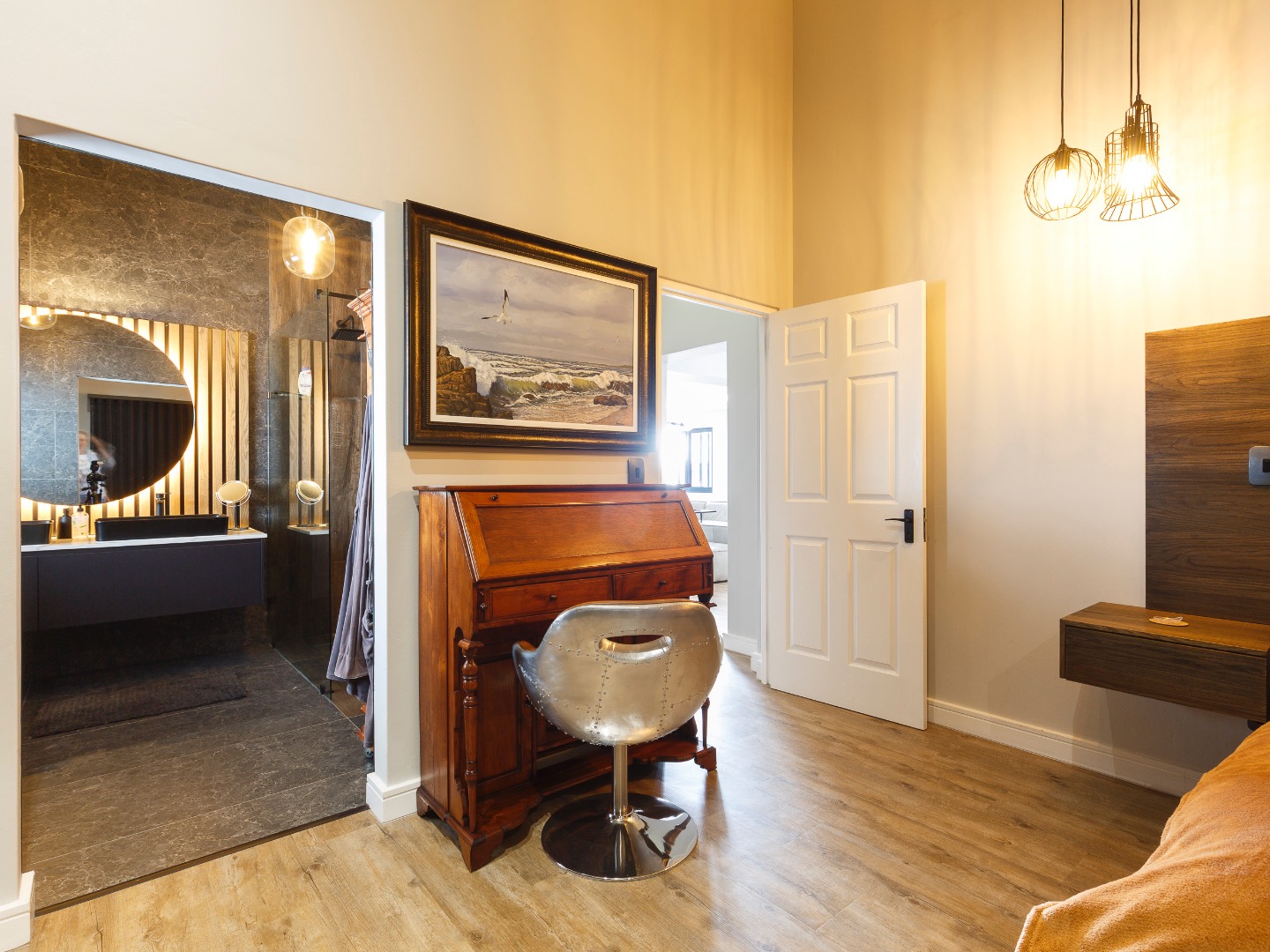 Upstairs is an entertainer’s dream: ocean views, a statement bar and braai area, elegant lounge and dining room, and a designer kitchen with centre island, gas hob and pizza oven, plus scullery and walk-in pantry. The main suite is a private sanctuary with bespoke wardrobes and a spa-style bathroom.