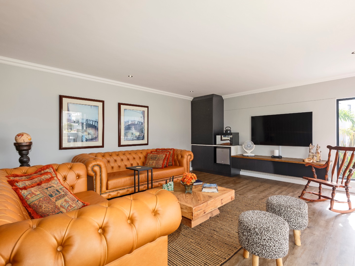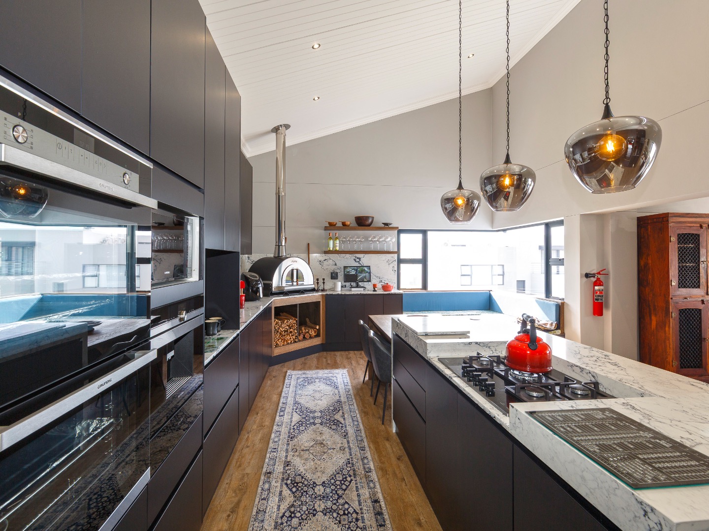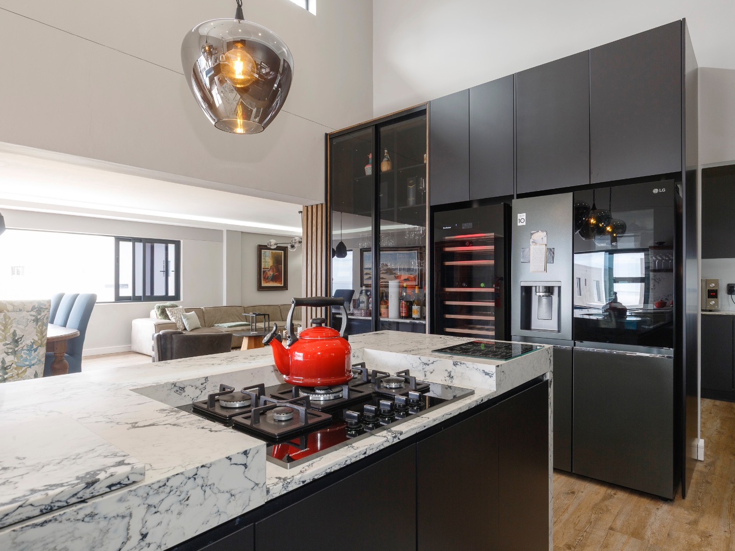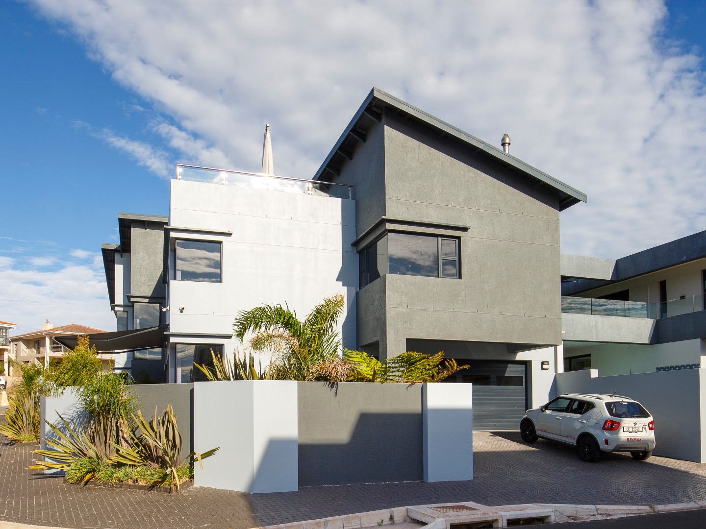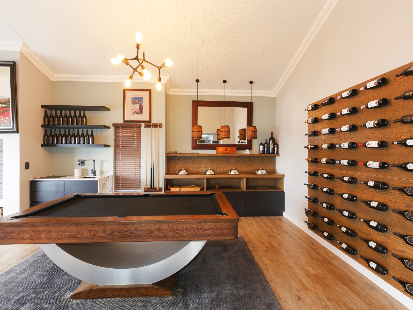 Upstairs is an entertainer’s dream: ocean views, a statement bar and braai area, elegant lounge and dining room, and a designer kitchen with centre island, gas hob and pizza oven, plus scullery and walk-in pantry. The main suite is a private sanctuary with bespoke wardrobes and a spa-style bathroom.
