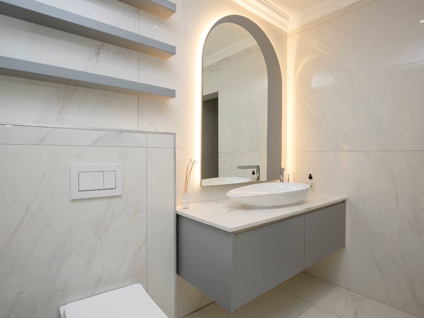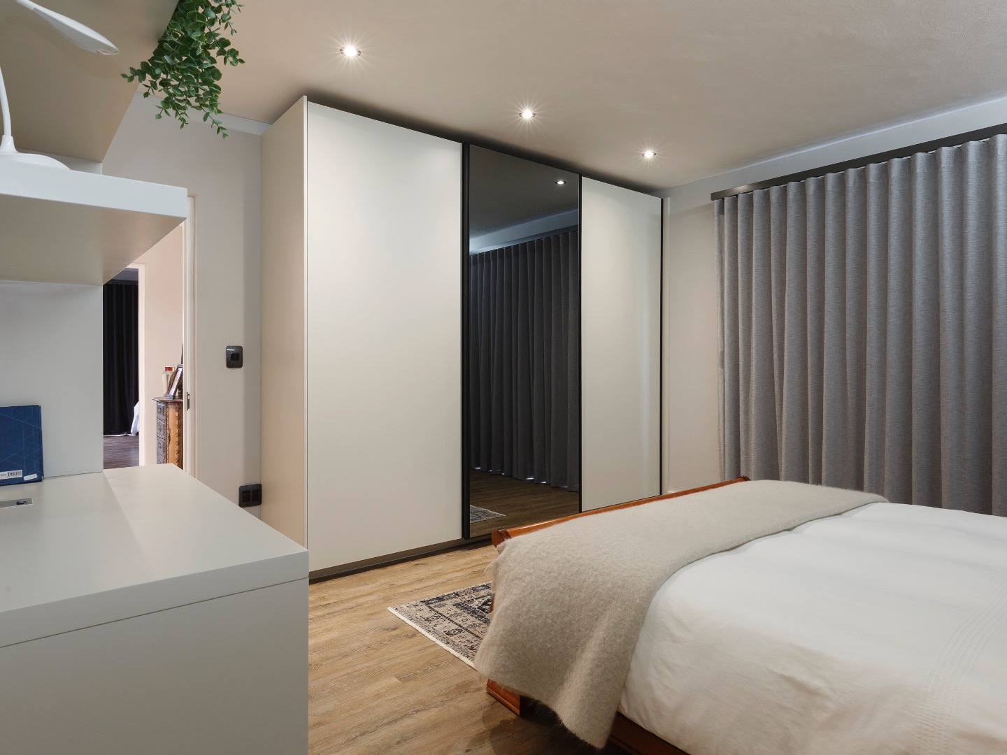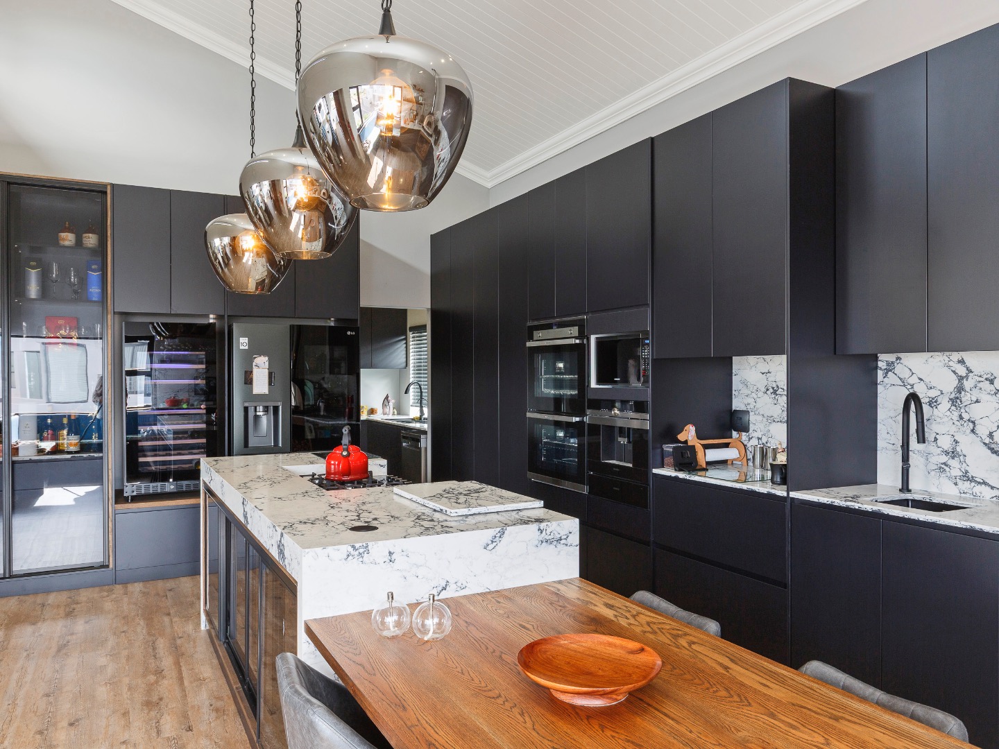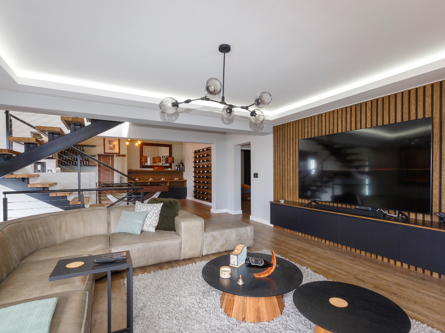 Upstairs is an entertainer’s dream: ocean views, a statement bar and braai area, elegant lounge and dining room, and a designer kitchen with centre island, gas hob and pizza oven, plus scullery and walk-in pantry. The main suite is a private sanctuary with bespoke wardrobes and a spa-style bathroom.