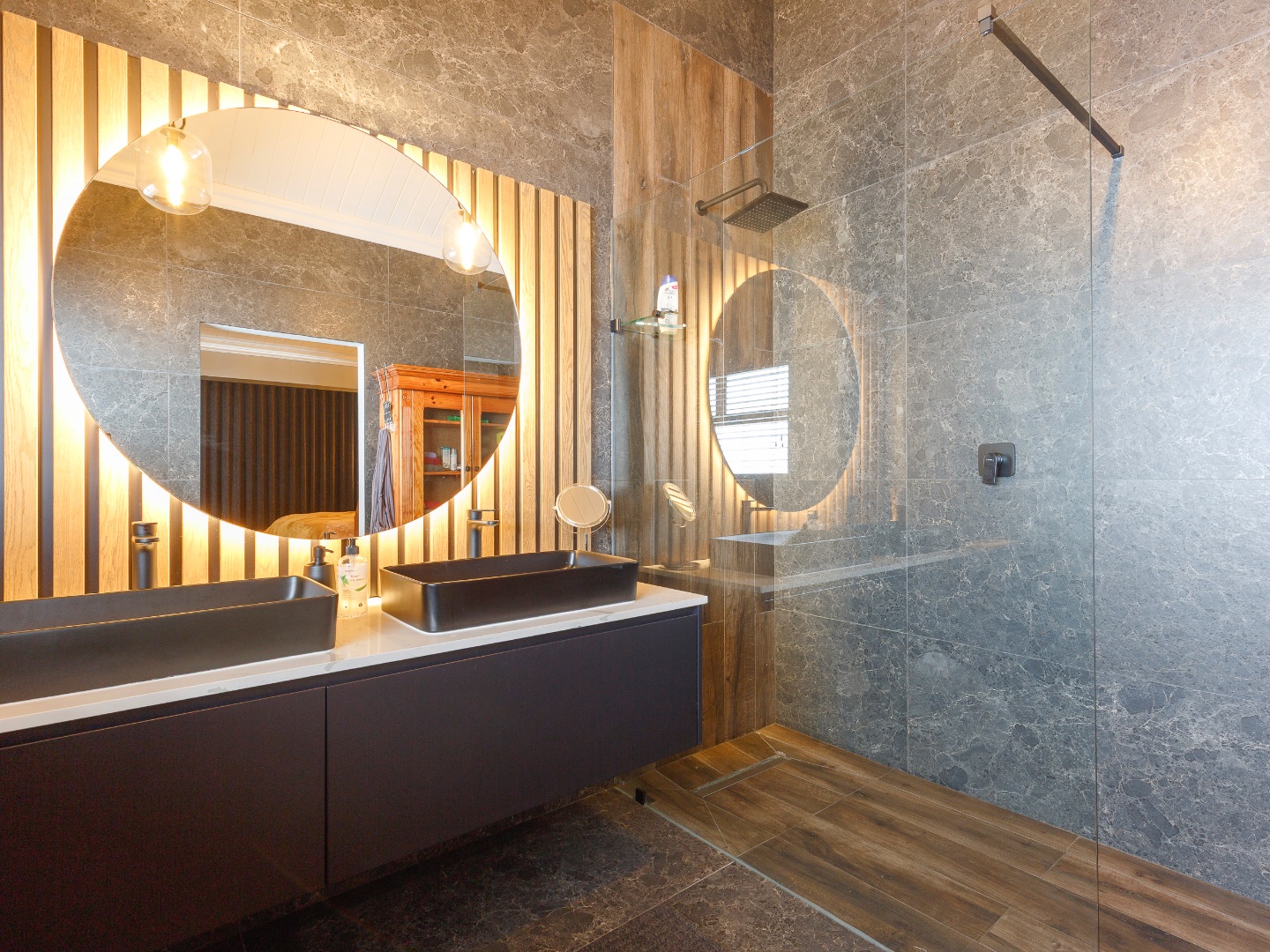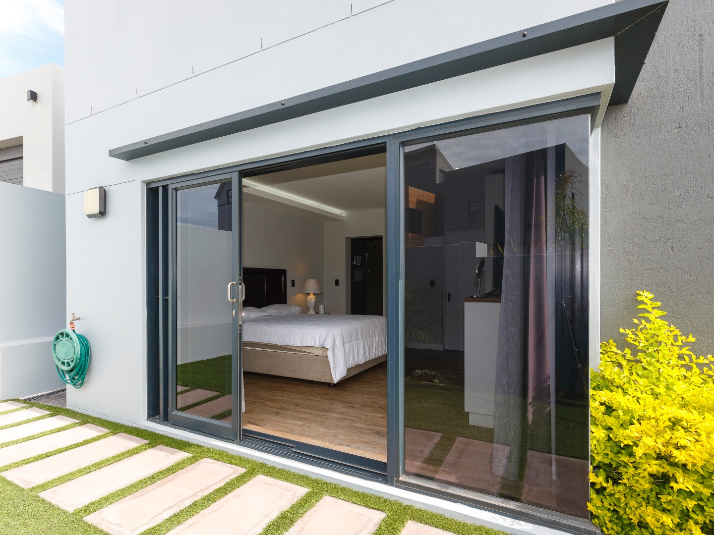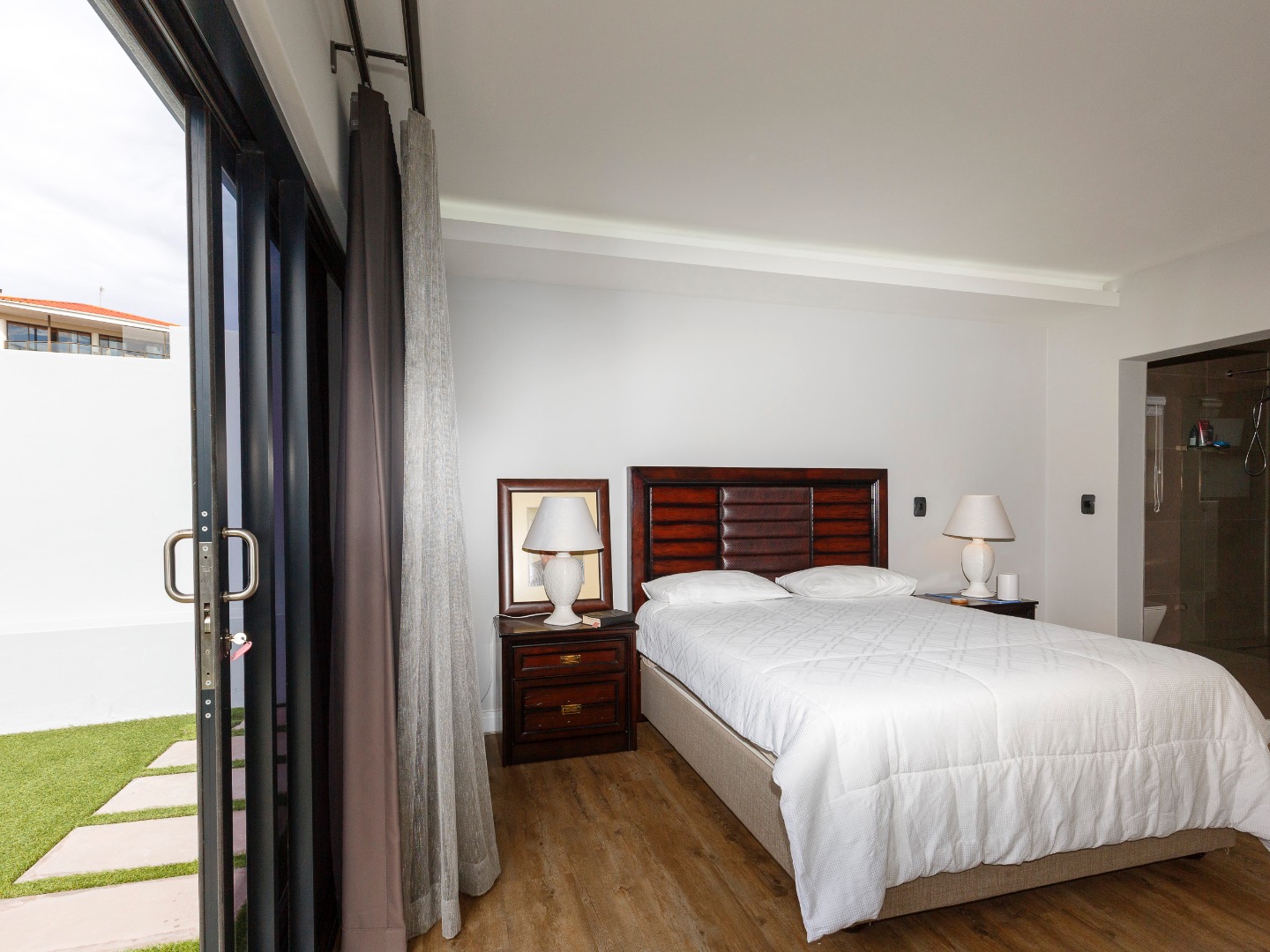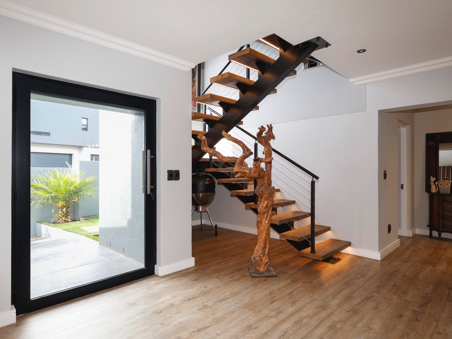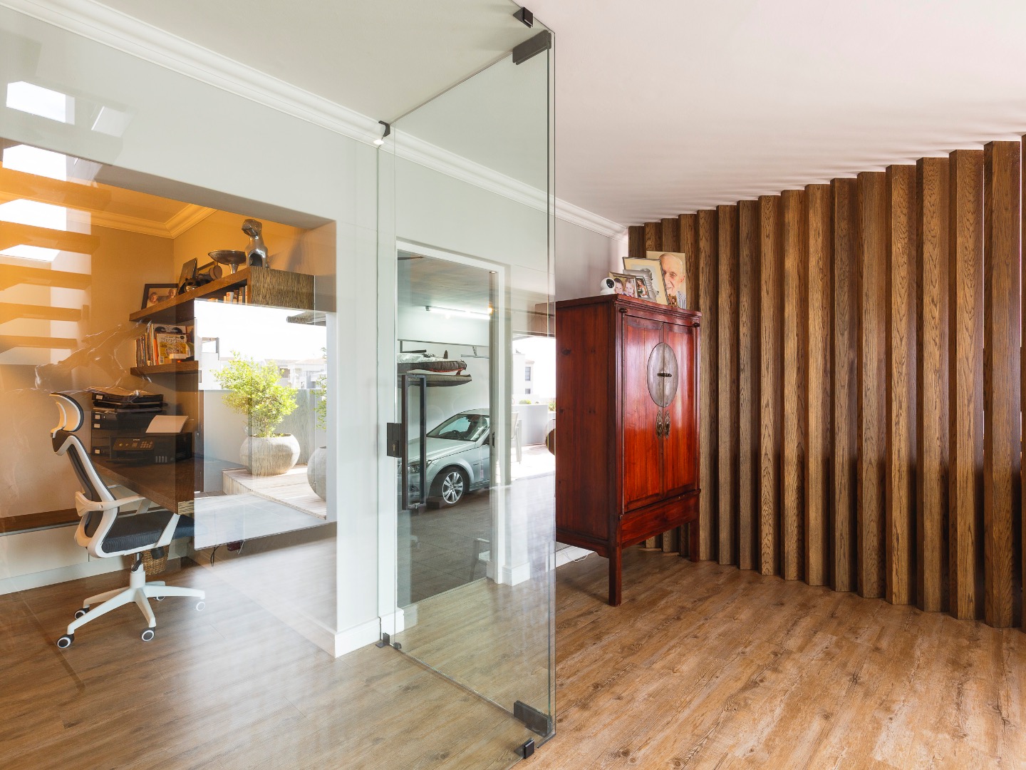 The lower level welcomes you with a glass-enclosed study, extra-length double automated garage with laundry, and full off-grid features including solar, inverter and gas geysers. Two en-suite bedrooms — one with kitchenette and private garden access — offer ideal guest or rental potential, while the walled garden and automated-roof patio create tranquil outdoor living spaces.