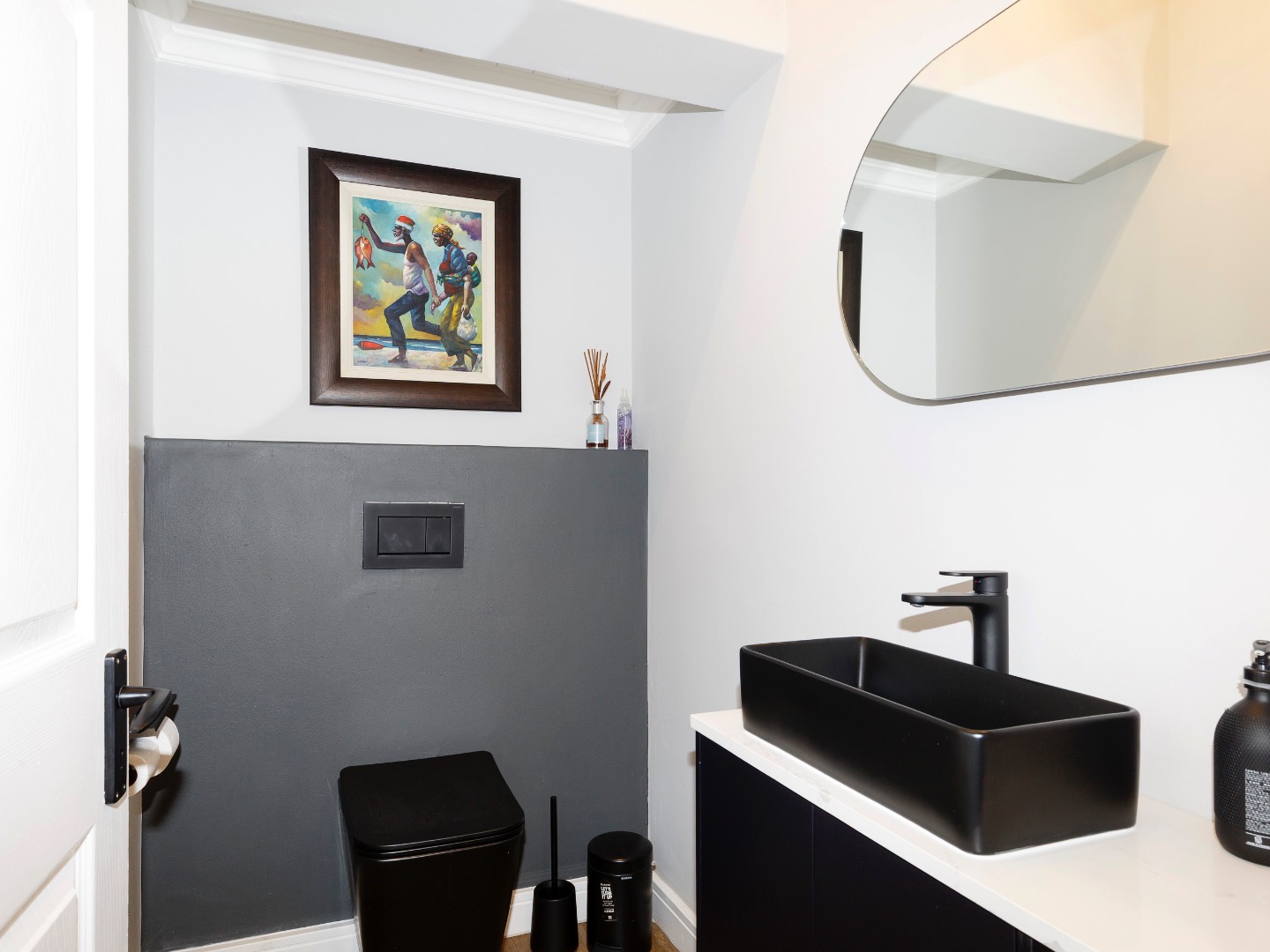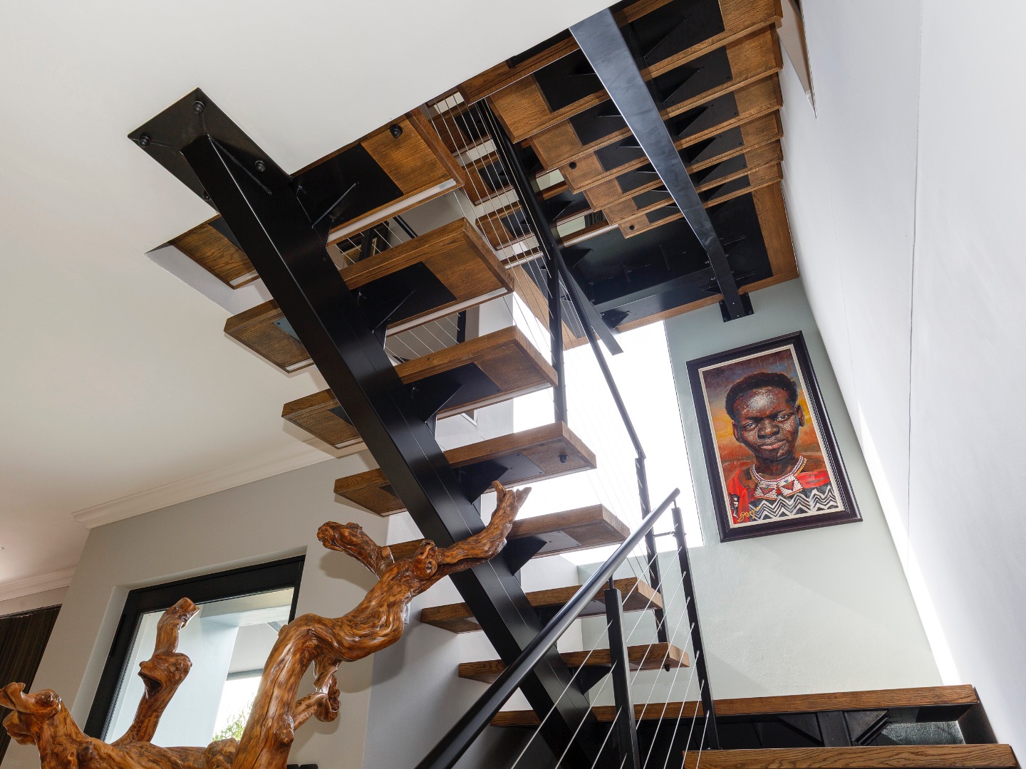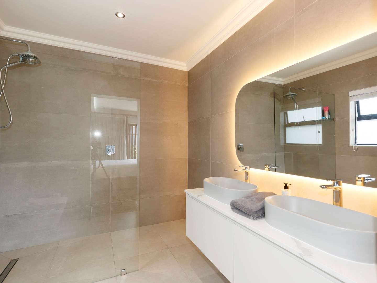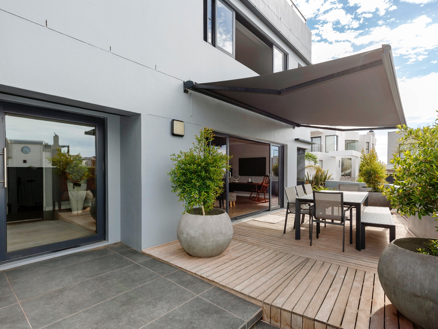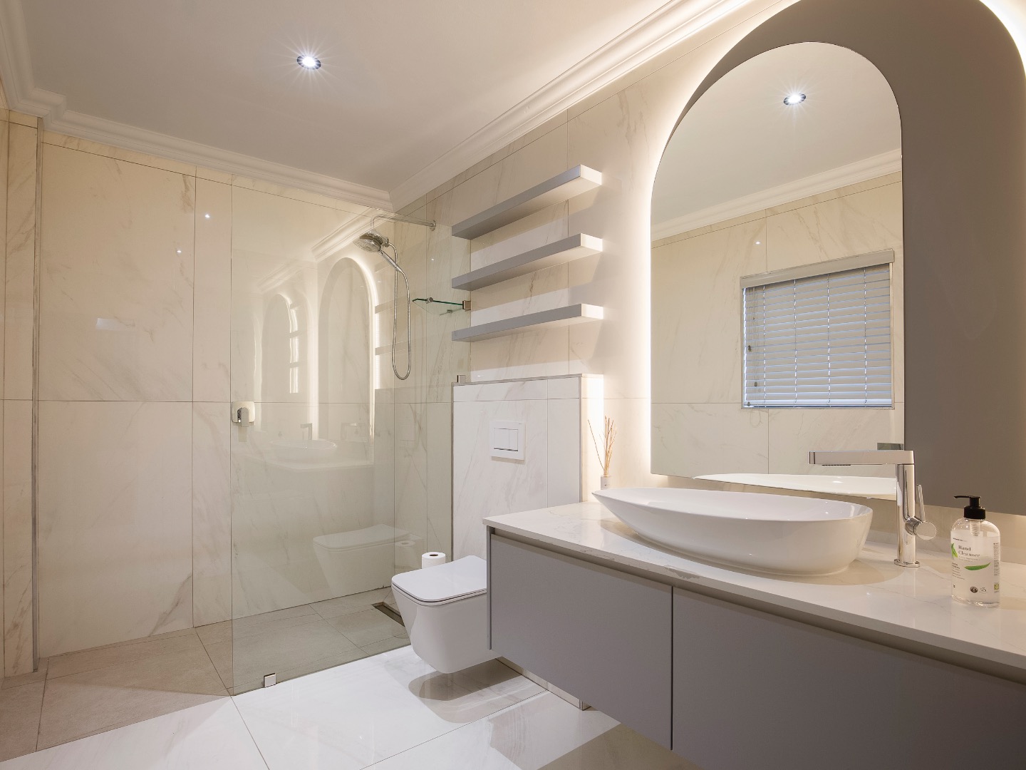 The lower level welcomes you with a glass-enclosed study, extra-length double automated garage with laundry, and full off-grid features including solar, inverter and gas geysers. Two en-suite bedrooms — one with kitchenette and private garden access — offer ideal guest or rental potential, while the walled garden and automated-roof patio create tranquil outdoor living spaces.
