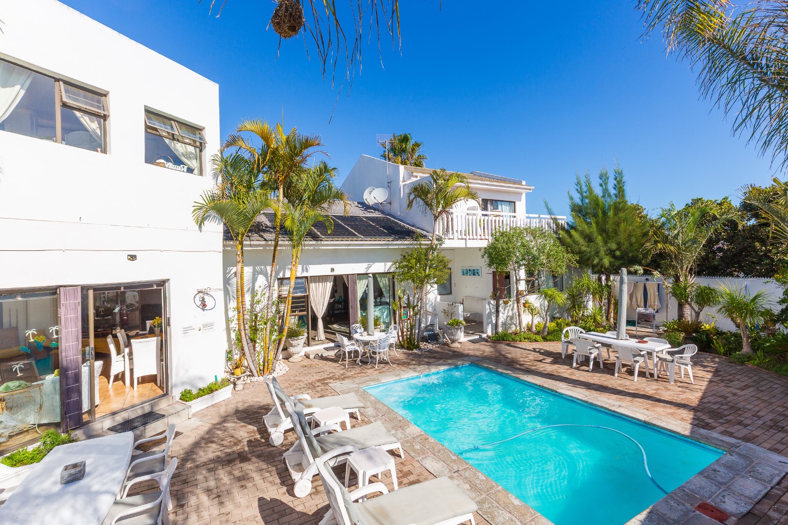 Professionally managed and fully compliant, the property holds all necessary business rights and current health certifications. Guests are welcomed into a serene sanctuary, where leisure and well-being are paramount. Highlights include a year-round outdoor swimming pool, sun-drenched terrace, and covered entertainment area with an elegant outdoor fireplace. A games room with indoor braai and bar, alongside a luxurious spa and wellness retreat, completes the picture of relaxed sophistication.