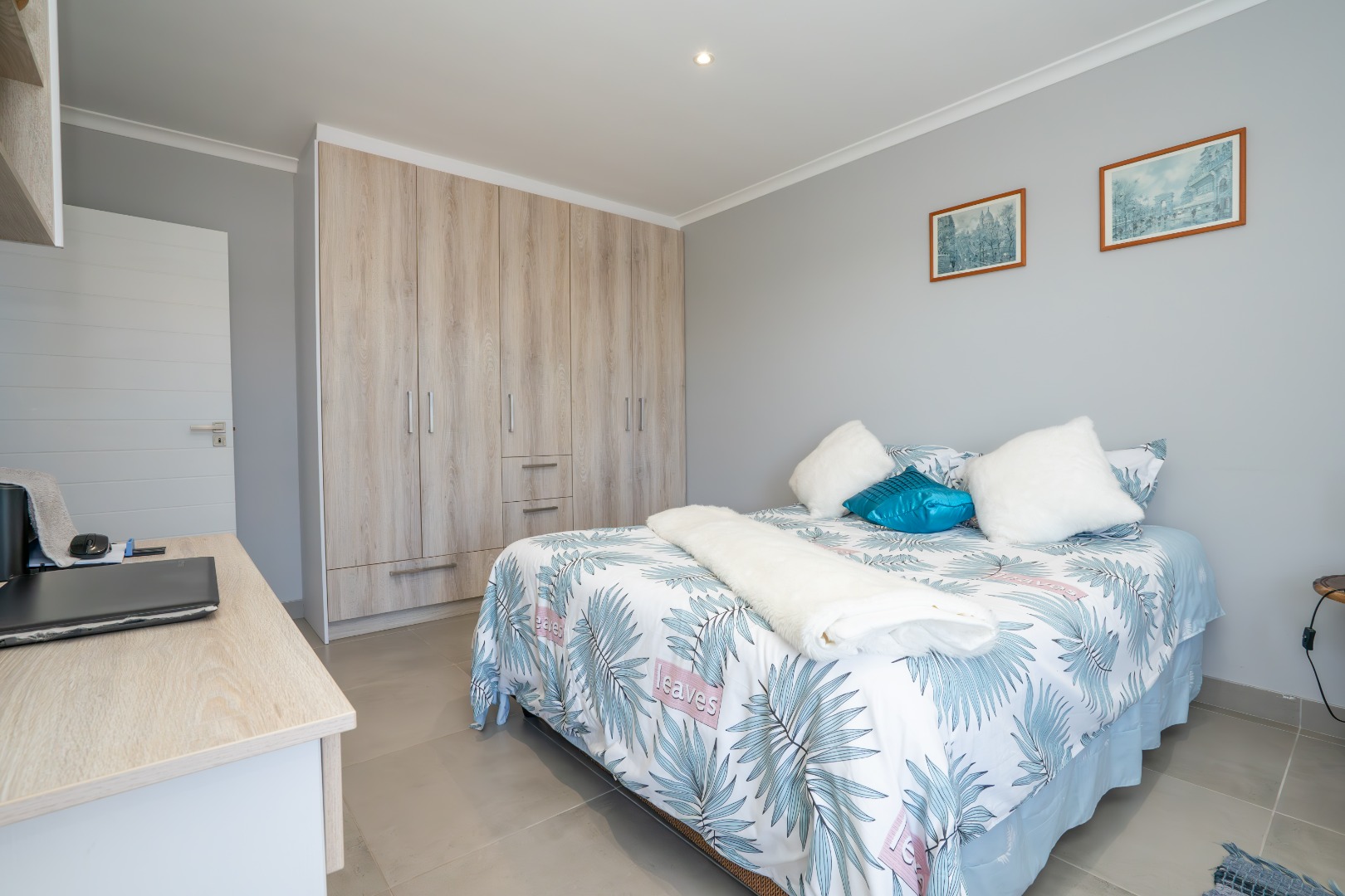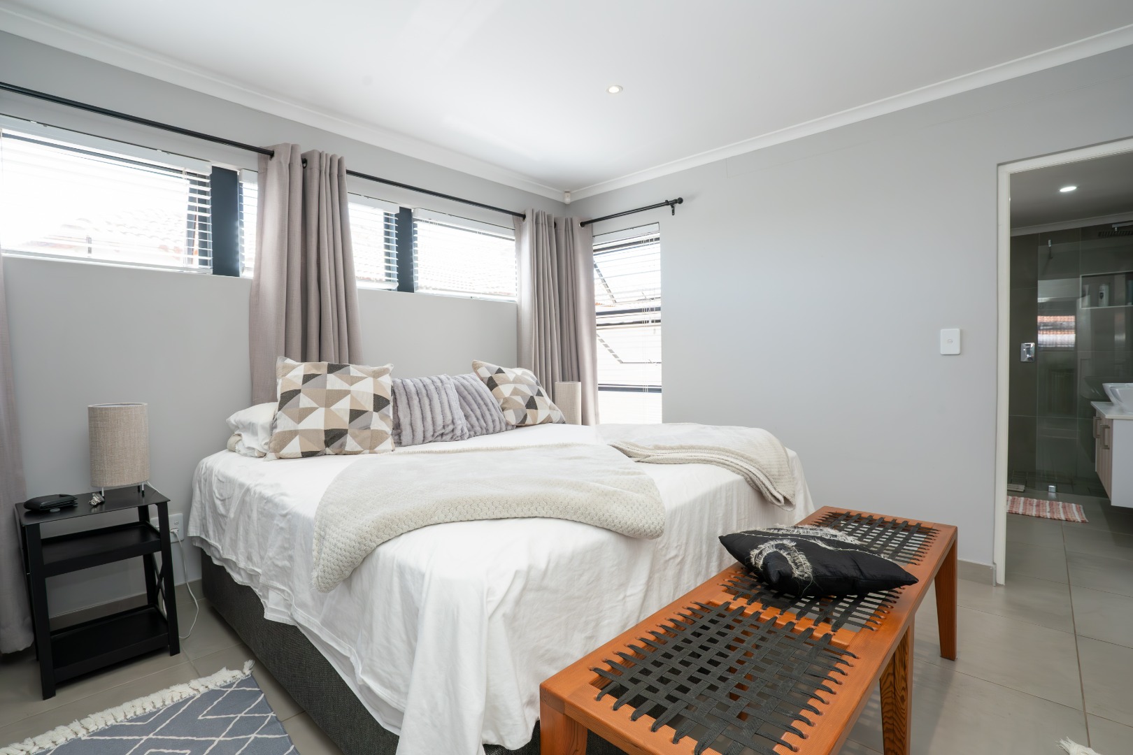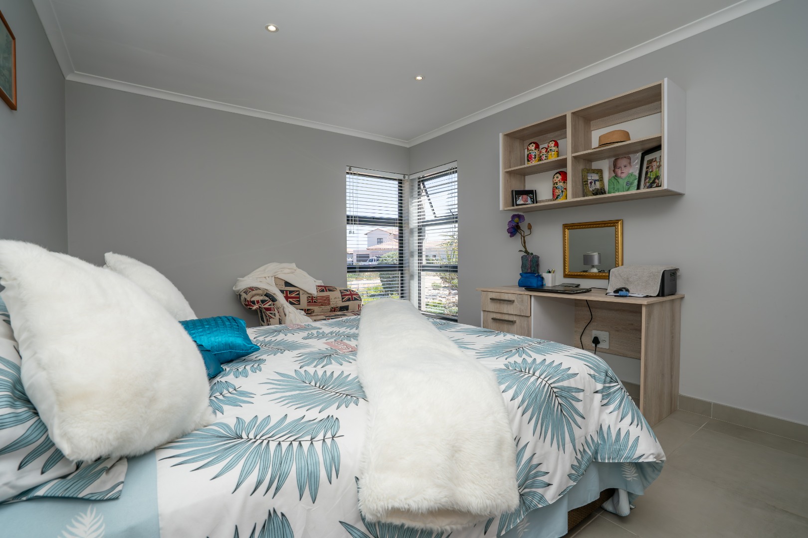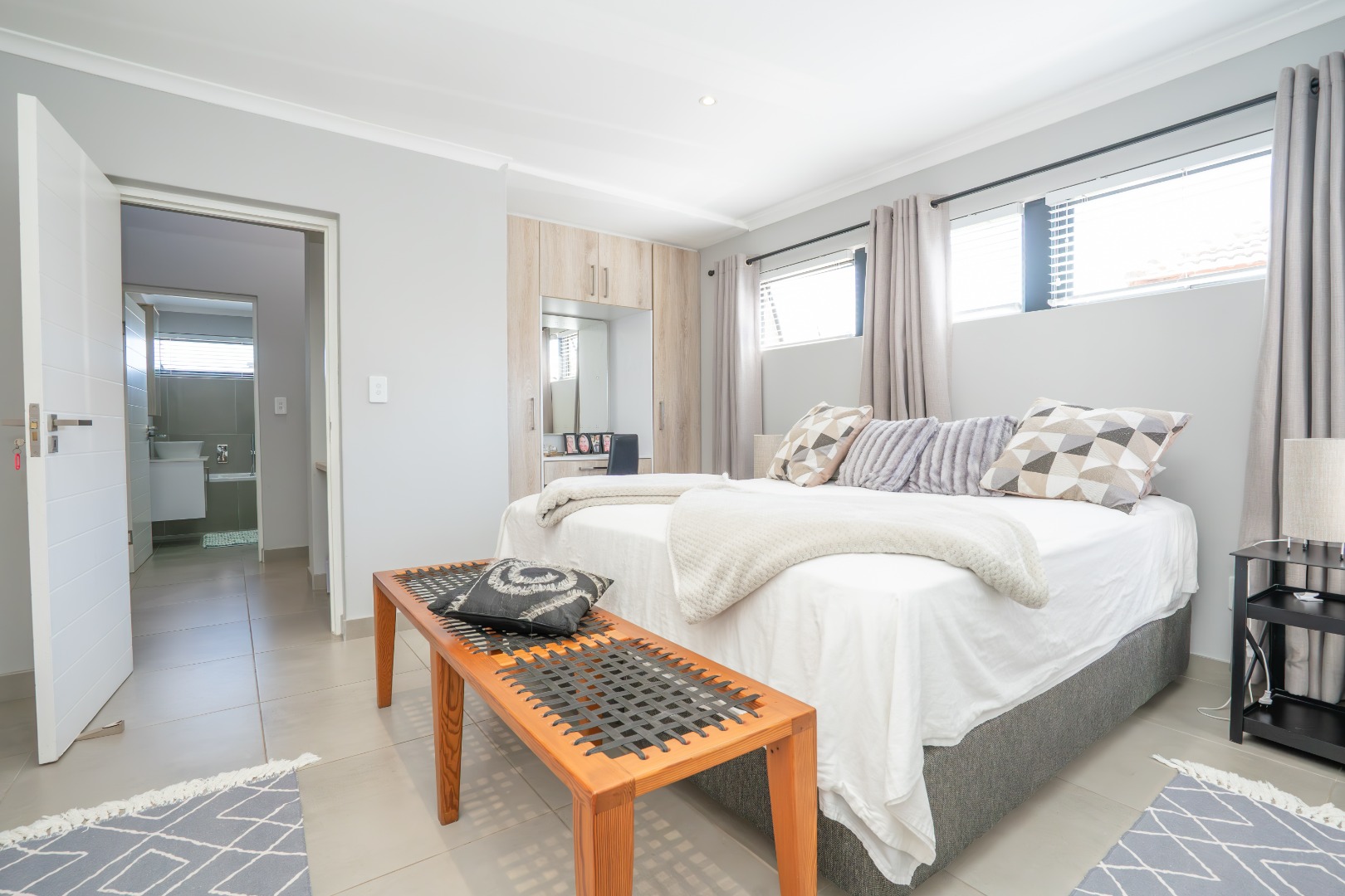 All three bedrooms are positioned in the north wing, each with built-in cupboards and there is a small study nook in between. The main bedroom is a private sanctuary, complete with a full en-suite bathroom, while the two guest bedrooms share a well-appointed family bathroom. The home is fully tiled throughout, ensuring a sleek, modern finish and easy upkeep.
