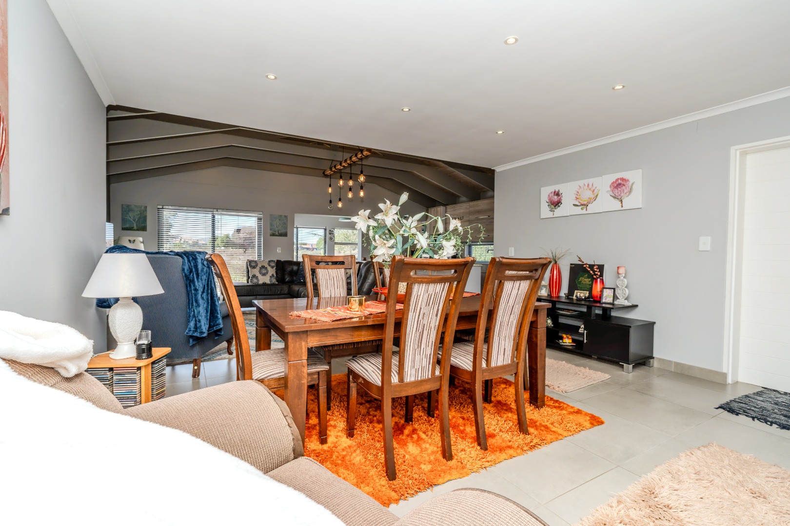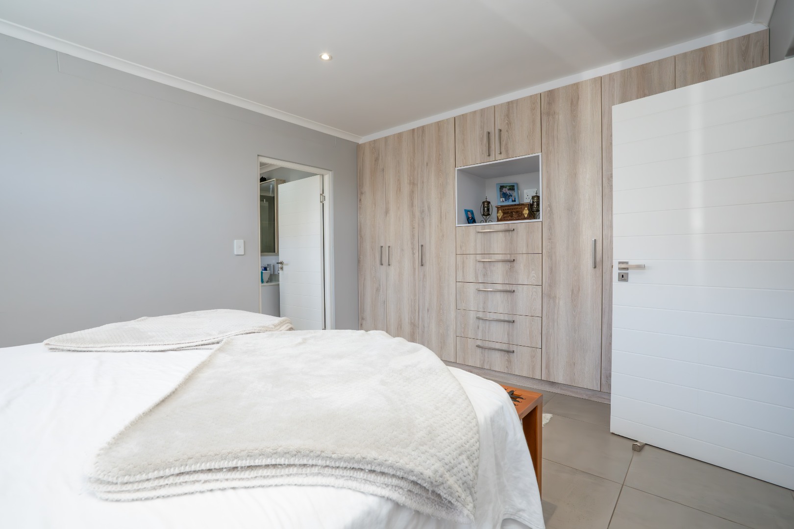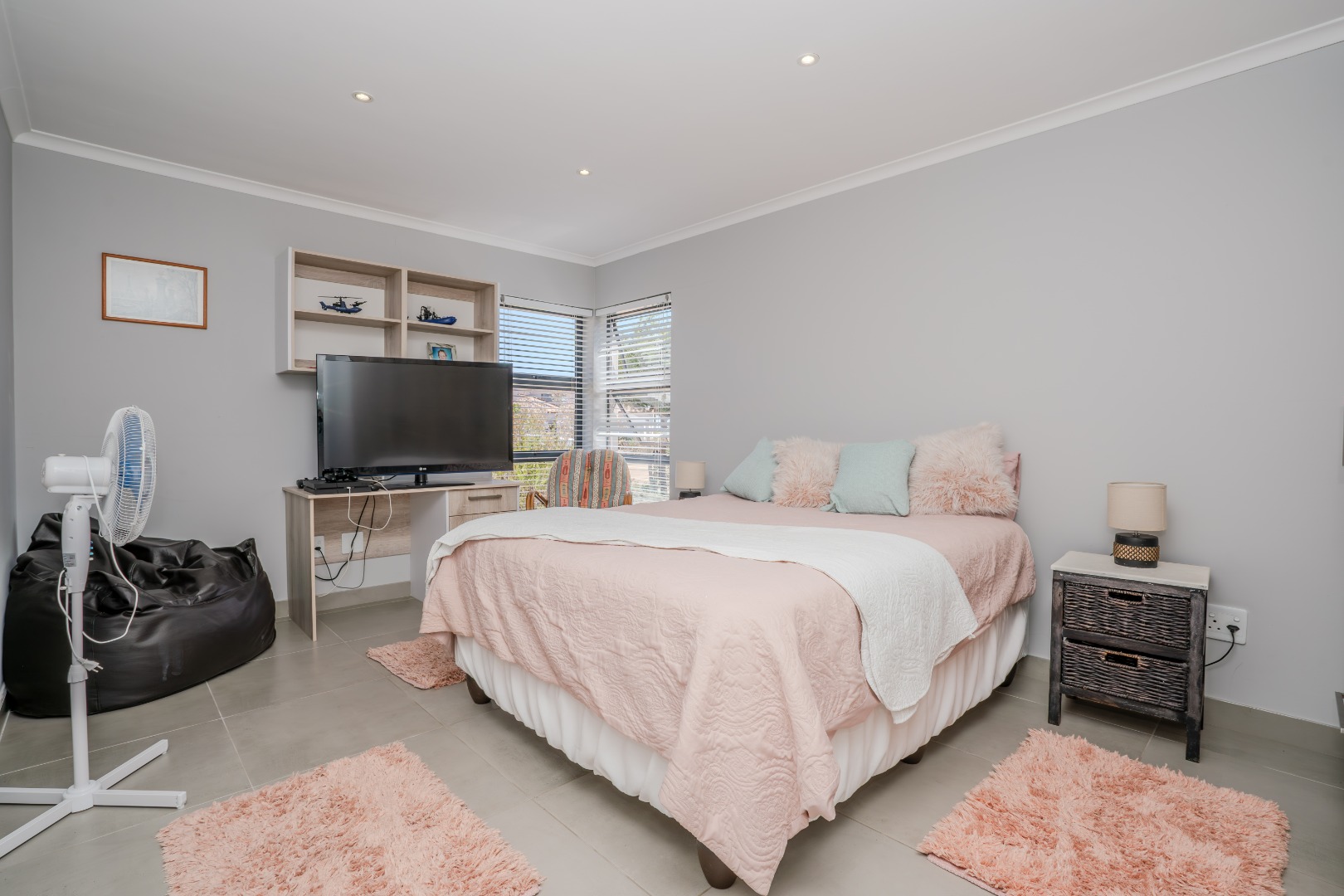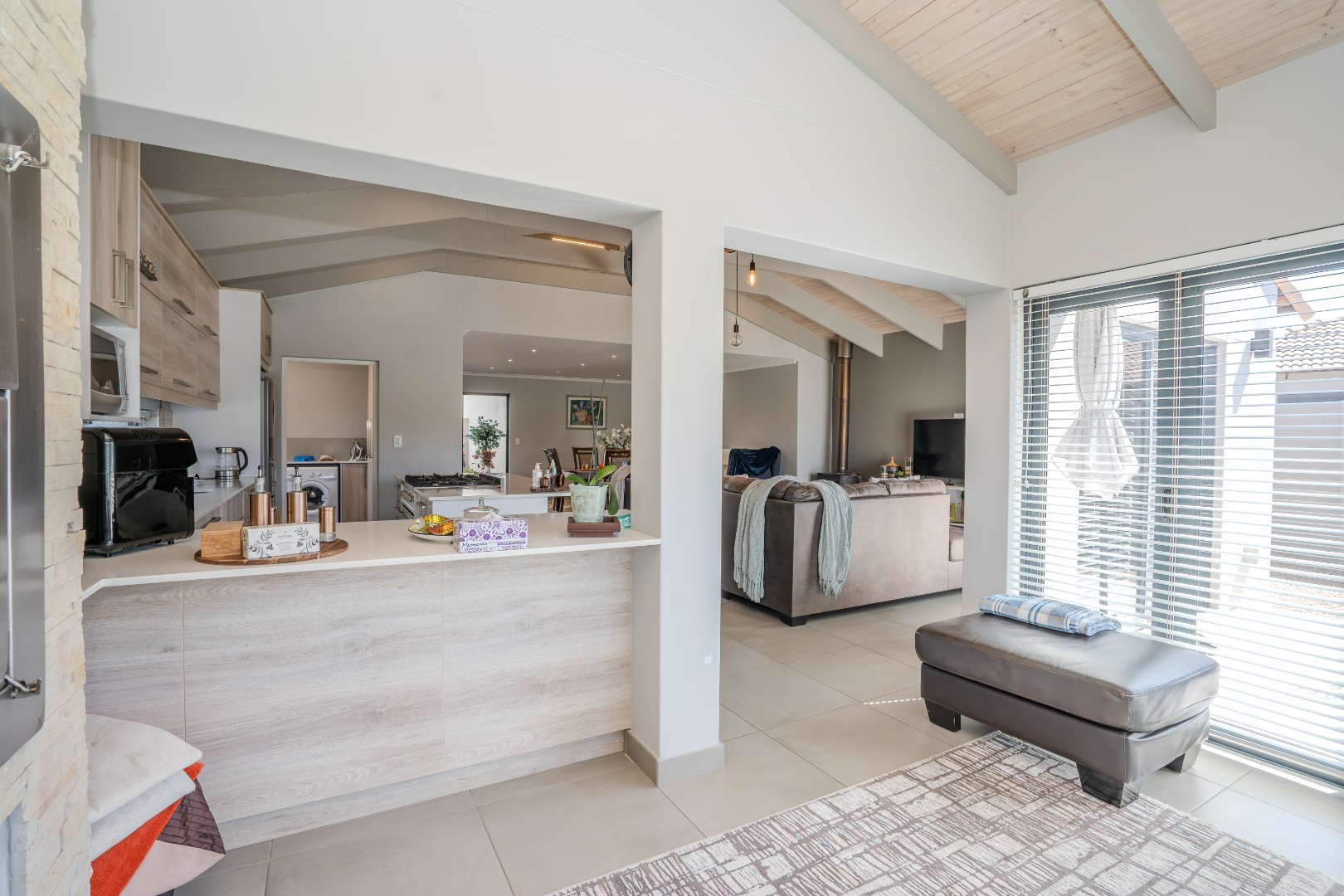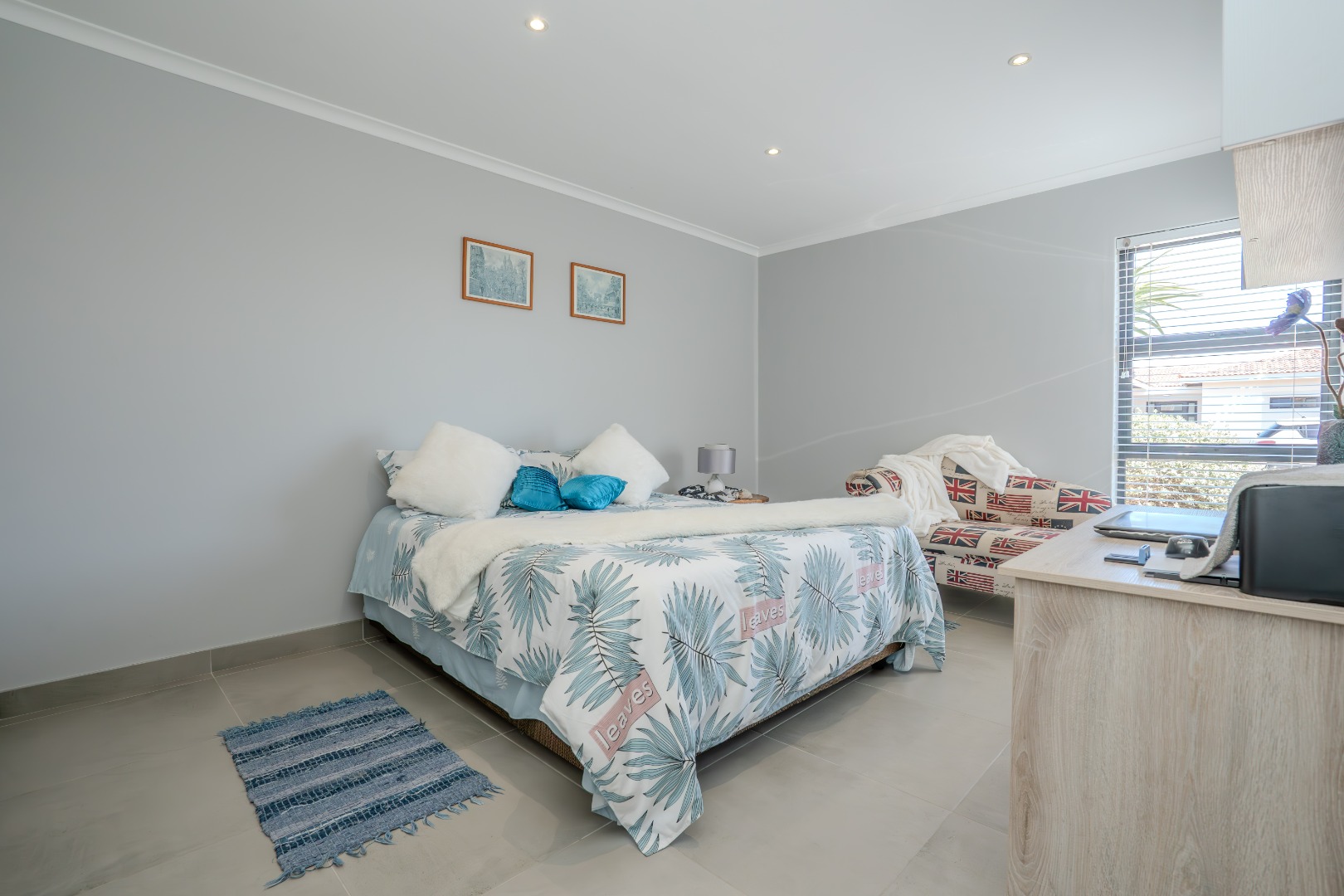 All three bedrooms are positioned in the north wing, each with built-in cupboards and there is a small study nook in between. The main bedroom is a private sanctuary, complete with a full en-suite bathroom, while the two guest bedrooms share a well-appointed family bathroom. The home is fully tiled throughout, ensuring a sleek, modern finish and easy upkeep.