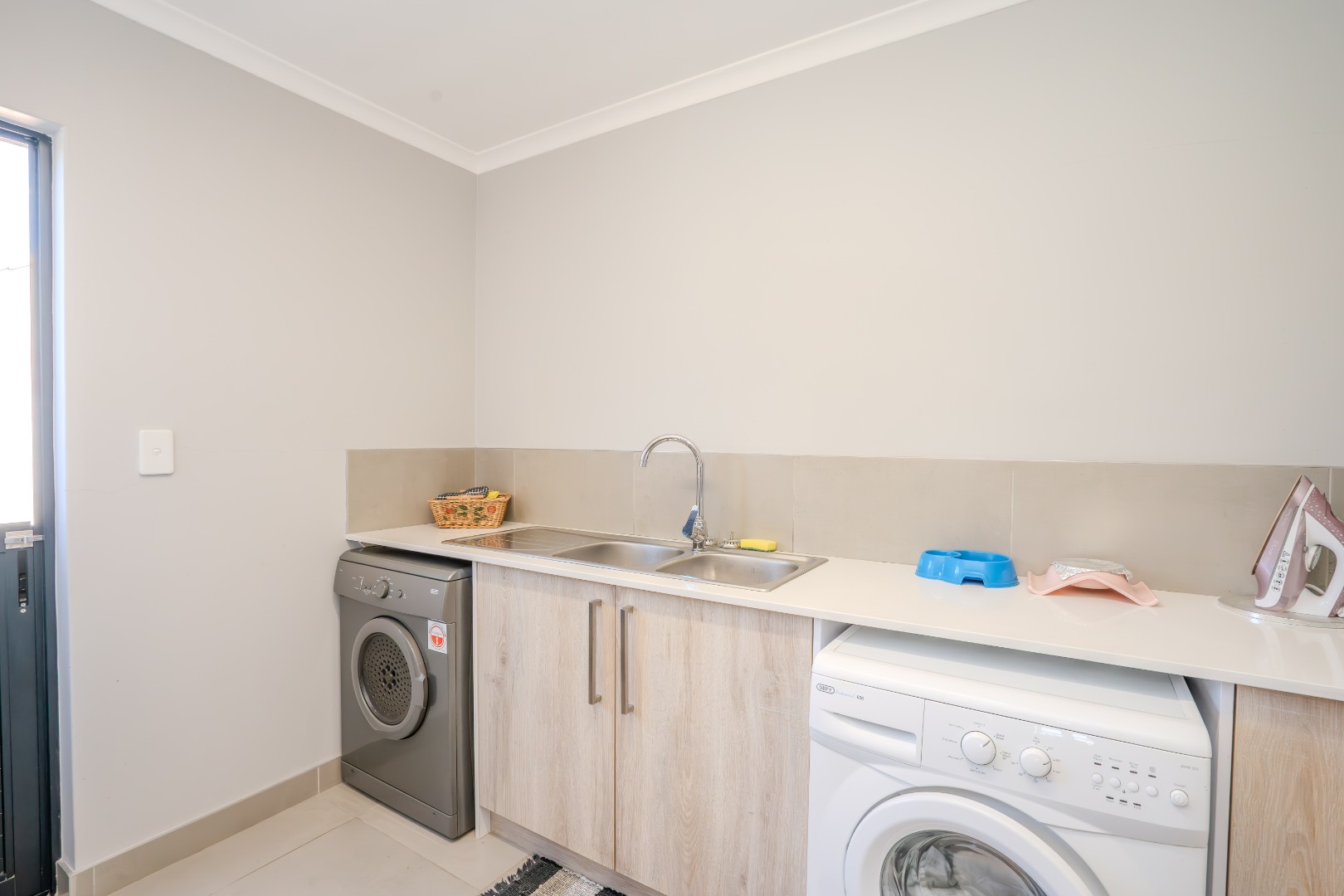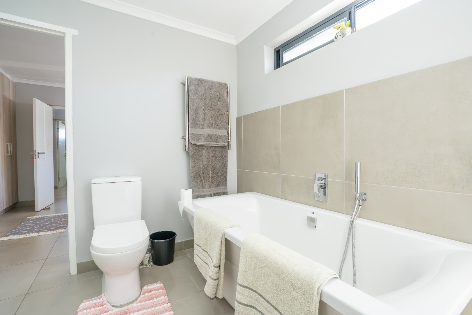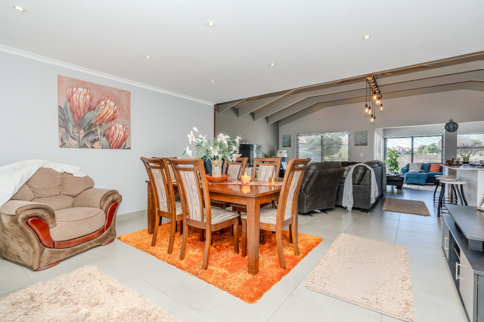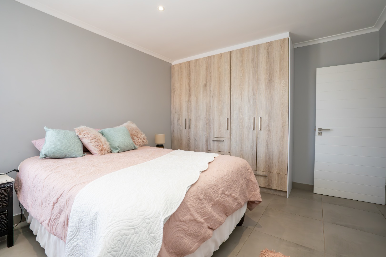 All three bedrooms are positioned in the north wing, each with built-in cupboards and there is a small study nook in between. The main bedroom is a private sanctuary, complete with a full en-suite bathroom, while the two guest bedrooms share a well-appointed family bathroom. The home is fully tiled throughout, ensuring a sleek, modern finish and easy upkeep.