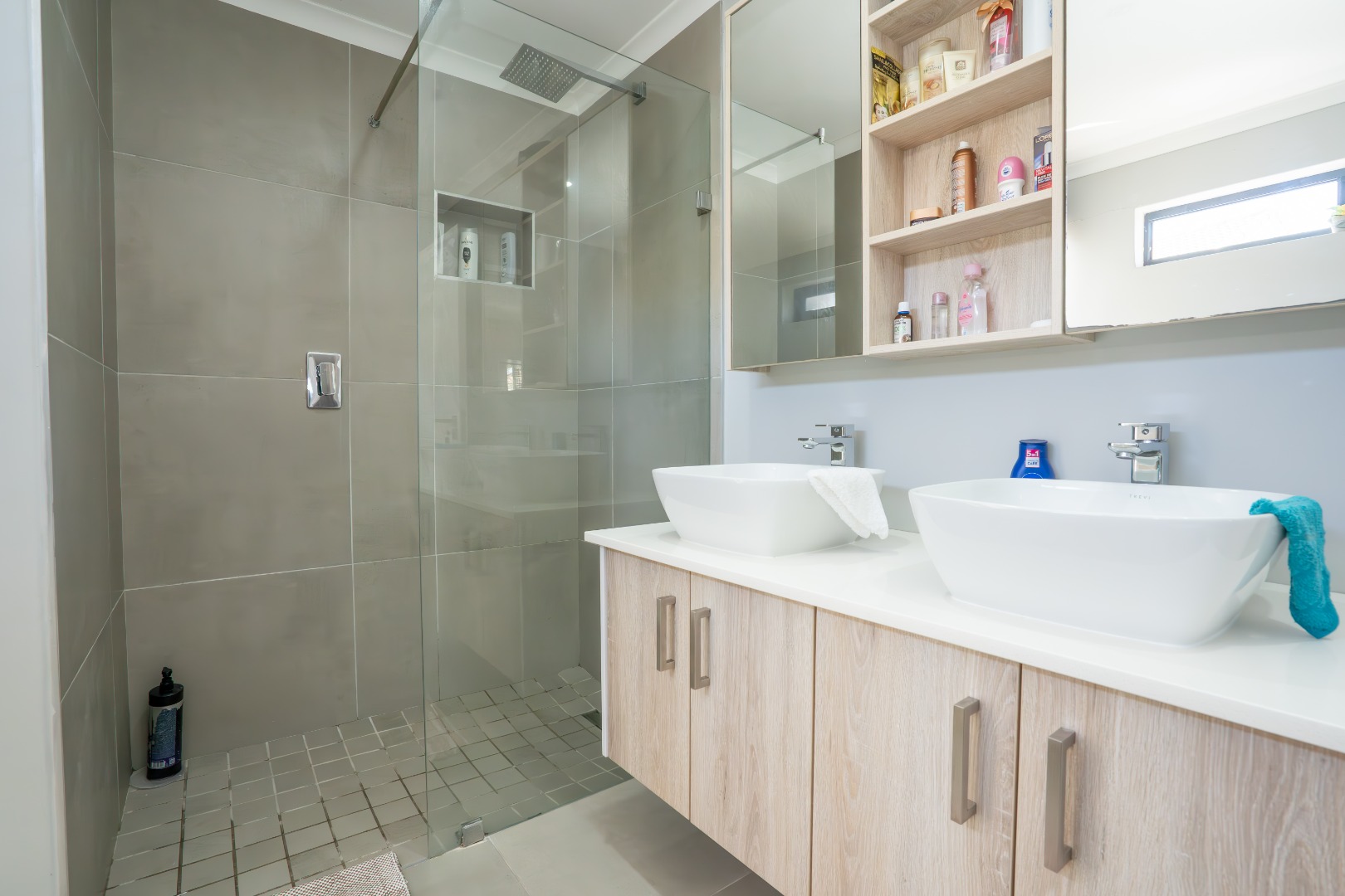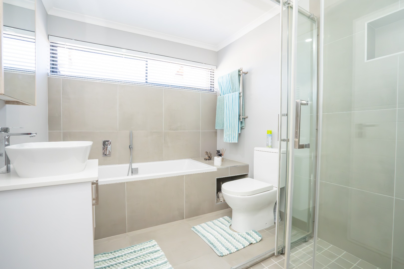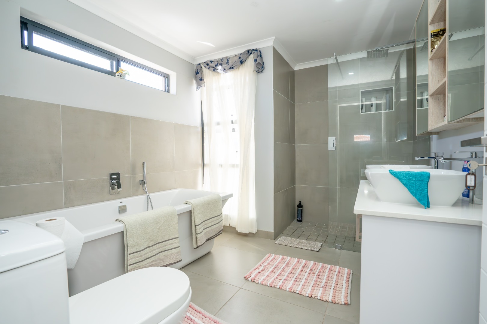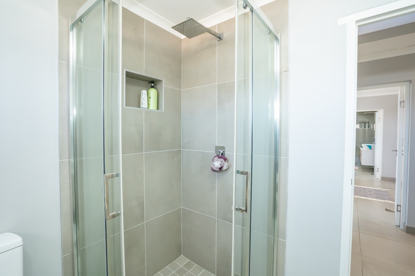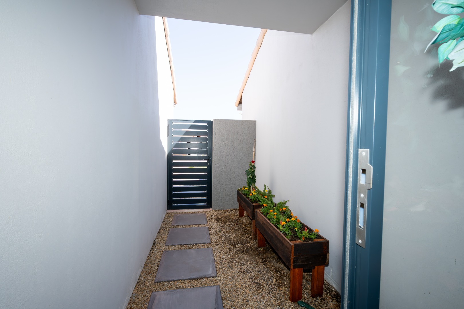 All three bedrooms are positioned in the north wing, each with built-in cupboards and there is a small study nook in between. The main bedroom is a private sanctuary, complete with a full en-suite bathroom, while the two guest bedrooms share a well-appointed family bathroom. The home is fully tiled throughout, ensuring a sleek, modern finish and easy upkeep.