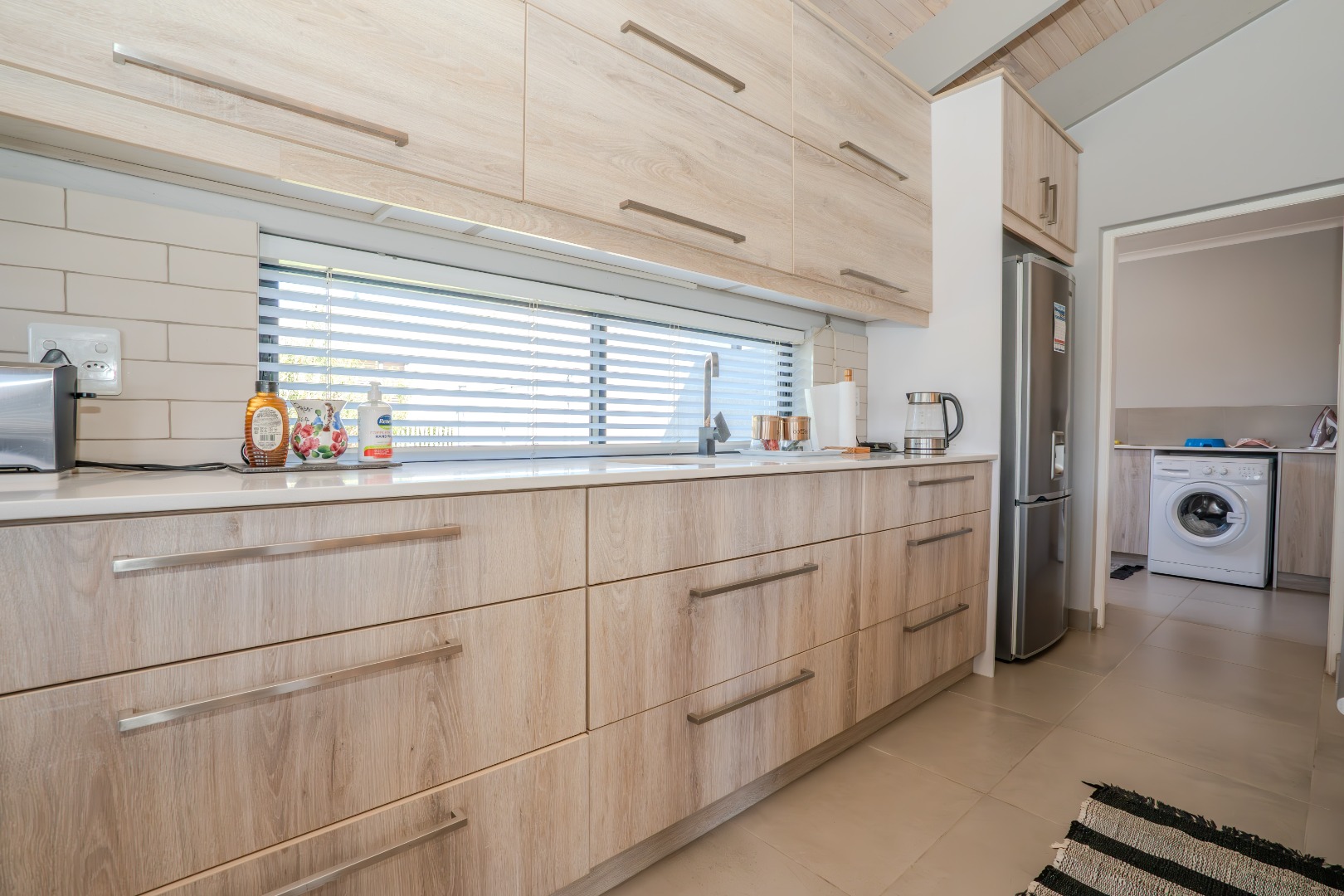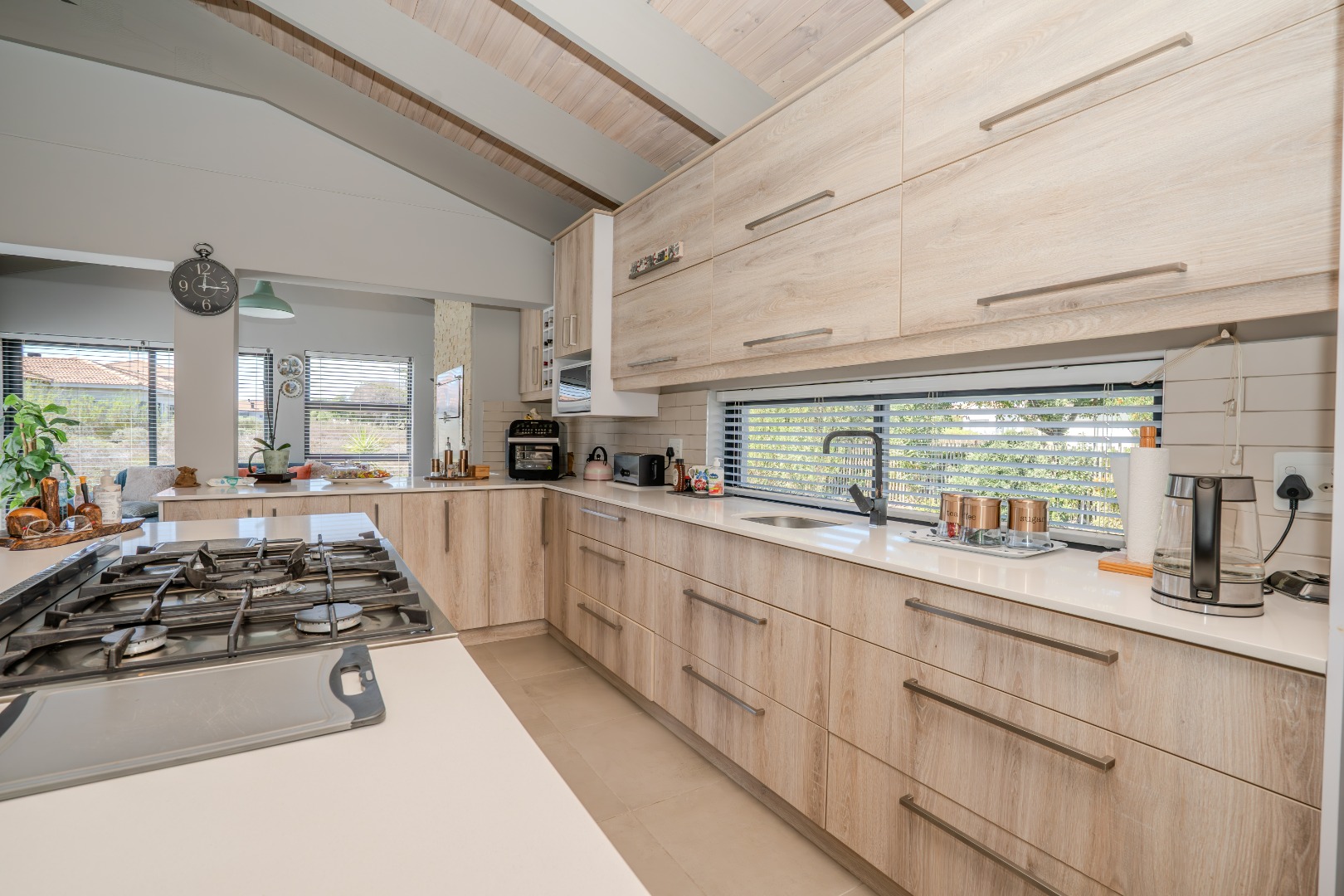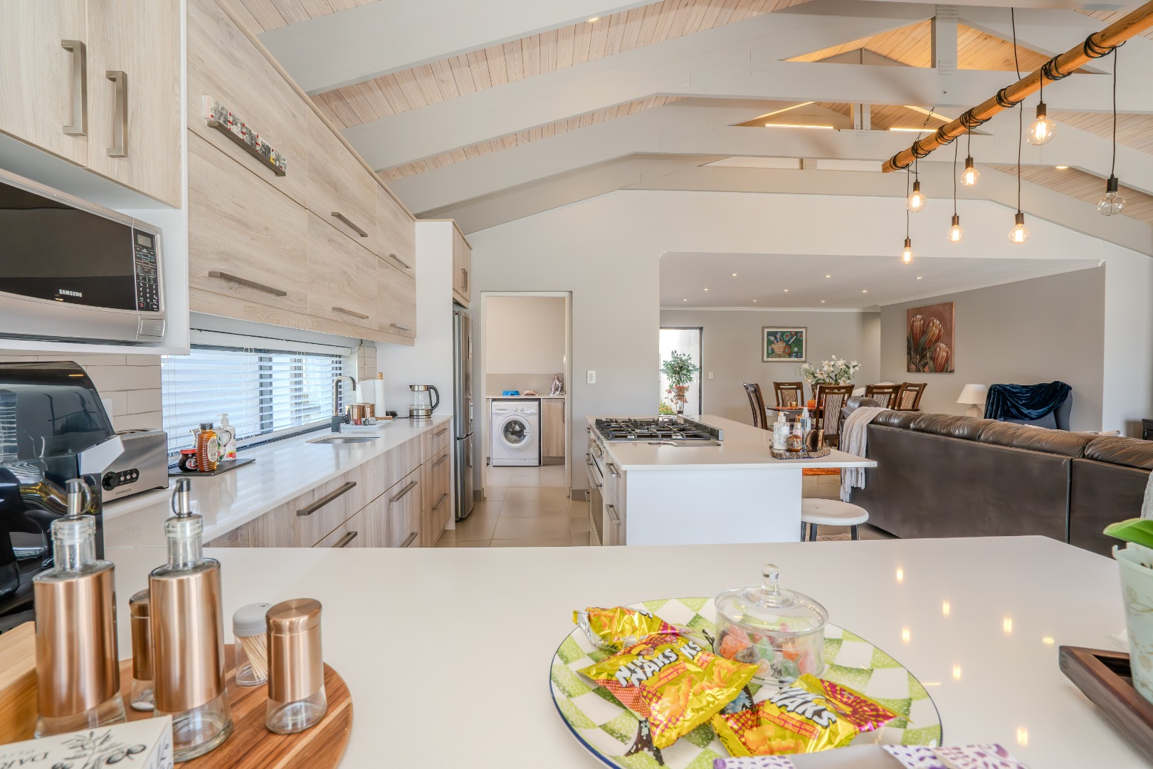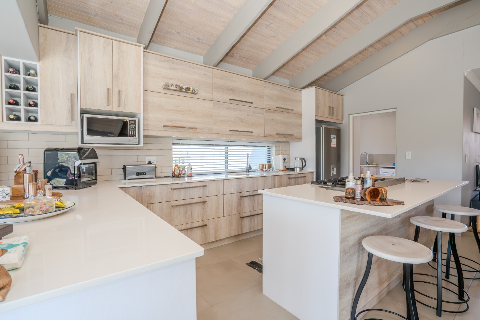 The open-plan kitchen is a chef’s delight, featuring a gas hob, a large electric oven, sleek Caesarstone countertops and a spacious centre island that doubles as a breakfast nook. Ample built-in cupboards provide generous storage, while a separate scullery offers dedicated space for a dishwasher and washing machine leading to the private drying courtyard.