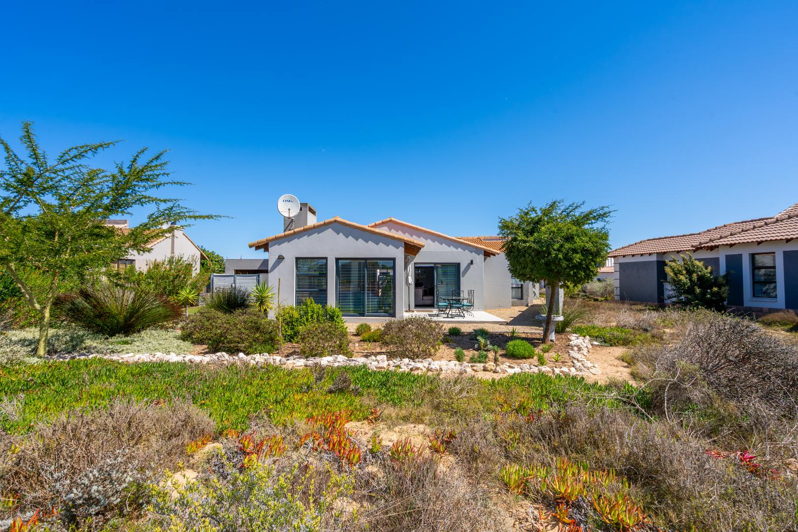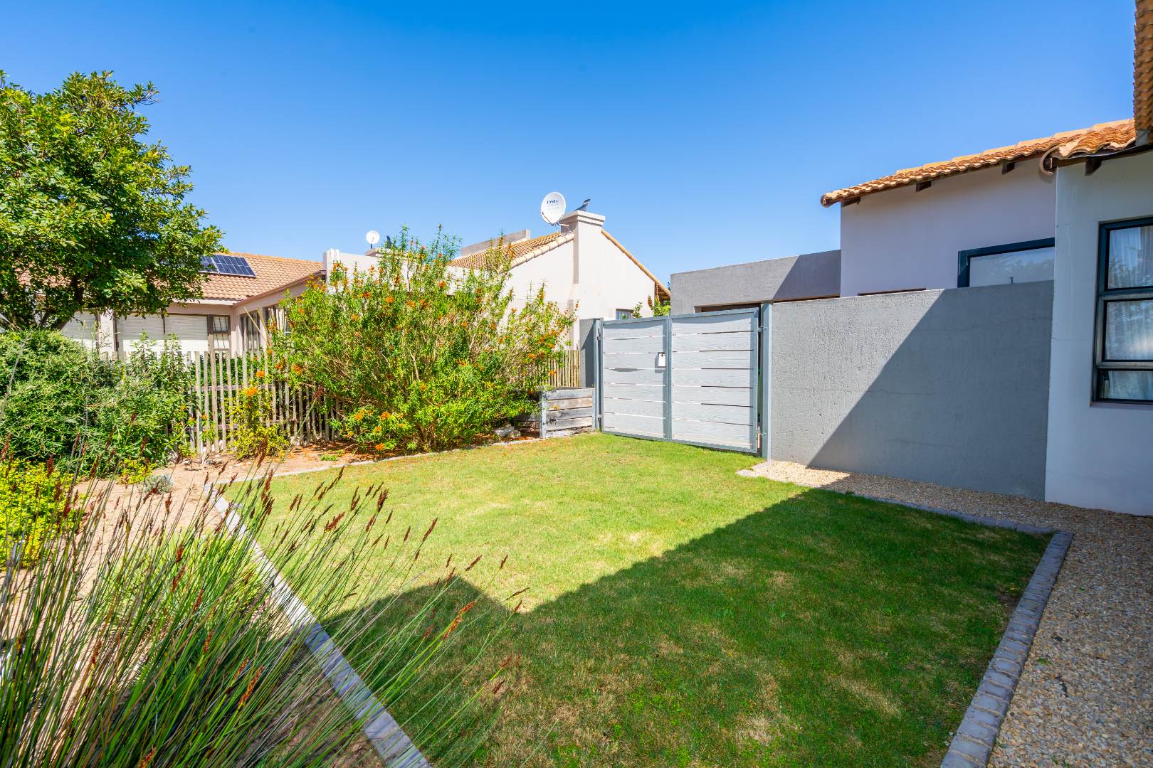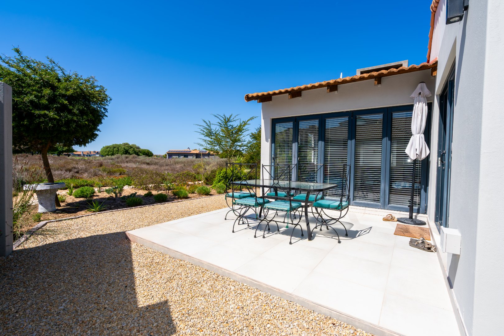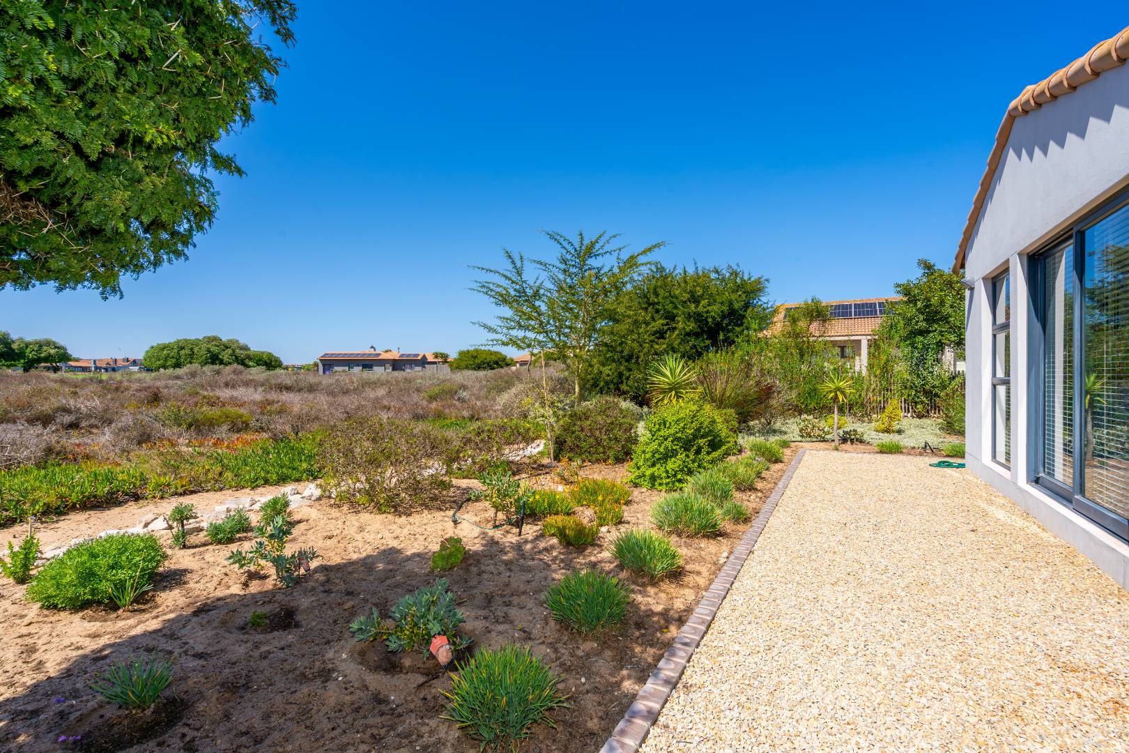 Designed for seamless indoor-outdoor living, the enclosed built-in braai area opens via sliding doors to a low-maintenance indigenous garden. Here you can unwind and soak in breathtaking views of the surrounding fynbos and the golf course.