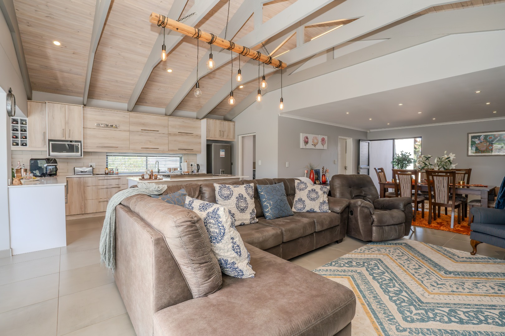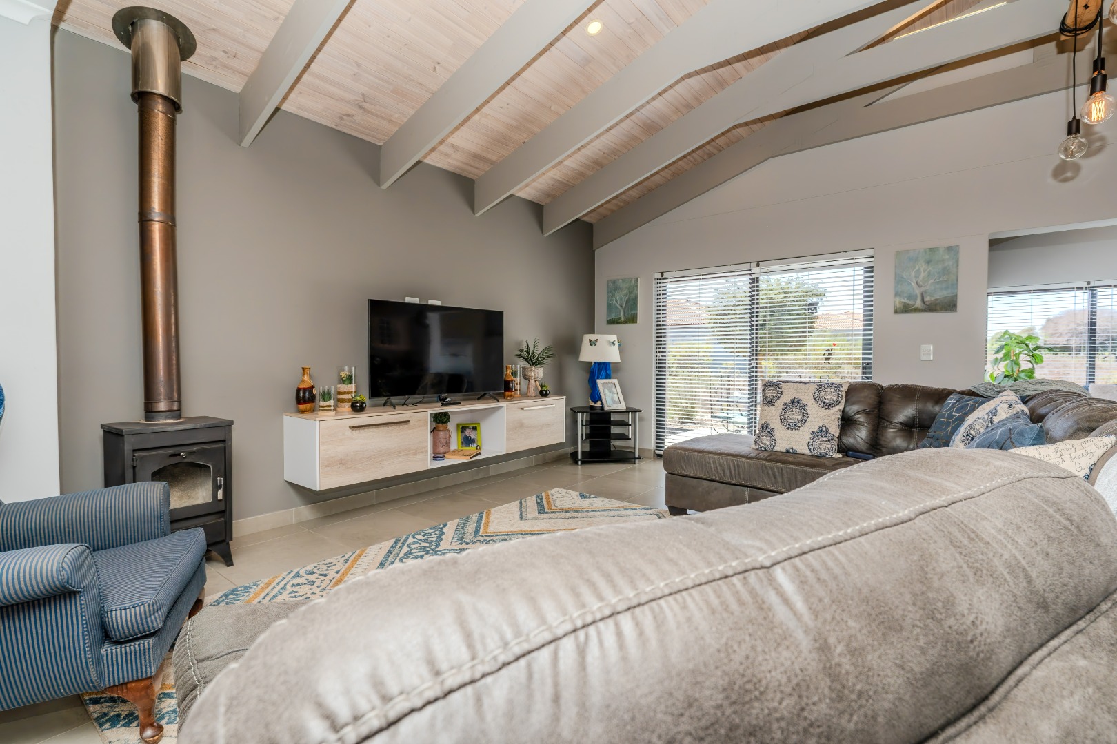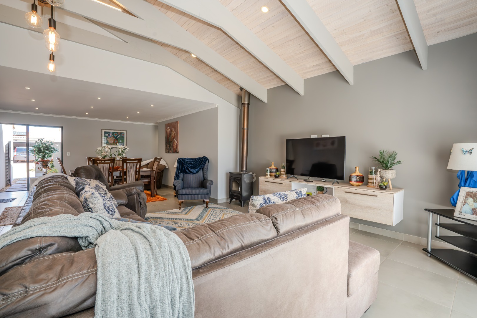 A small courtyard sets the tone as you enter, leading to a bright and airy living space where double-volume exposed roof trusses create a sense of openness. The cosy lounge, complete with a wood-burning fireplace, is the perfect retreat for chilly evenings.