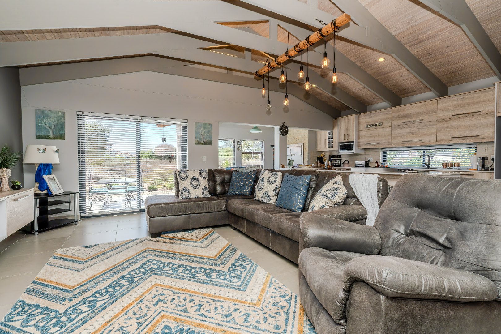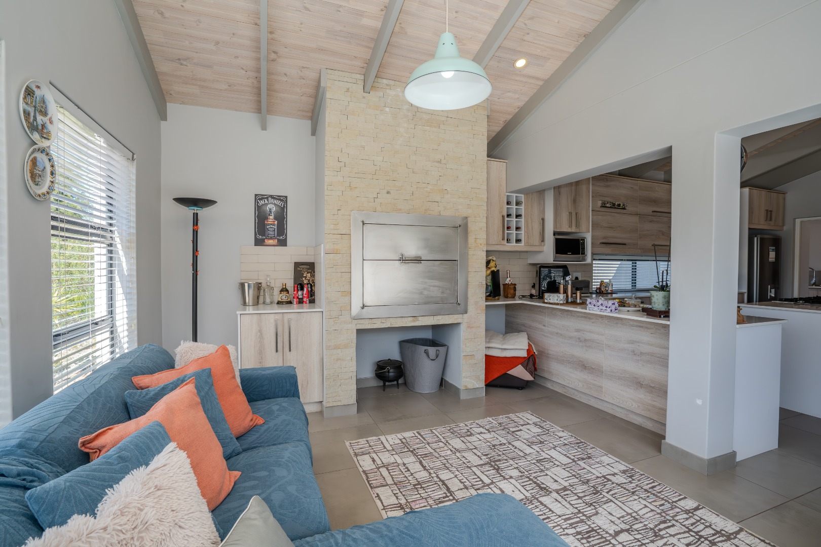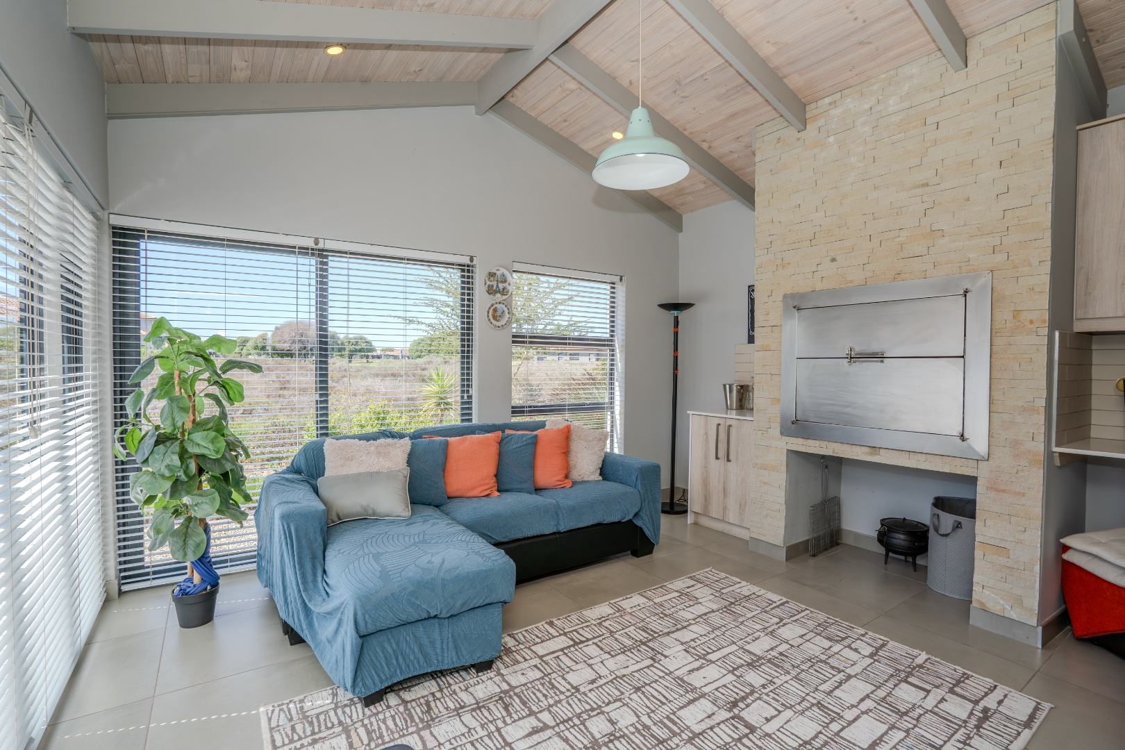 A small courtyard sets the tone as you enter, leading to a bright and airy living space where double-volume exposed roof trusses create a sense of openness. The cosy lounge, complete with a wood-burning fireplace, is the perfect retreat for chilly evenings.