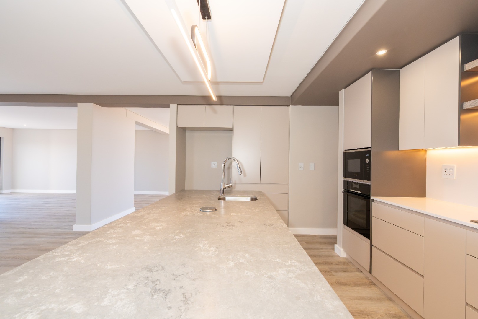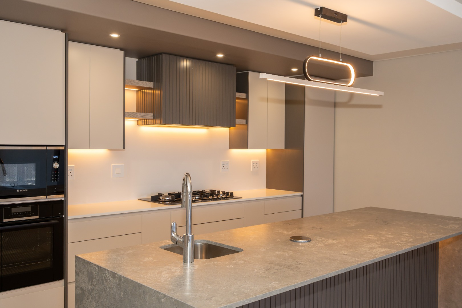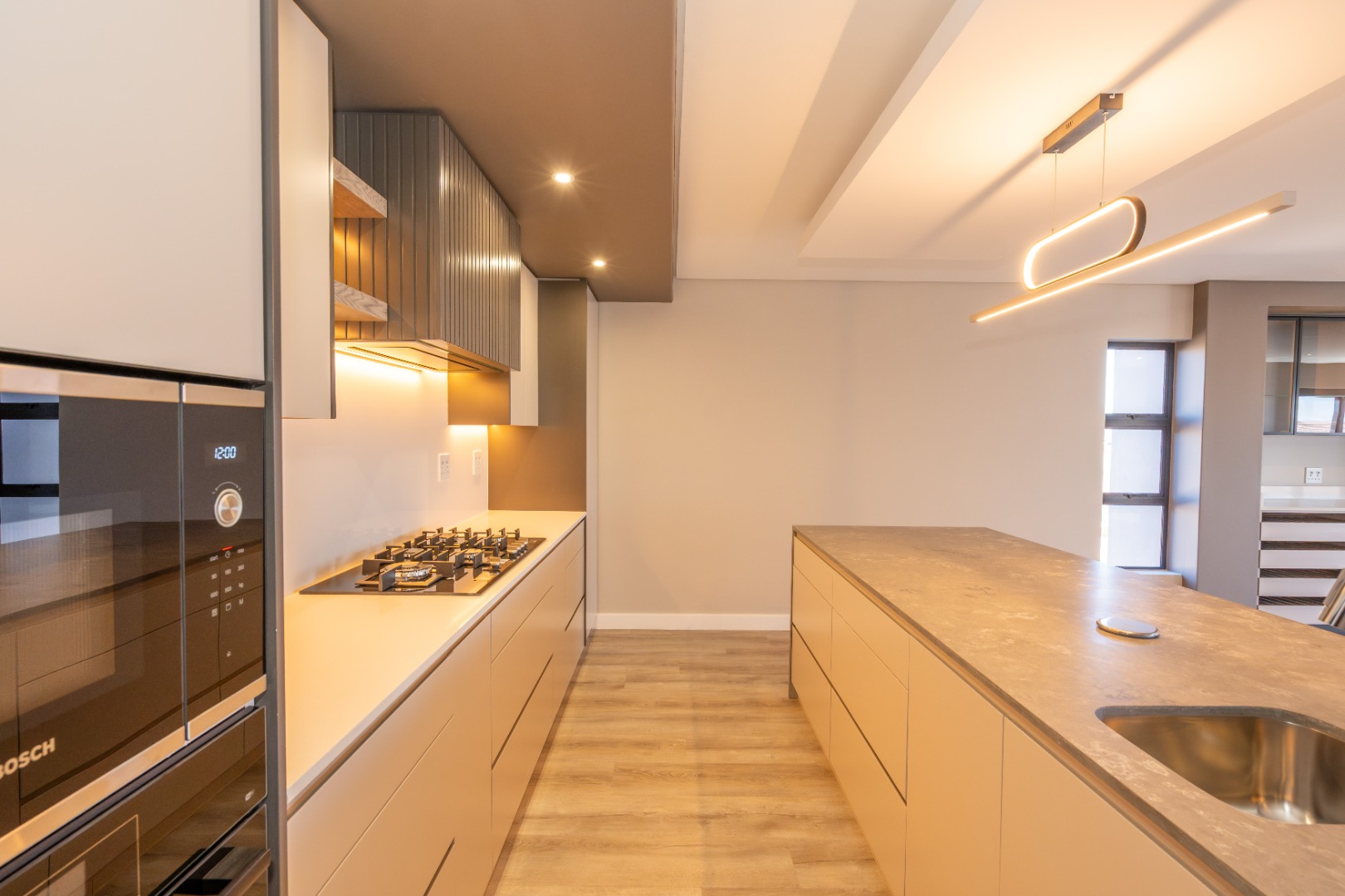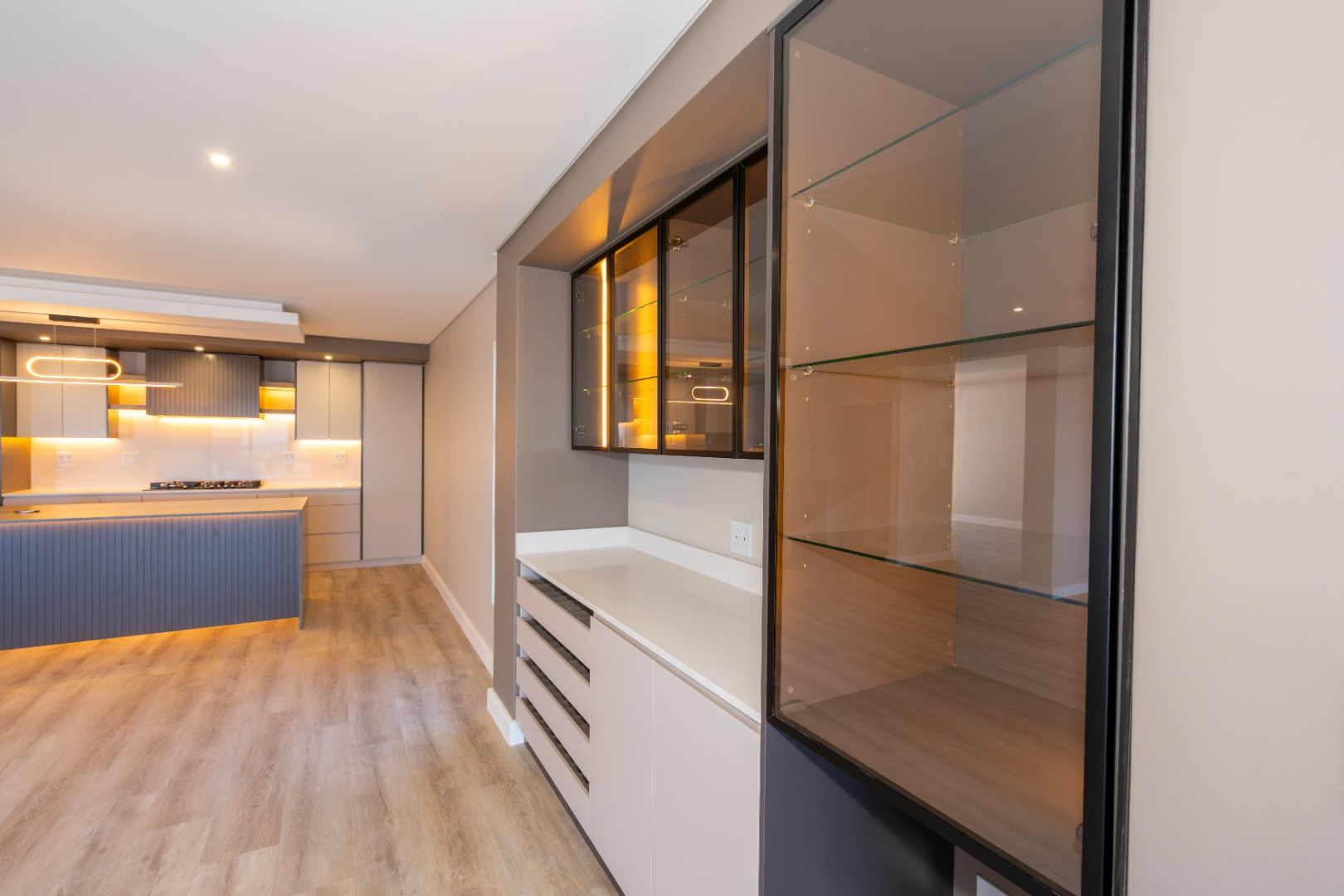 The exquisite kitchen is a true focal point, combining clean, modern design with everyday practicality. It is equipped with a Bosch electric oven, integrated microwave and air-fryer, as well as a five-plate gas hob. A separate scullery keeps the main kitchen space neat and functional, while a custom-designed wet bar with wine drawers and subtle lighting adds a sophisticated edge for entertaining. The ground floor also offers a well-appointed guest bedroom with its own en-suite bathroom, along with a conveniently located guest toilet.