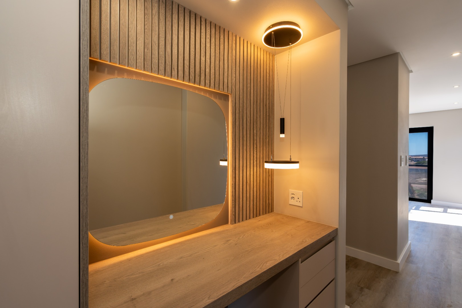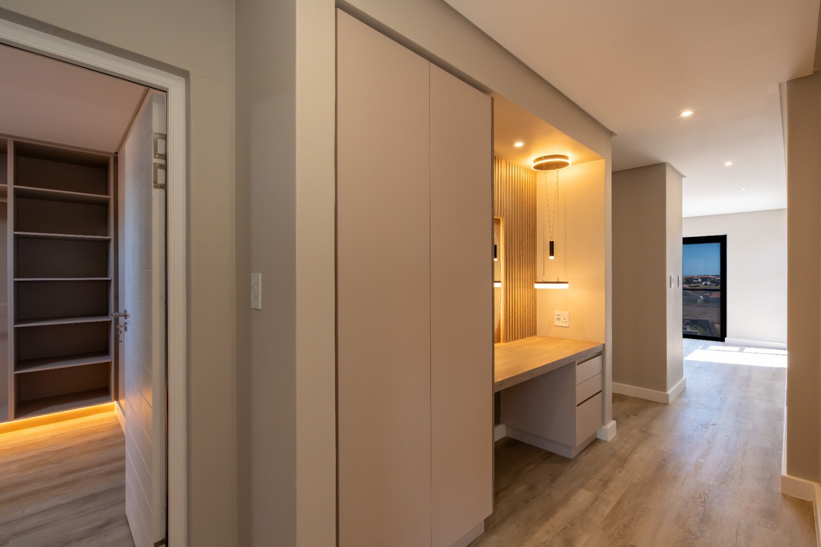 Upstairs, the home continues to impress with two spacious en-suite bedrooms. The main suite is a private retreat, complete with a massive walk-in dressing room and a beautifully finished bathroom. A cosy pajama lounge opens onto a balcony where lagoon and estate views can be enjoyed, creating a peaceful space to unwind. A dedicated workstation with a built-in coffee station provides a practical and stylish work-from-home solution.
