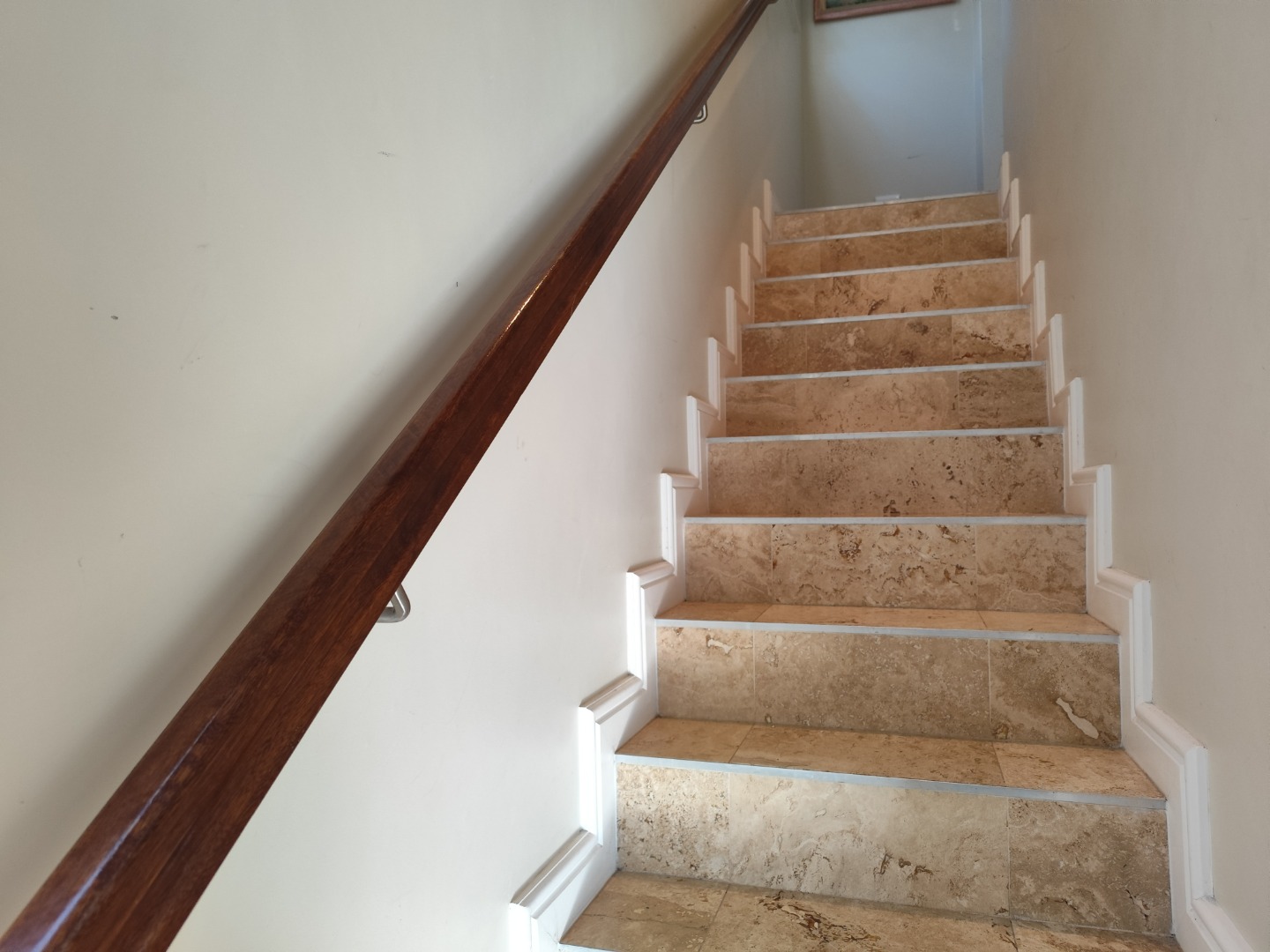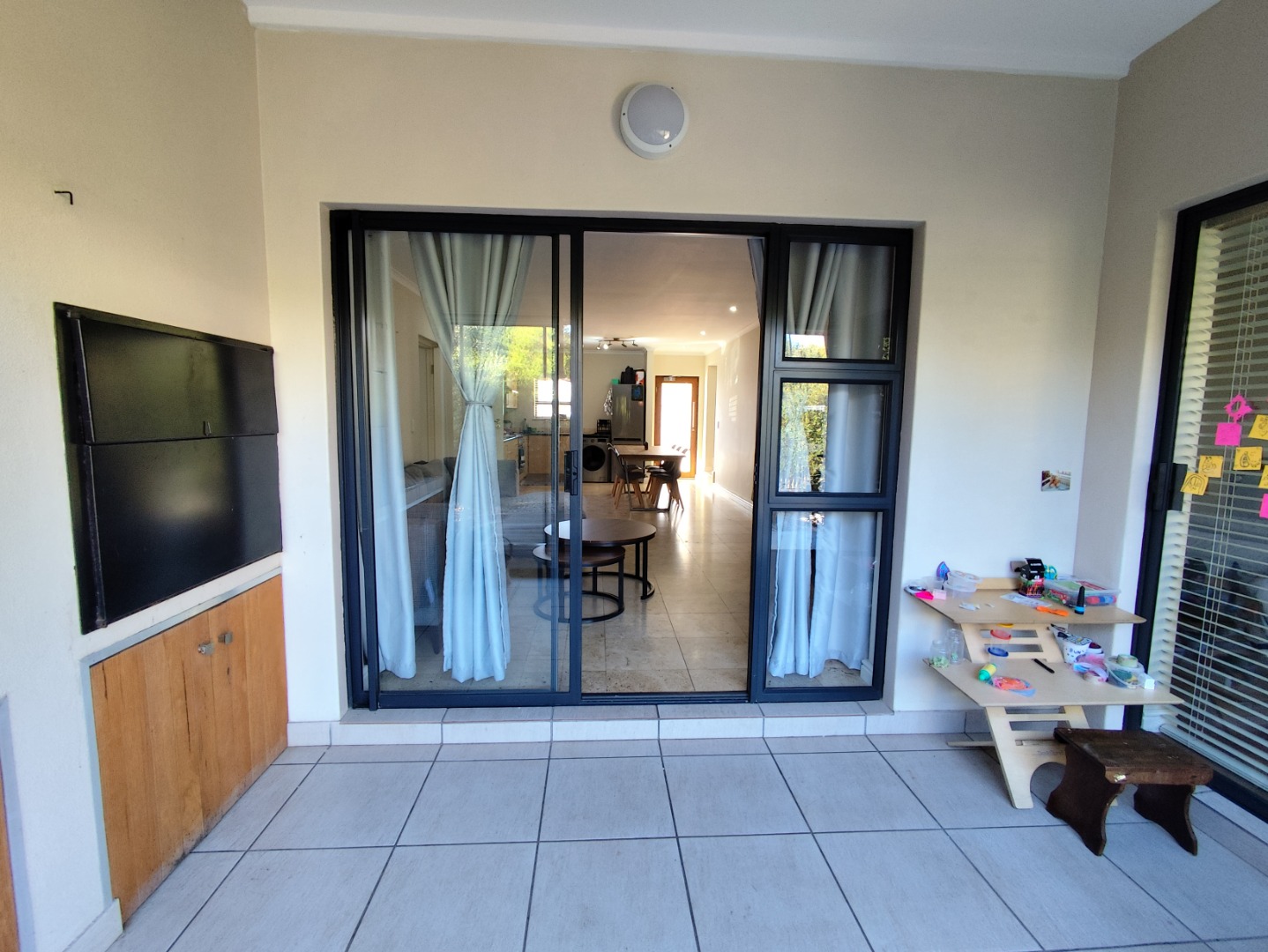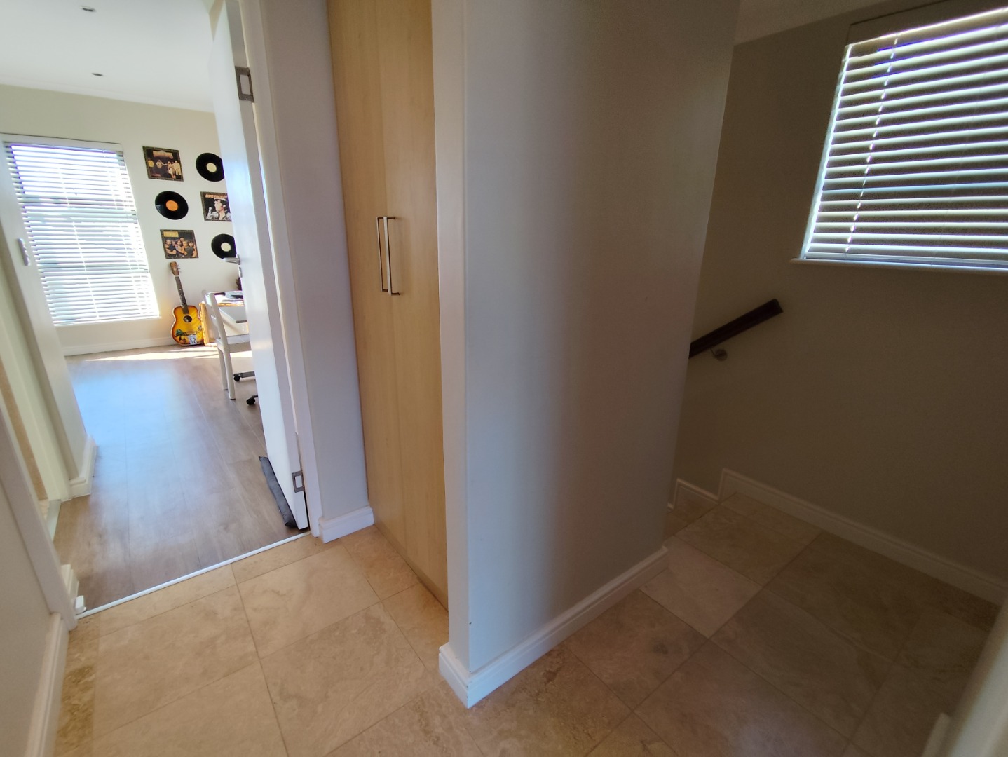 The ground floor offers a stylish modern kitchen with granite countertops, gas hob, extractor fan, electric oven and ample built-in cupboards. The open plan lounge and dining area, finished with elegant travertine tiles, flows seamlessly into an enclosed braai room, perfect for entertaining and leading out to a beautifully landscaped garden.