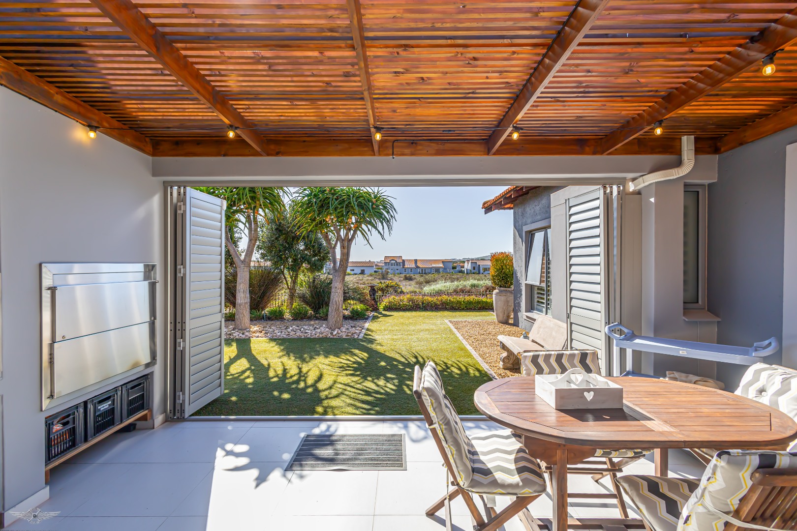 The separate flatlet wing includes a bedroom, bathroom, lounge, kitchenette, and its own undercover deck with a built-in stainless steel braai, ideal for visitors, family or rental income.