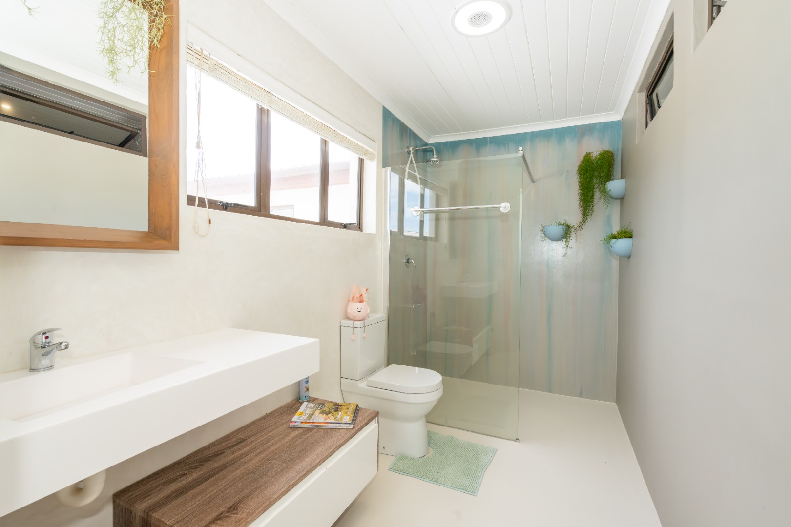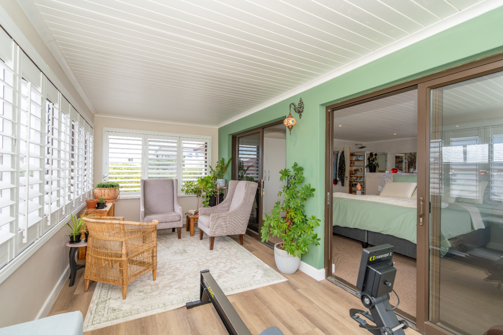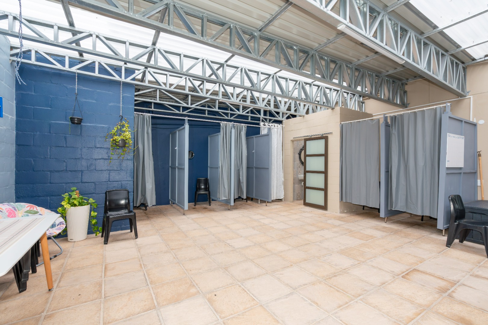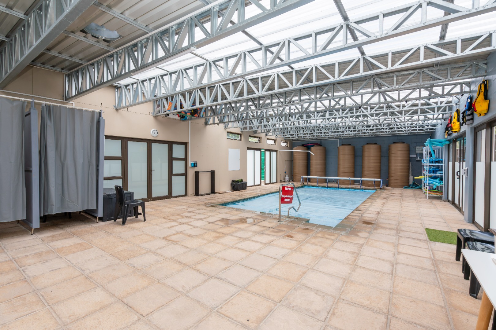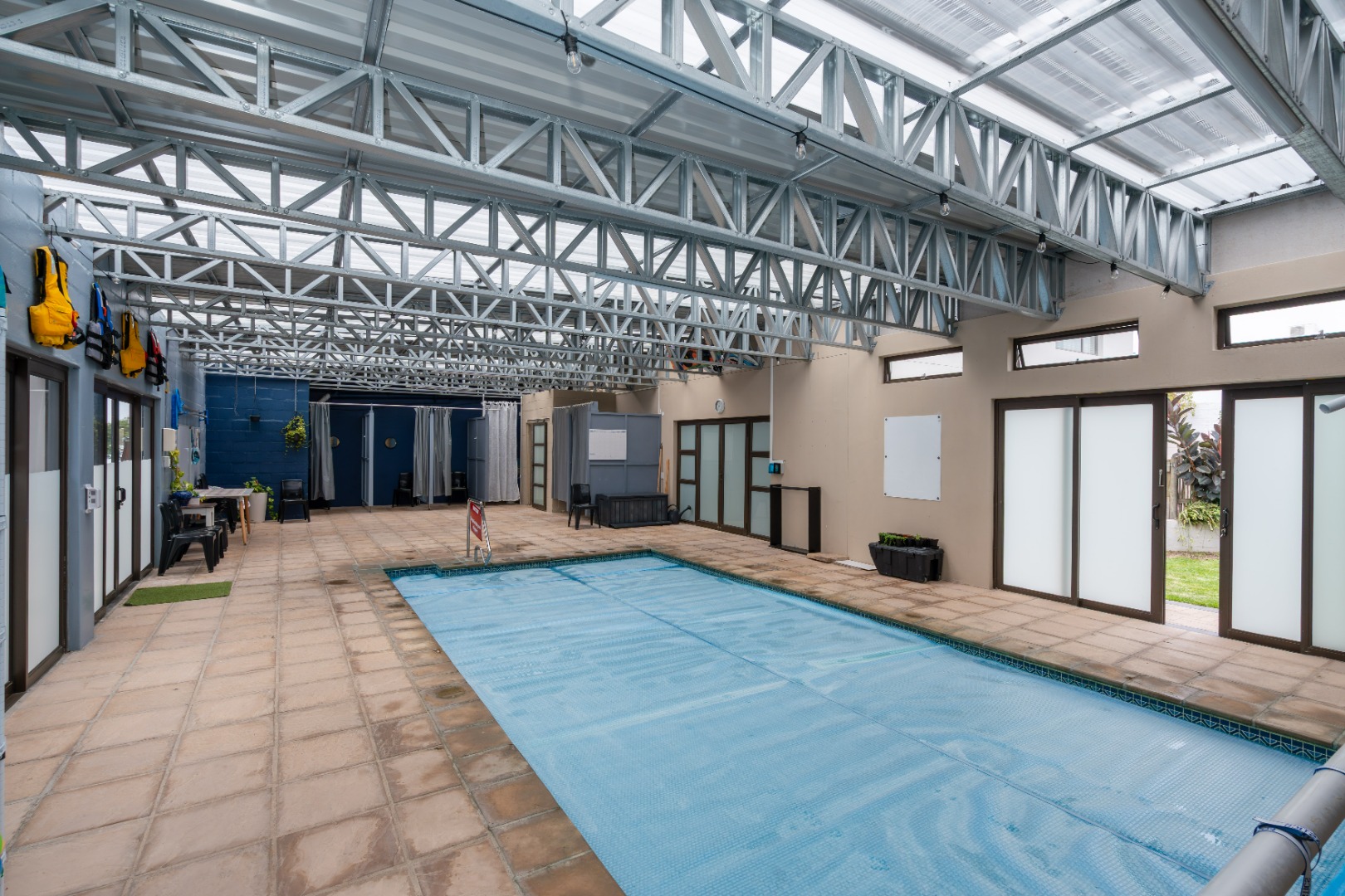 Downstairs, the main entrance leads into a cosy lounge, flowing through to an open-plan dining area and modern kitchen with separate scullery and laundry. The kitchen is well-appointed with a SMEG gas hob and electric oven. This living space extends to an indoor built-in braai, ideal for year-round entertaining, and opens onto a large enclosed pool area. The heat pump and solar heated swimming pool (7.6m x 3.6m plus 55,000L) is complemented by change rooms and a guest toilet. This area is currently operated via an app as a business facility, generating additional income from aqua aerobics, children’s swimming lessons and physiotherapy sessions.