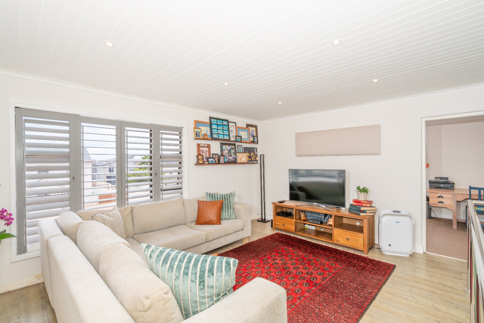 The upper level is dedicated to accommodation and relaxation, featuring four generously sized en-suite bedrooms. The luxurious main bedroom enjoys beautiful lagoon views, an enclosed balcony with American shutter blinds, as well as an open balcony, perfect for soaking up the views. A pyjama lounge / TV room completes the upstairs living area, creating a comfortable family retreat.