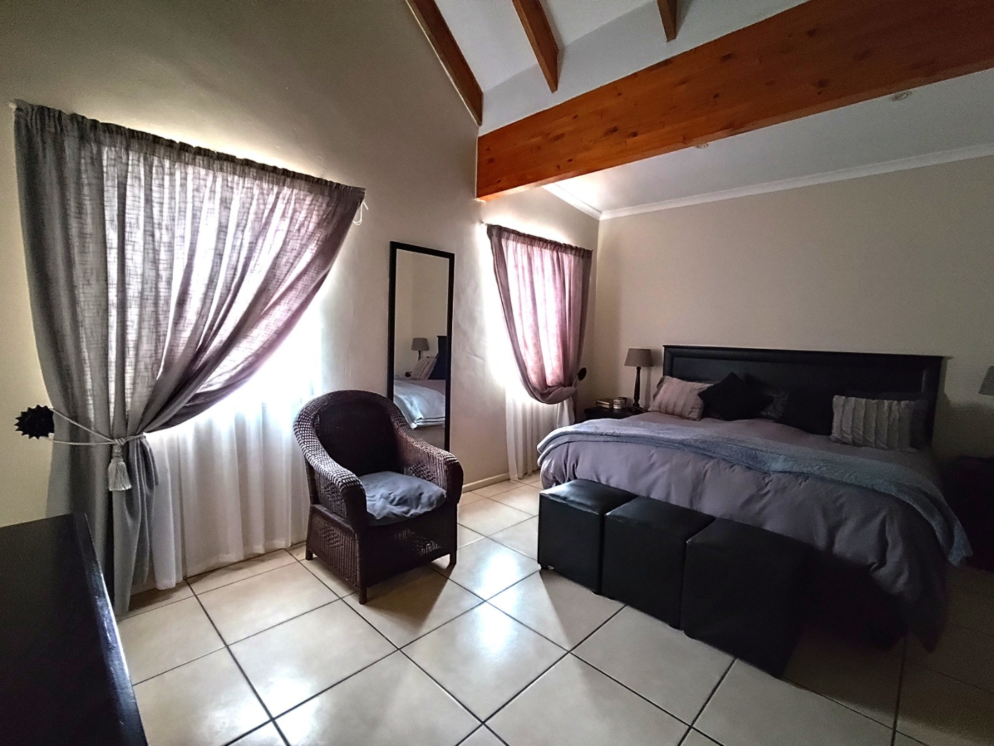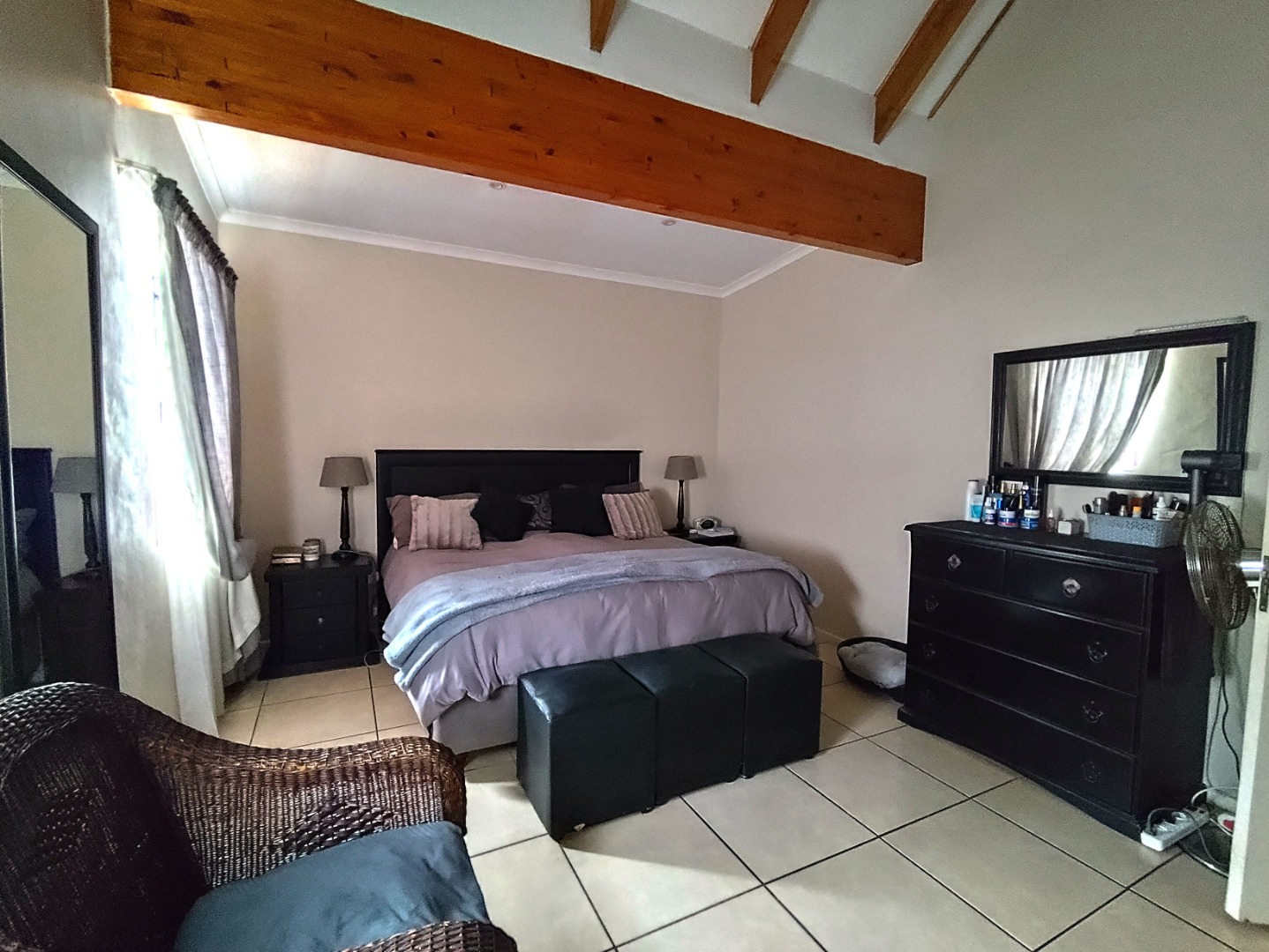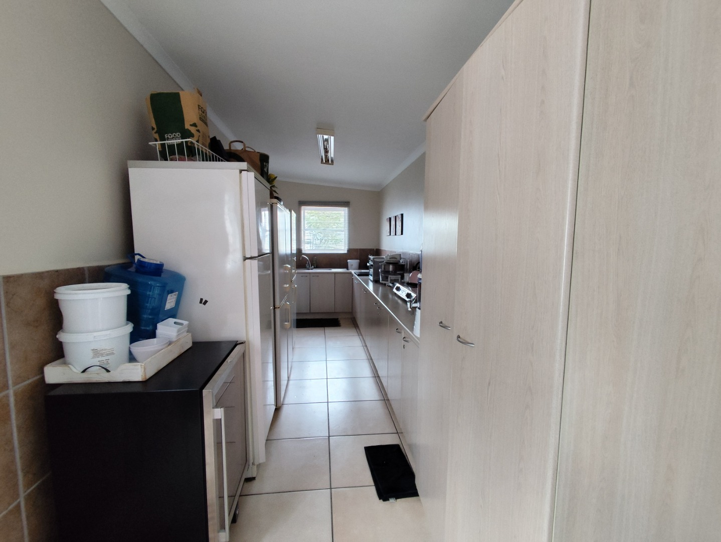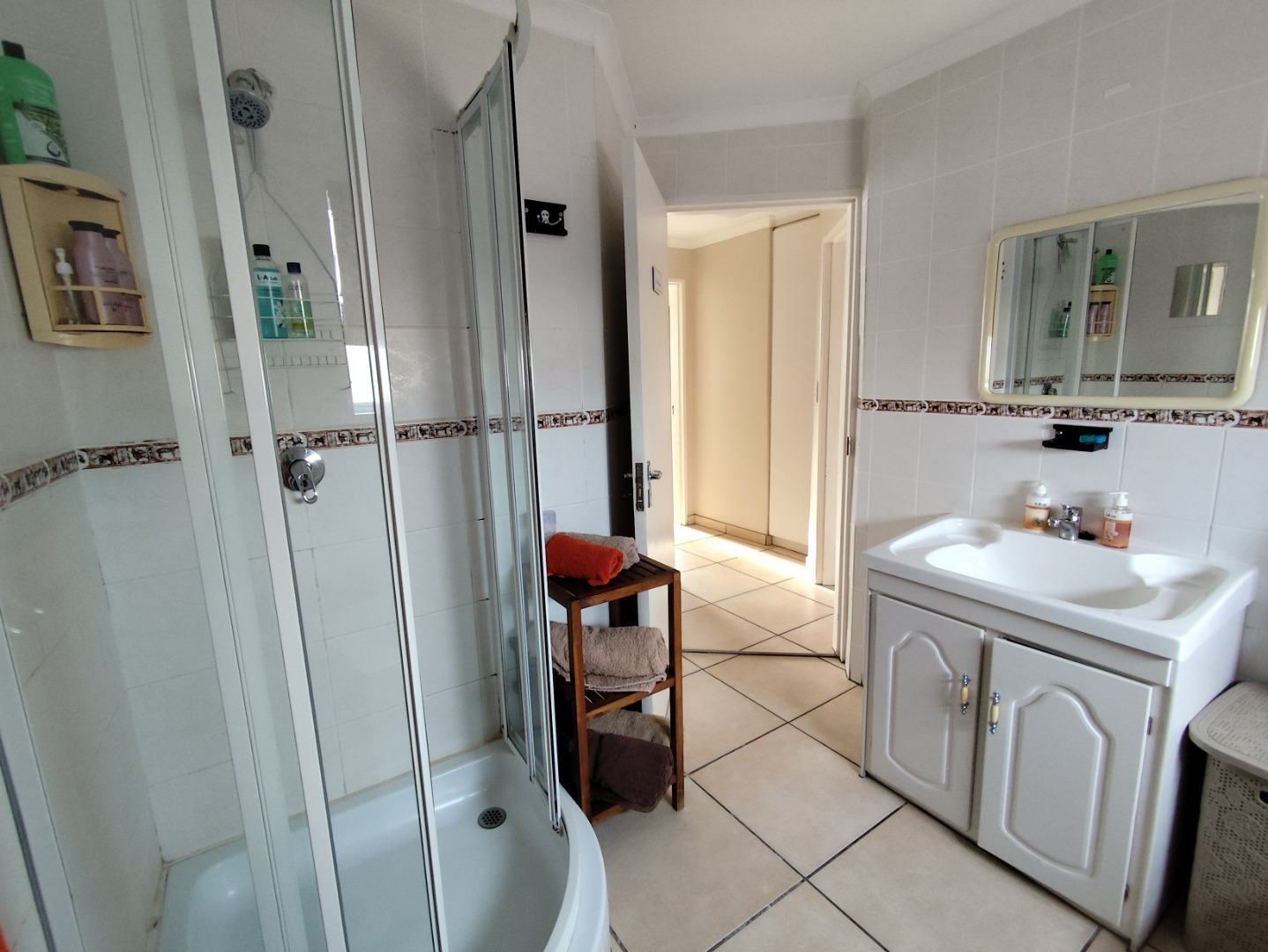 The kitchen offers ample cupboard space, an electric stove and hob and a long scullery with additional storage and a laundry area tucked at the far end. Three well-appointed bedrooms provide comfortable accommodation, with the main bedroom boasting a full en-suite bathroom and plenty of space, while the remaining bedrooms, both with built-in cupboards, share a second full bathroom.