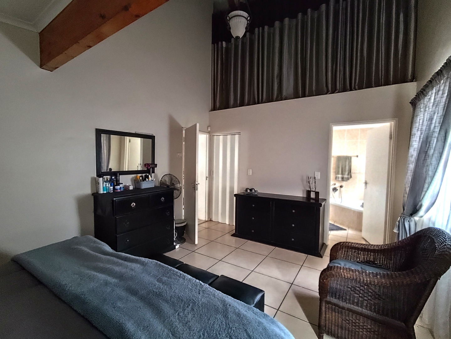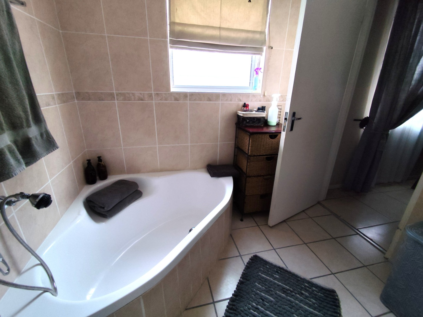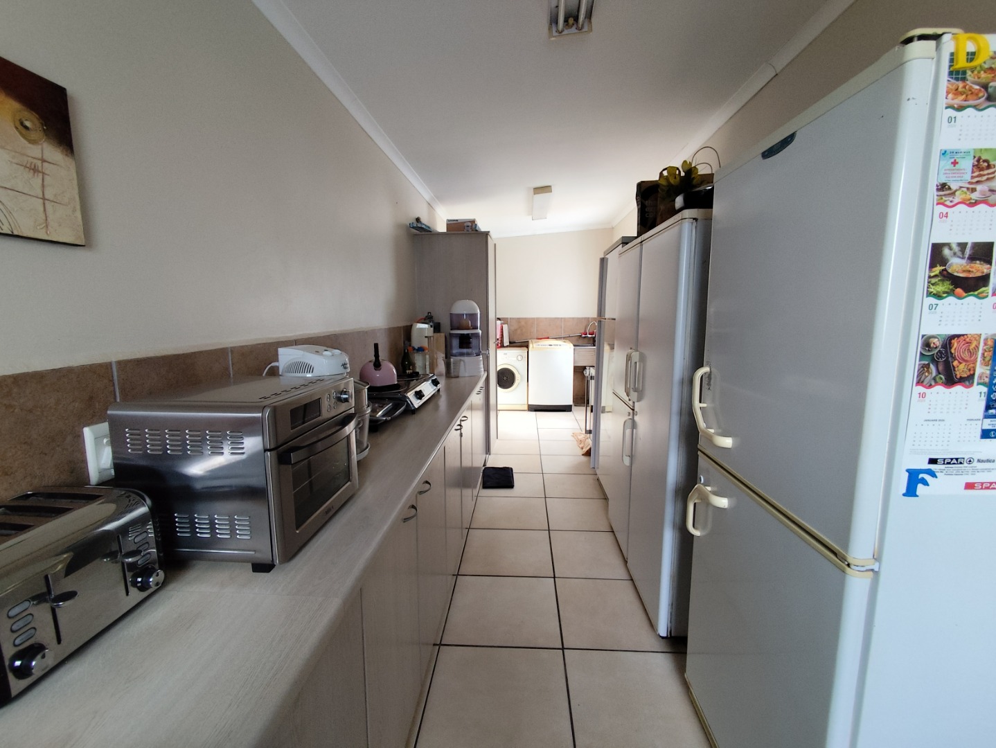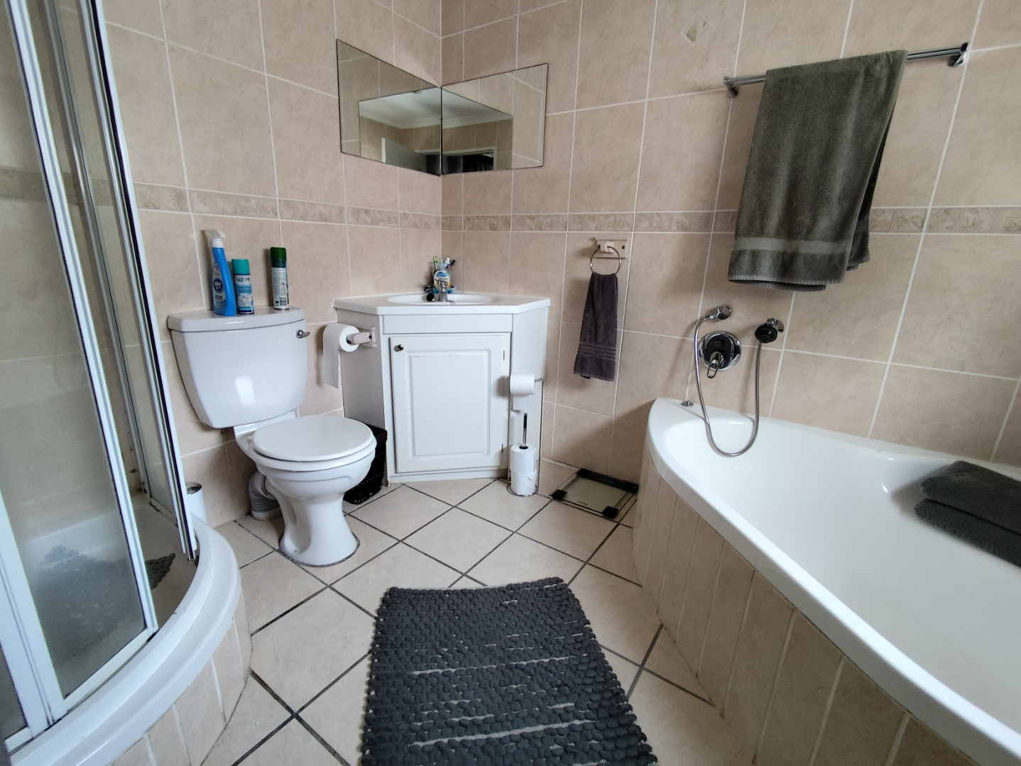 The kitchen offers ample cupboard space, an electric stove and hob and a long scullery with additional storage and a laundry area tucked at the far end. Three well-appointed bedrooms provide comfortable accommodation, with the main bedroom boasting a full en-suite bathroom and plenty of space, while the remaining bedrooms, both with built-in cupboards, share a second full bathroom.