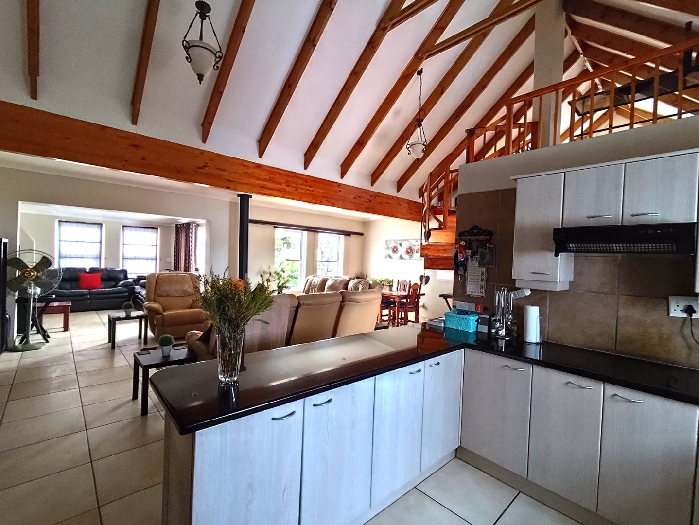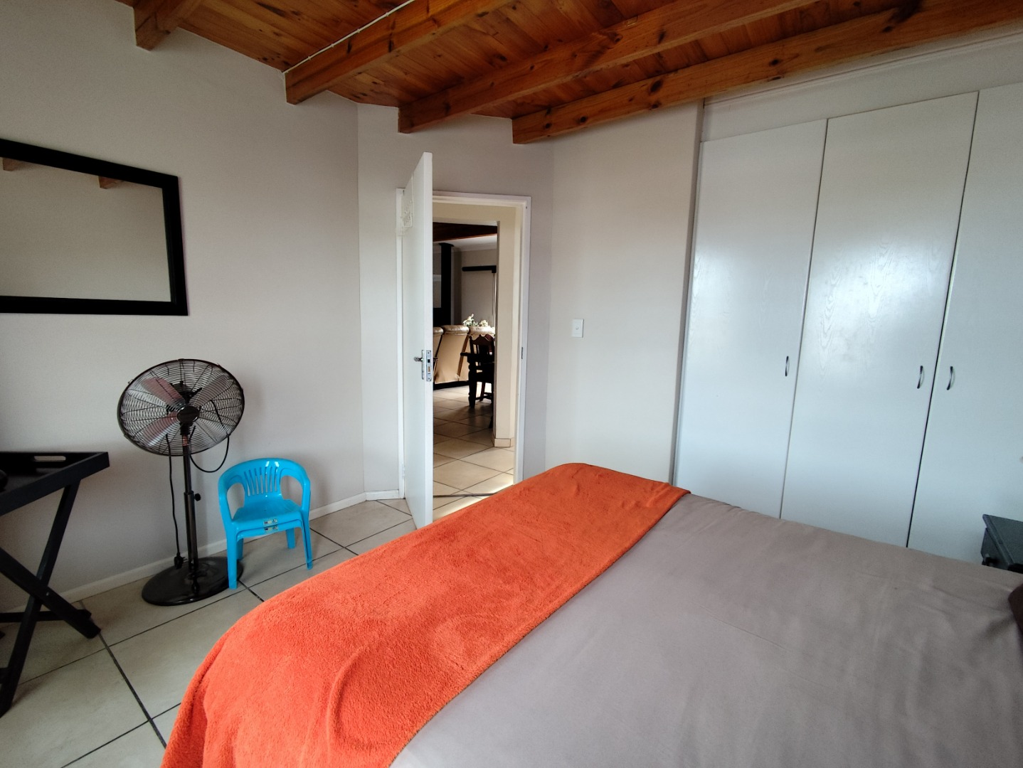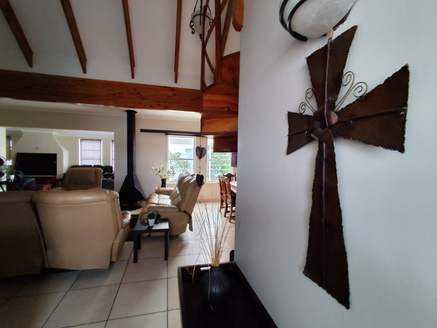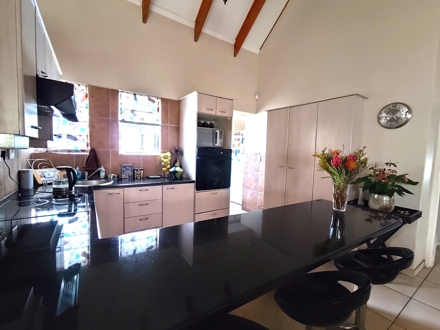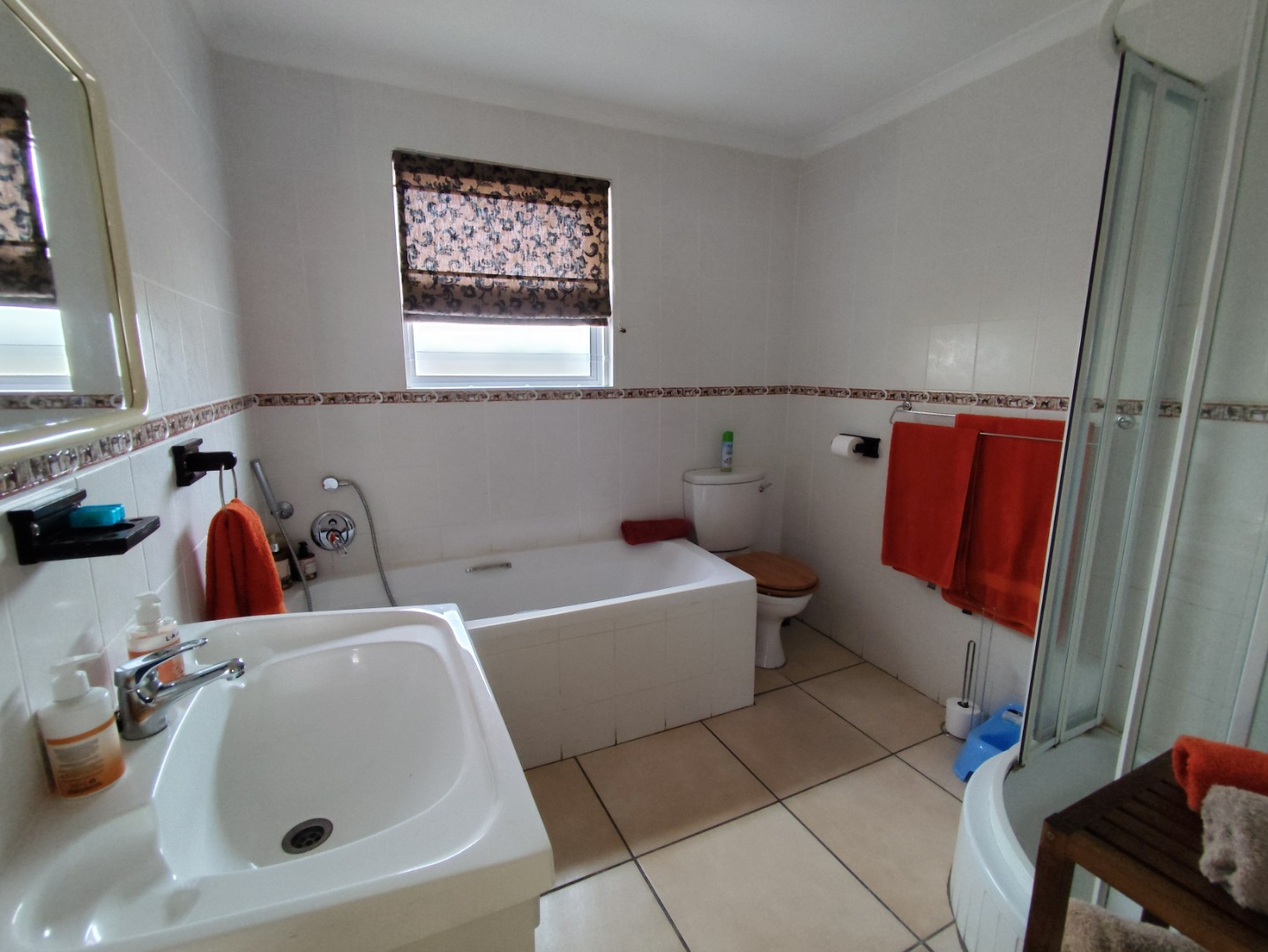 The kitchen offers ample cupboard space, an electric stove and hob and a long scullery with additional storage and a laundry area tucked at the far end. Three well-appointed bedrooms provide comfortable accommodation, with the main bedroom boasting a full en-suite bathroom and plenty of space, while the remaining bedrooms, both with built-in cupboards, share a second full bathroom.