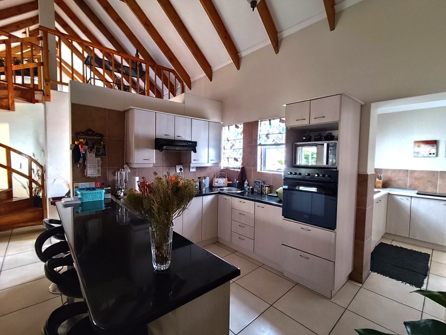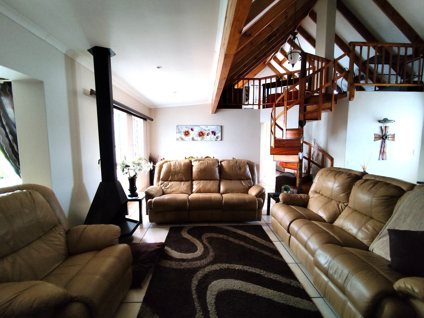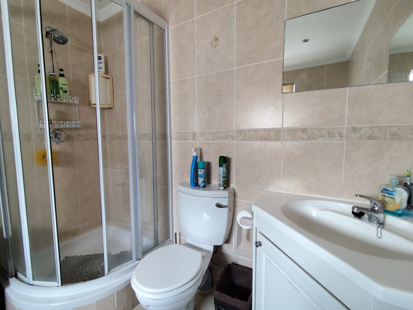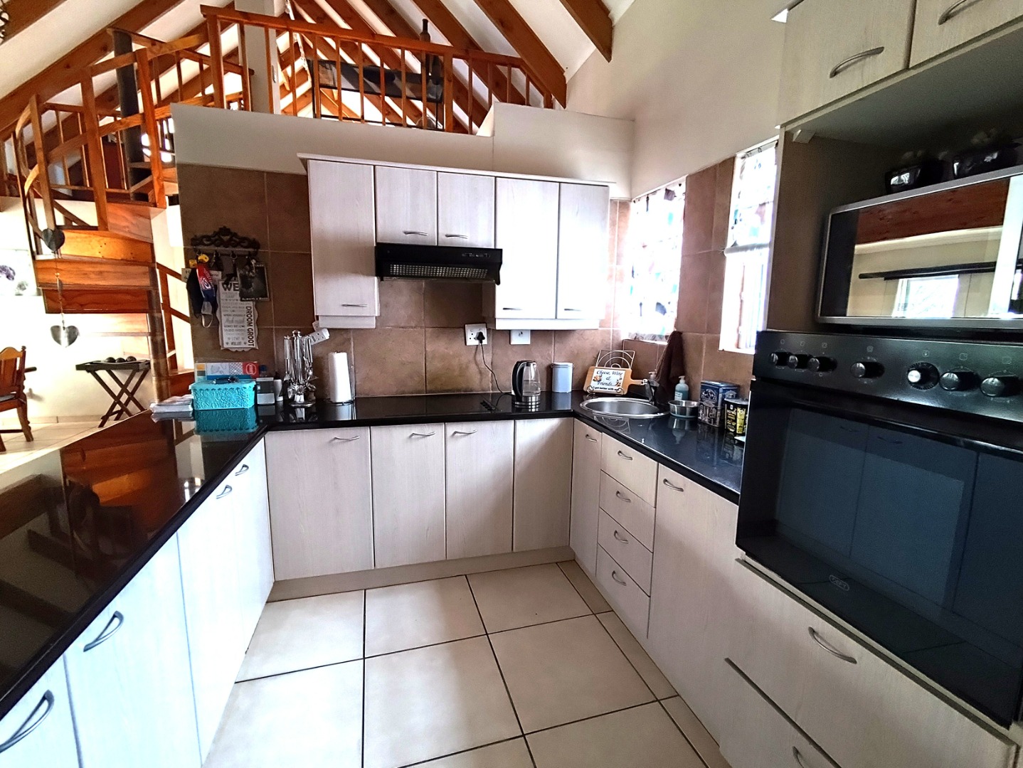 The kitchen offers ample cupboard space, an electric stove and hob and a long scullery with additional storage and a laundry area tucked at the far end. Three well-appointed bedrooms provide comfortable accommodation, with the main bedroom boasting a full en-suite bathroom and plenty of space, while the remaining bedrooms, both with built-in cupboards, share a second full bathroom.