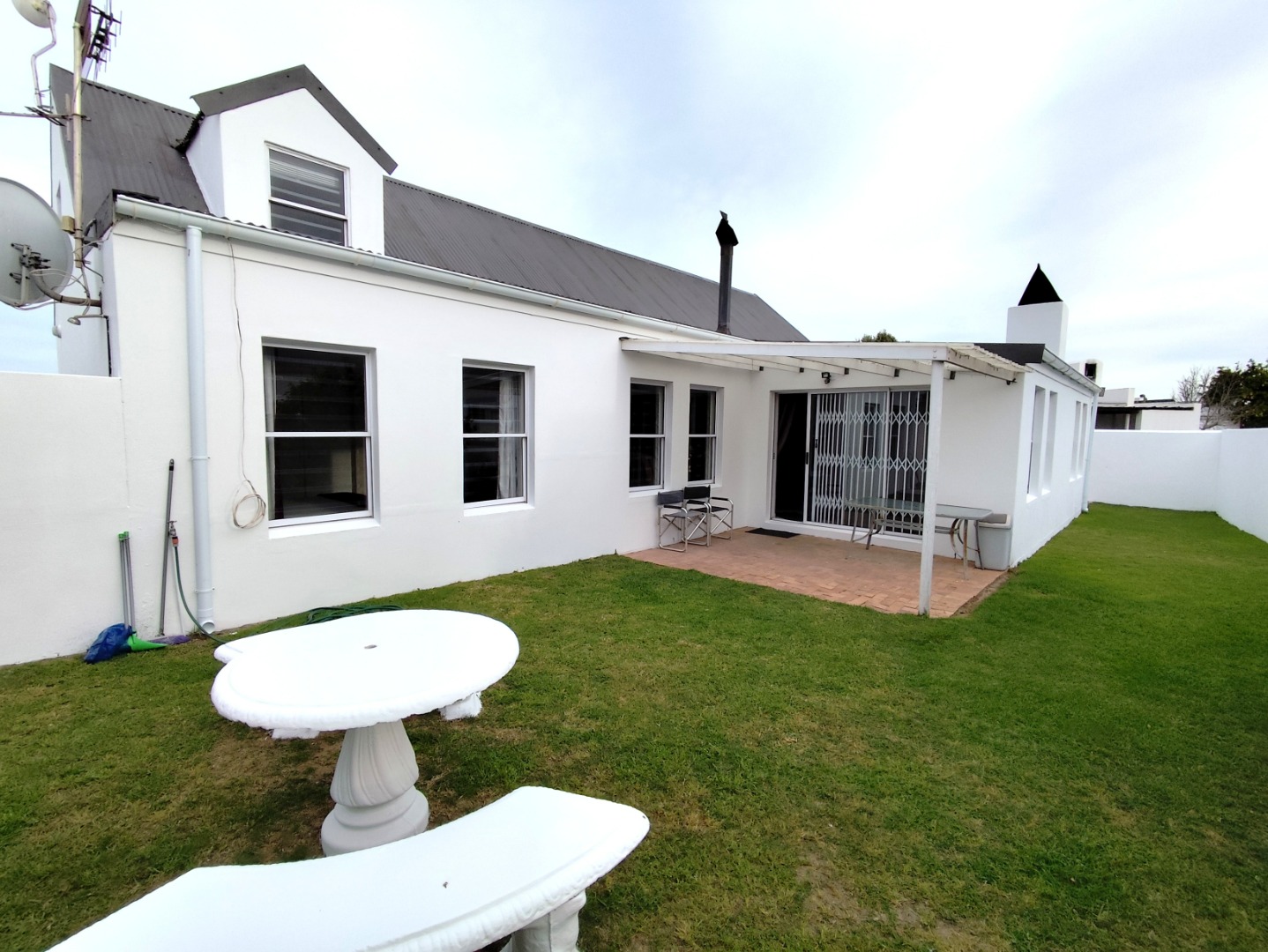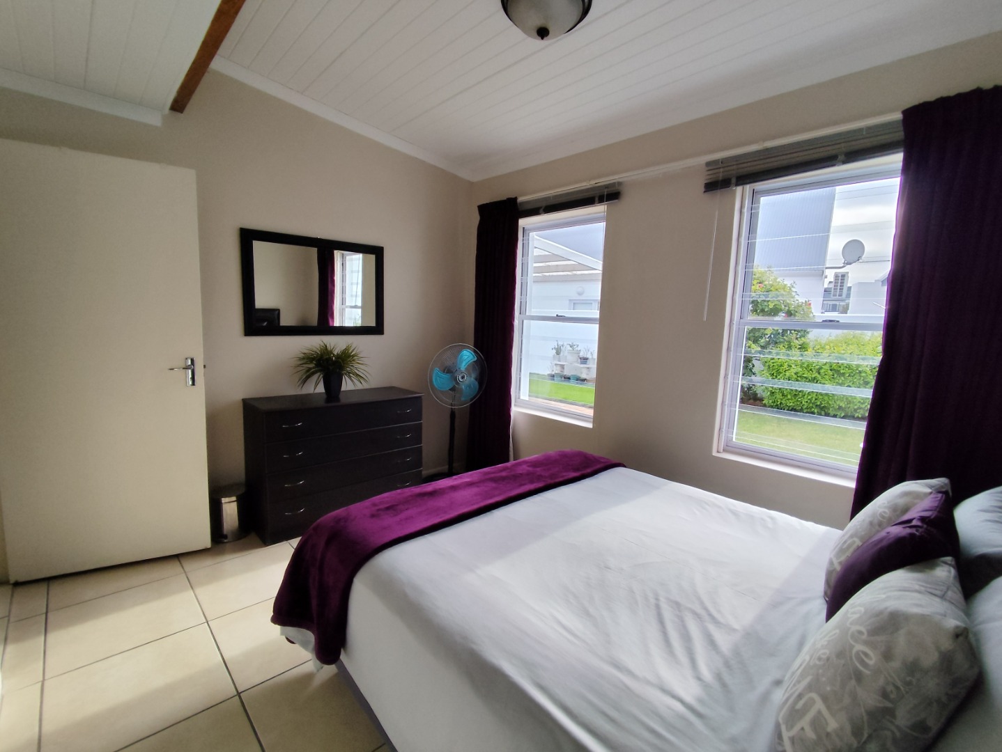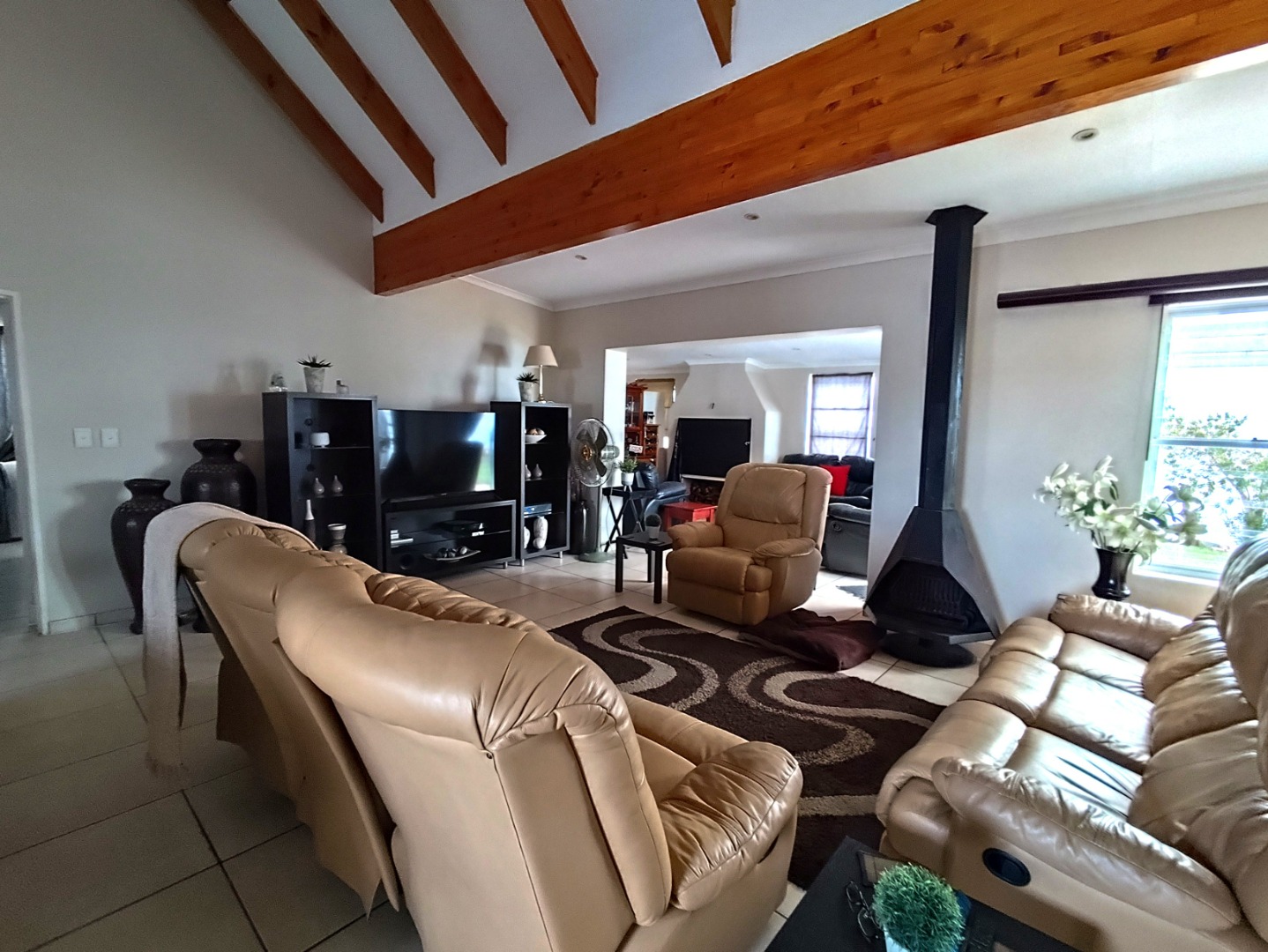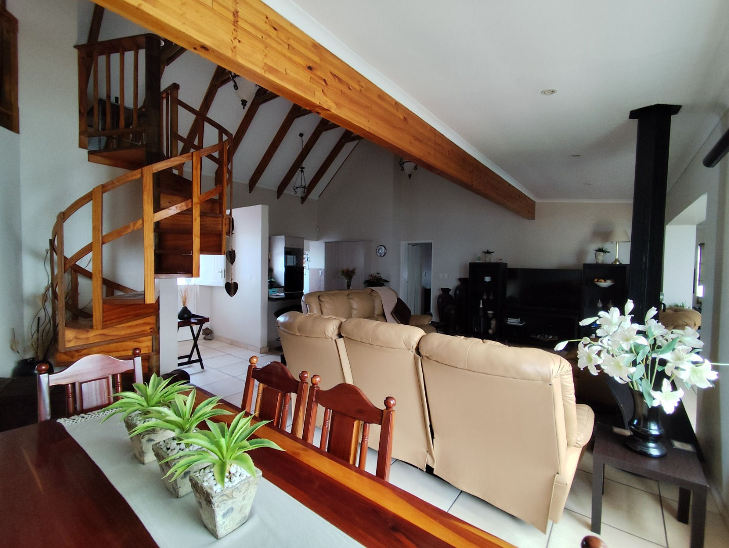 The kitchen offers ample cupboard space, an electric stove and hob and a long scullery with additional storage and a laundry area tucked at the far end. Three well-appointed bedrooms provide comfortable accommodation, with the main bedroom boasting a full en-suite bathroom and plenty of space, while the remaining bedrooms, both with built-in cupboards, share a second full bathroom.
