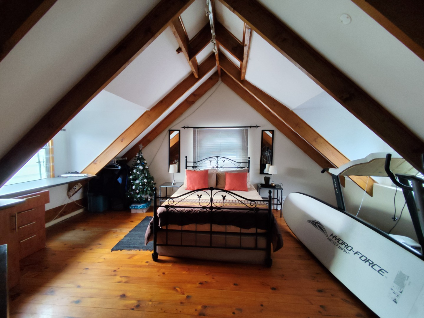 Recently painted, it welcomes you into a light-filled lounge and dining area where soaring exposed trusses create a sense of volume and a beautiful wooden staircase leads up to a versatile loft, ideal as a fourth bedroom, home office or hobby room.