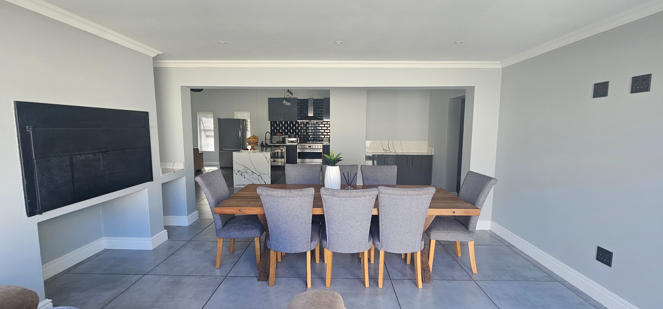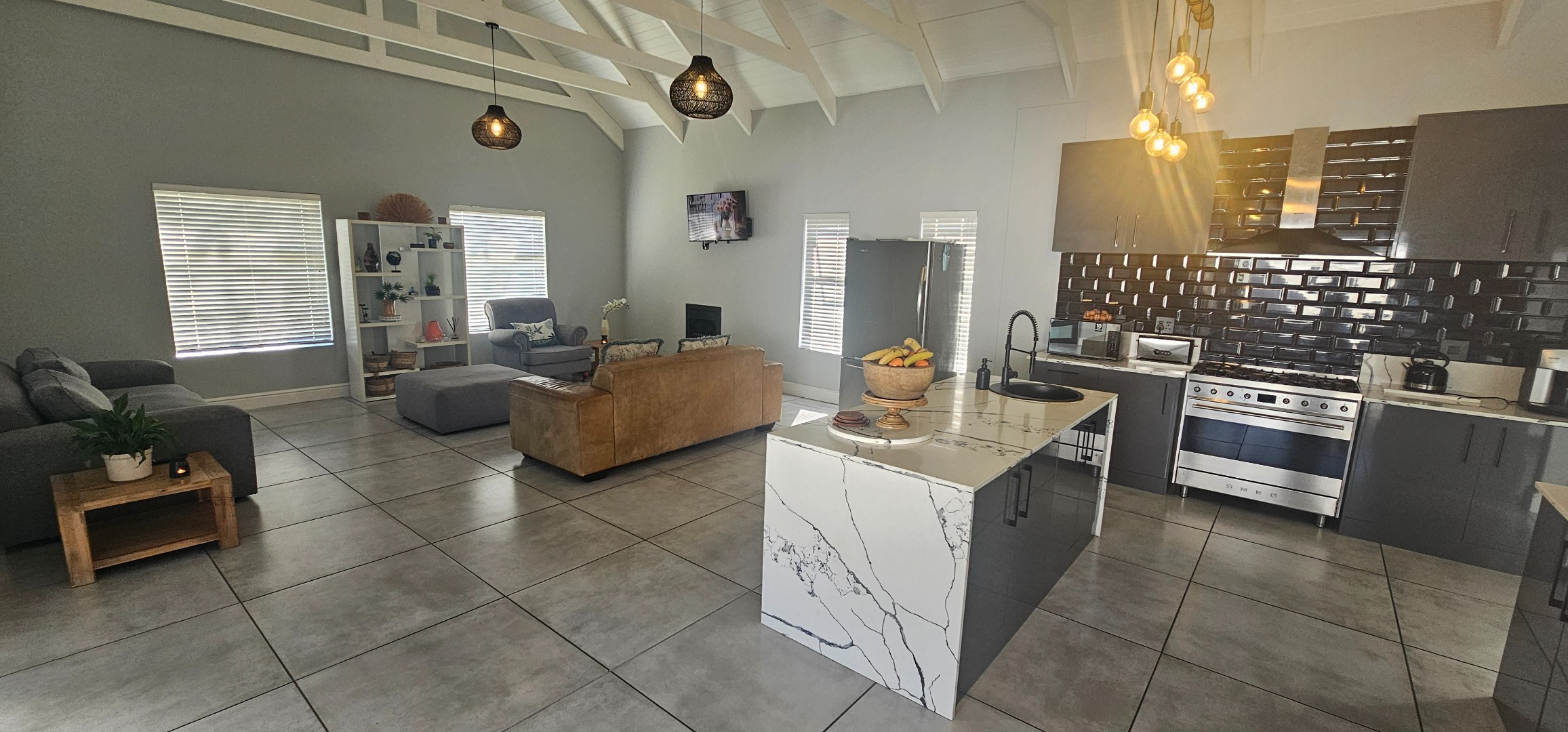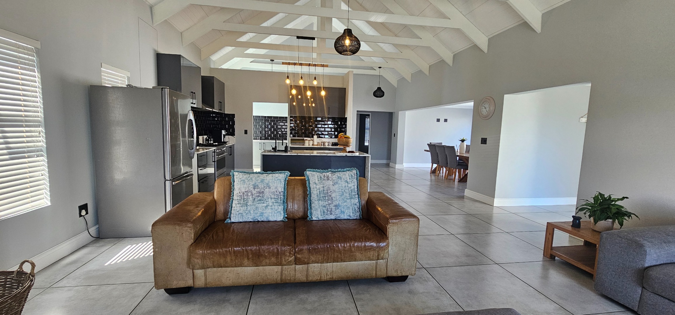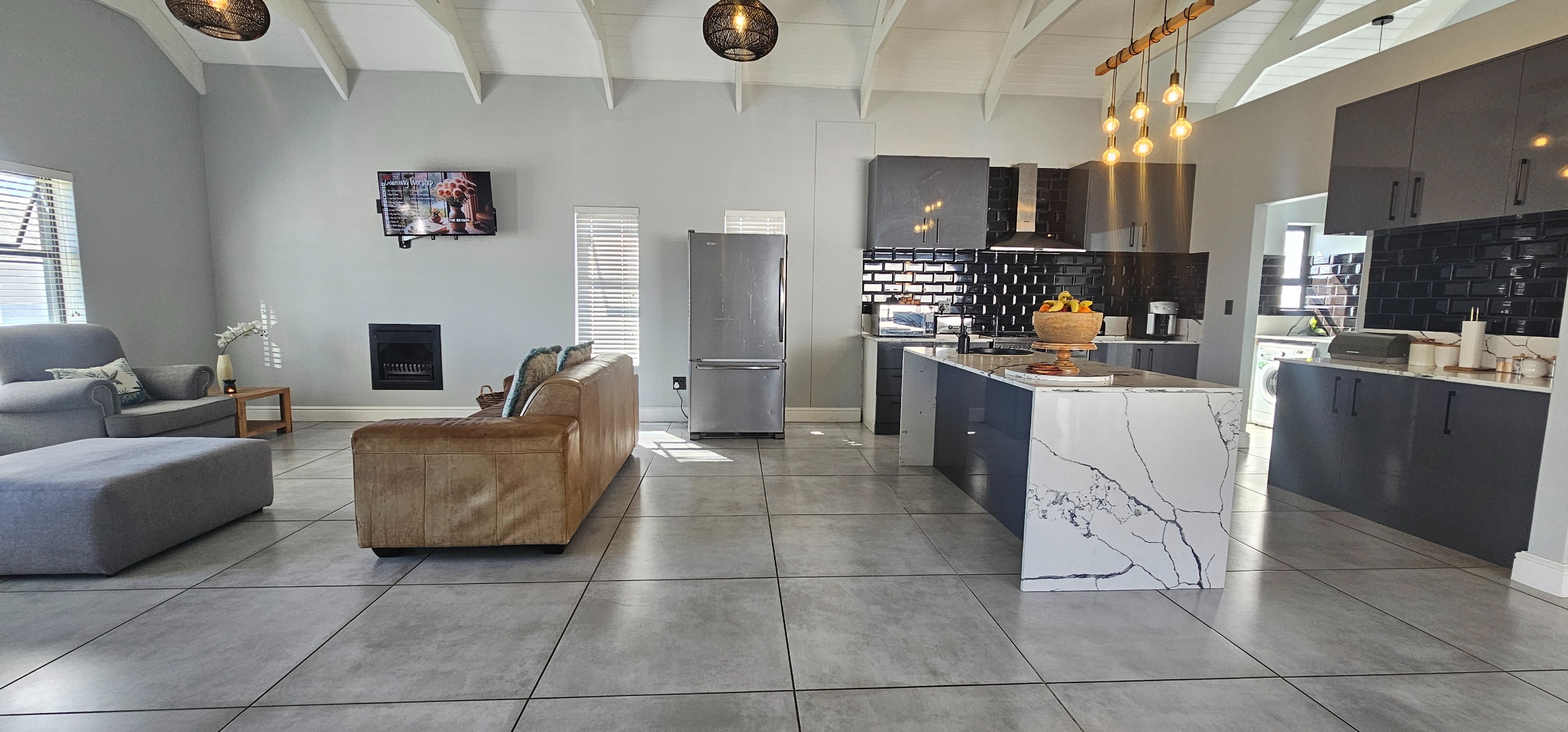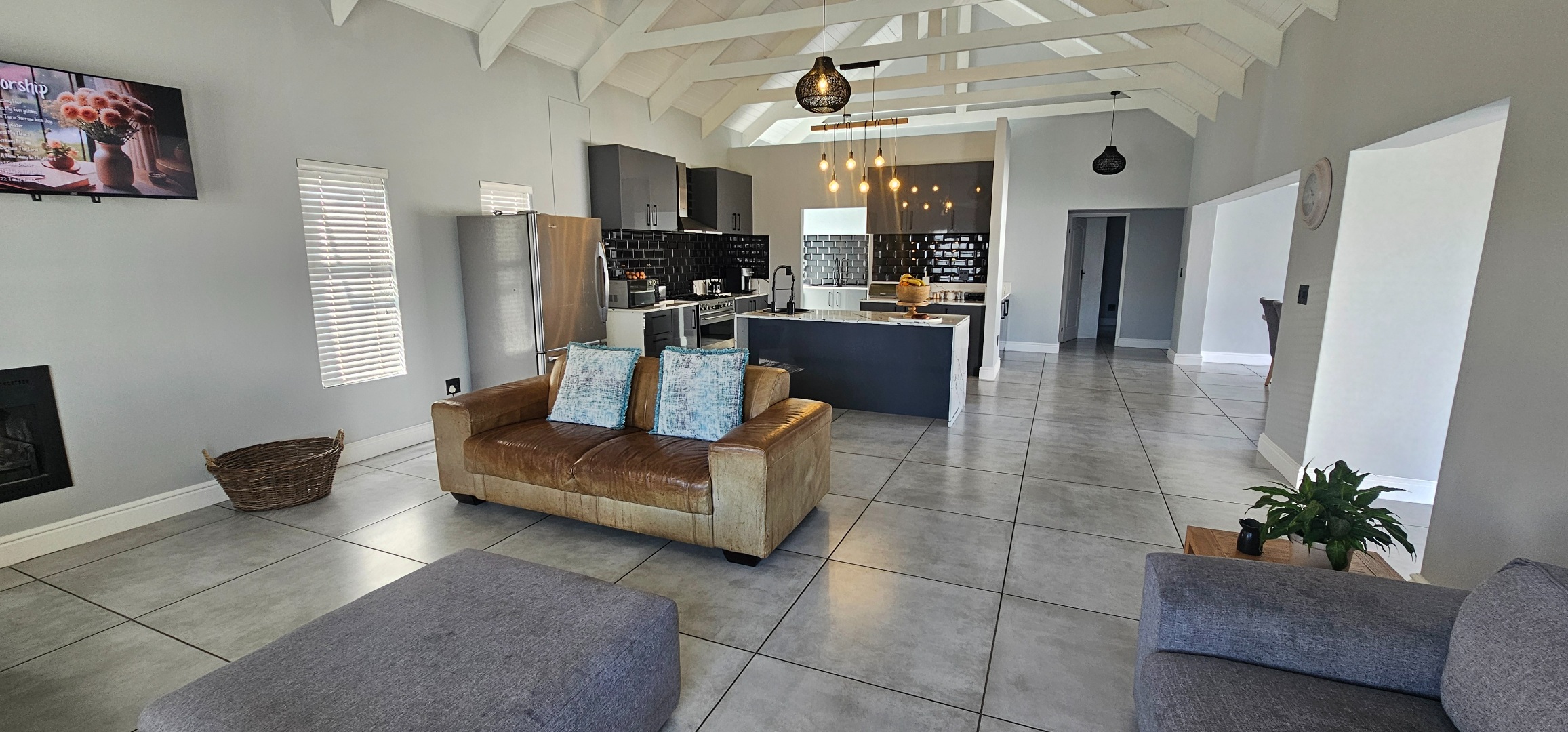 Spacious open plan lounge (with fireplace), dining area, indoor braai lounge, modern kitchen with scullery