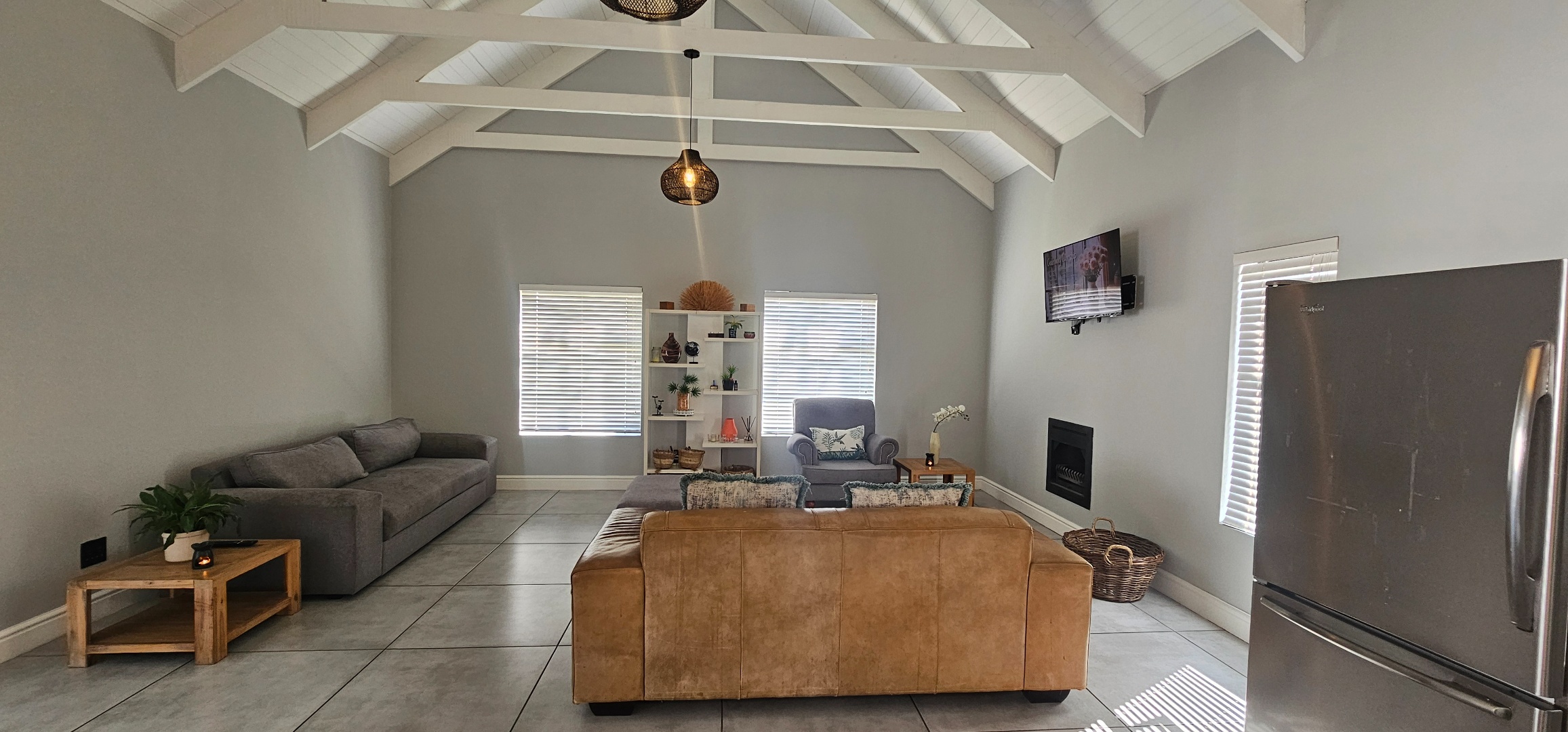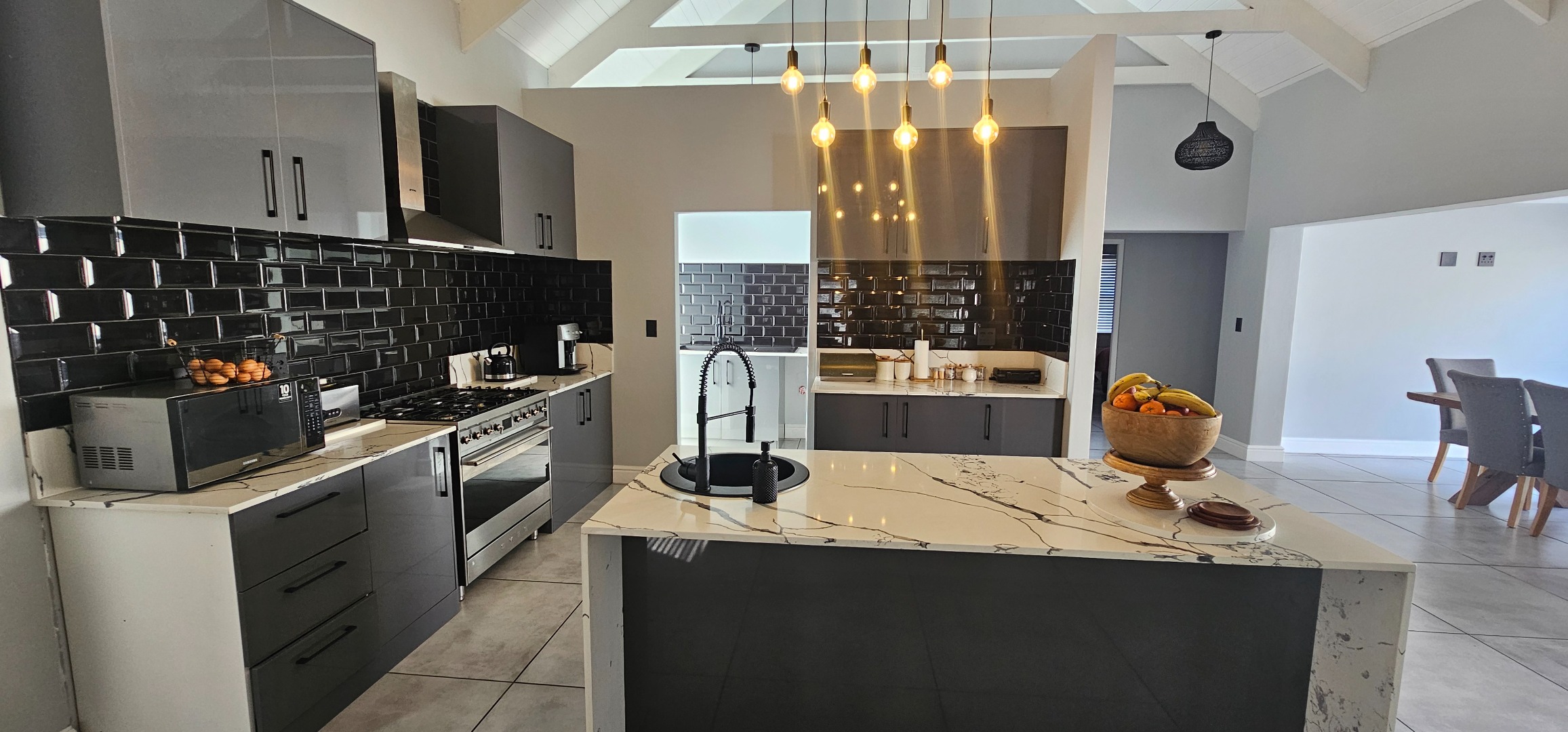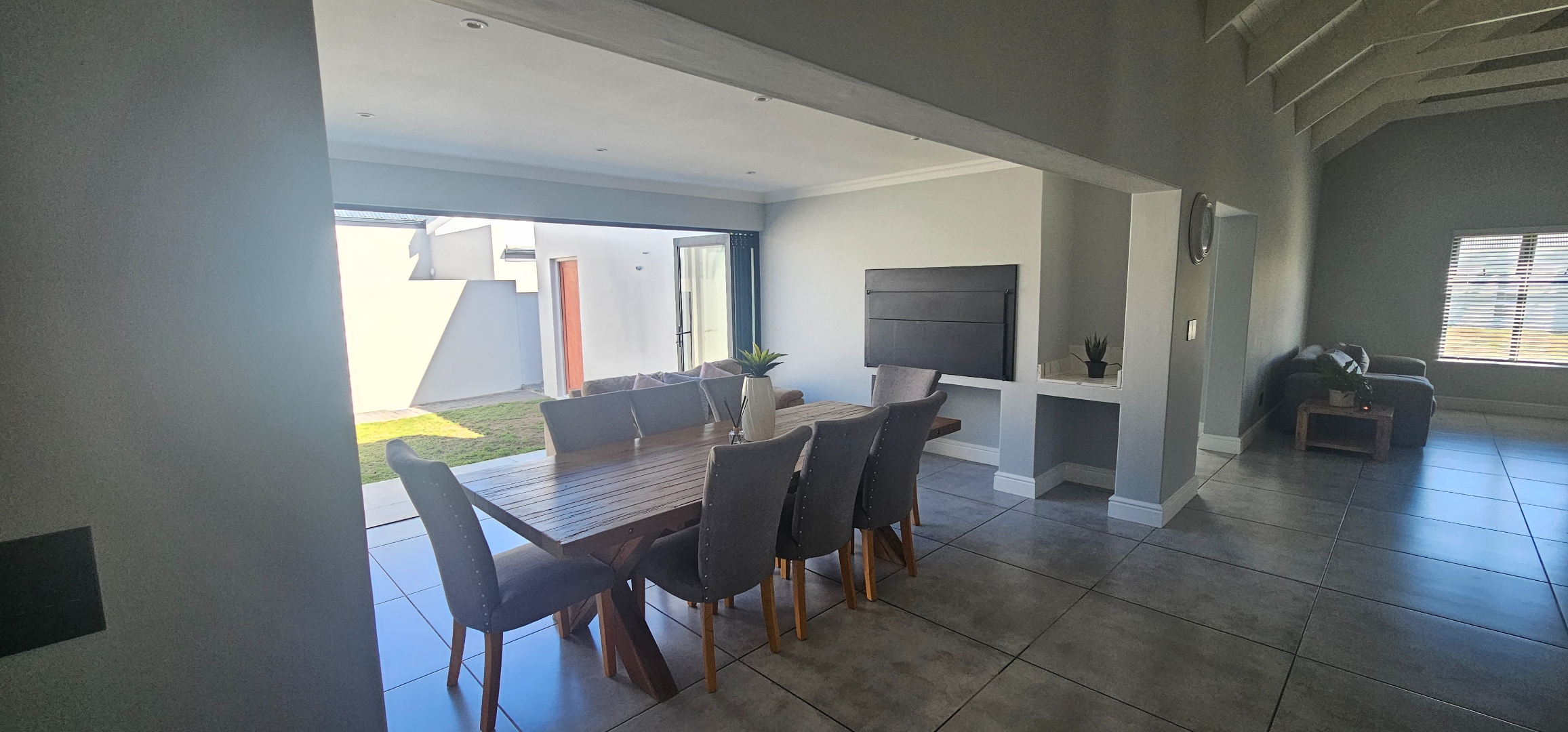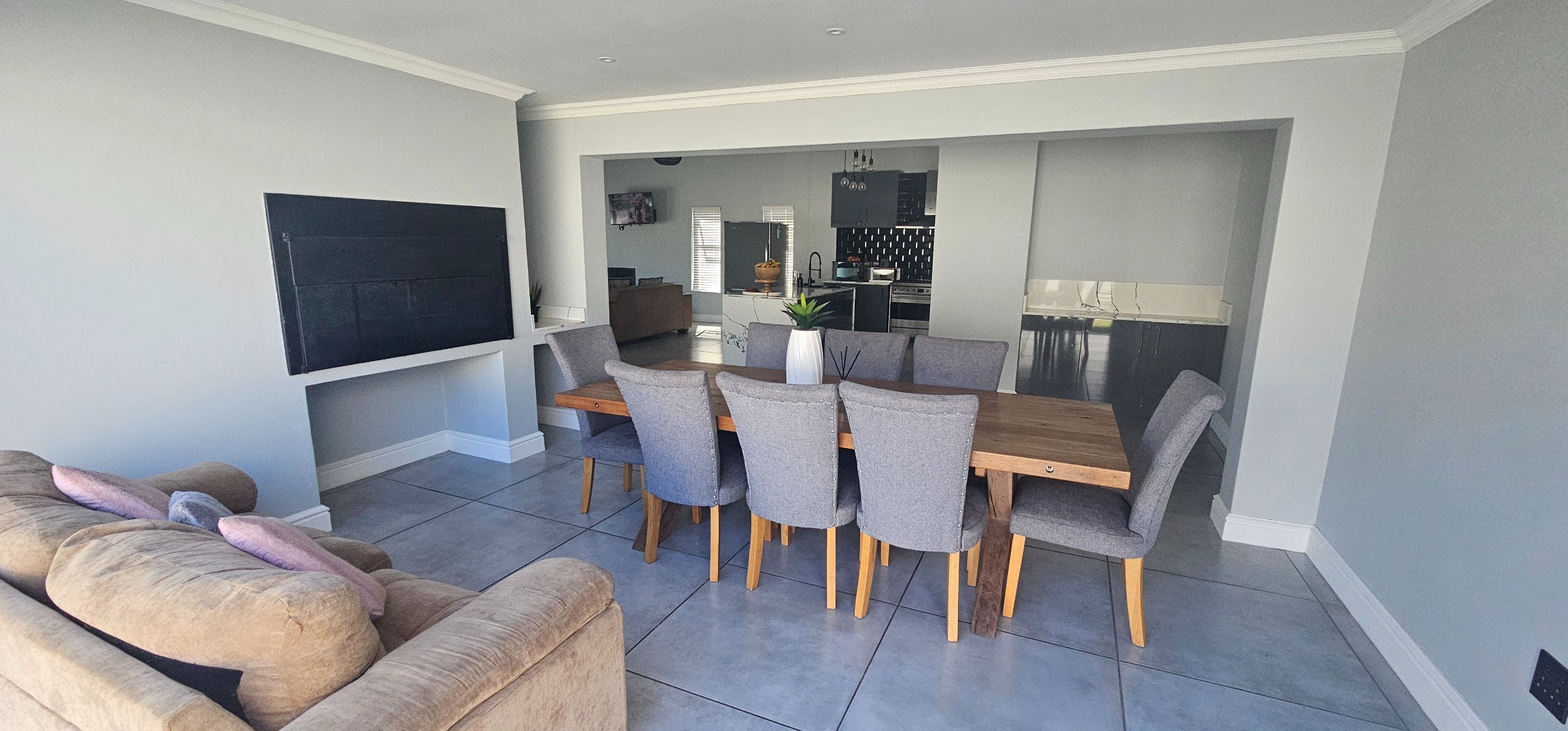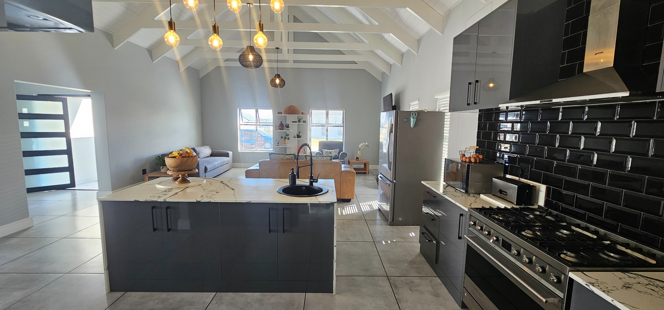 Spacious open plan lounge (with fireplace), dining area, indoor braai lounge, modern kitchen with scullery