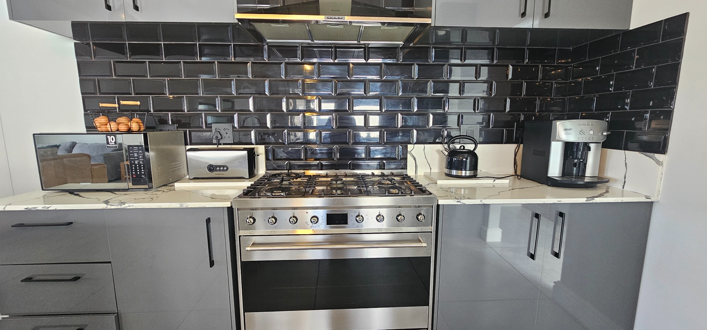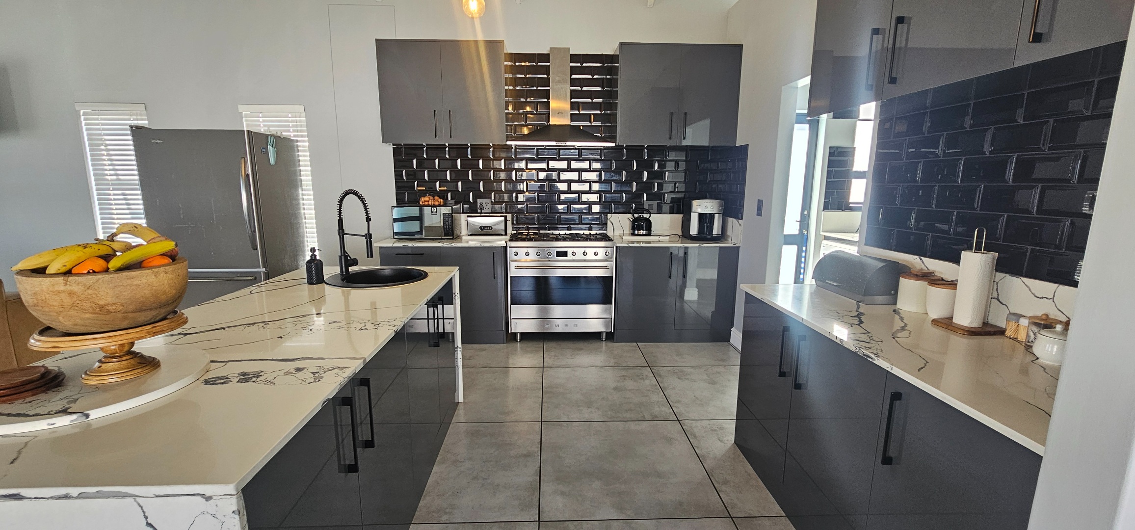 Gourmet Kitchen: A chef’s delight, equipped with a large SMEG oven/stove, granite countertops, custom cabinetry, and a large island perfect for entertaining.