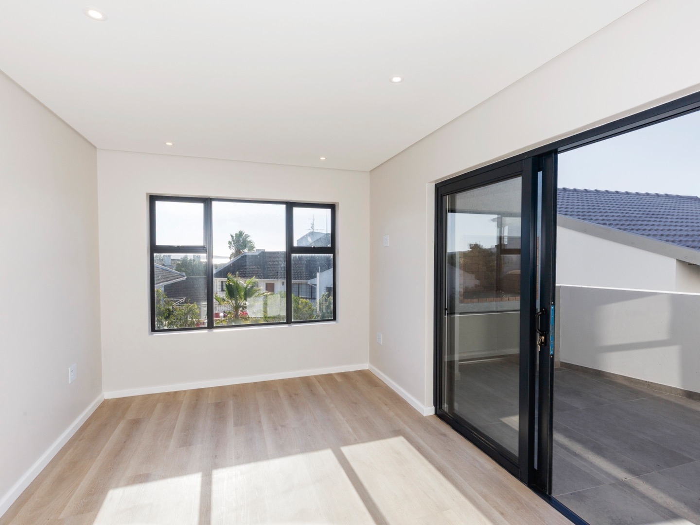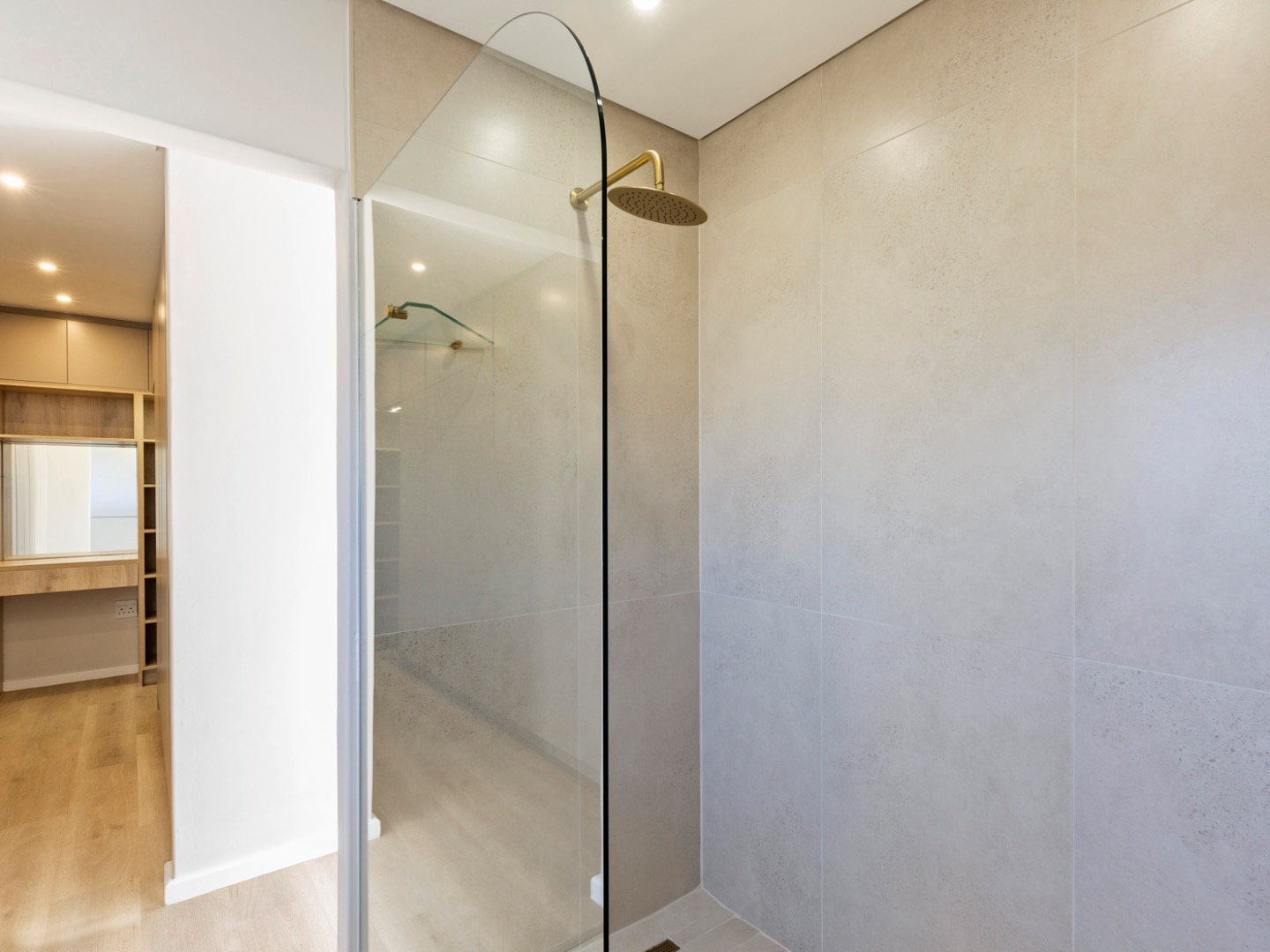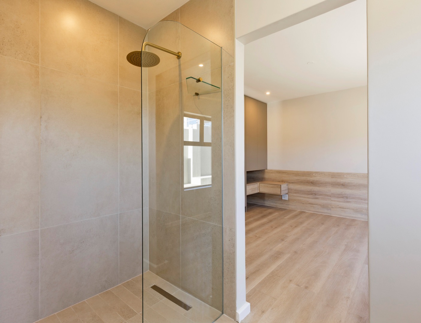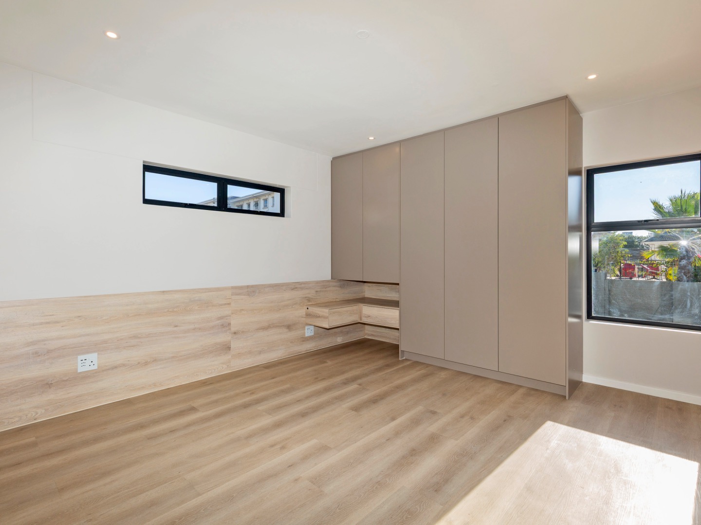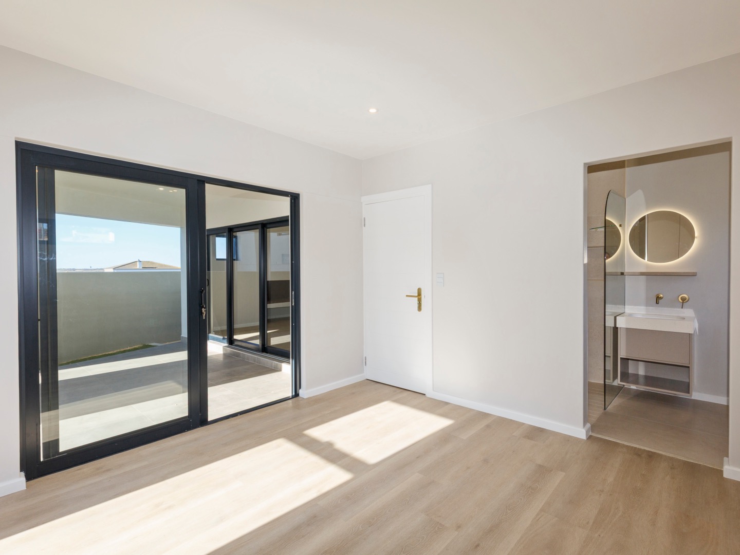 The main en-suite bedroom opens onto the balcony, enjoys north-facing light through sliding doors, and warm western sun through a side window. This is the only area of the home with a partial view of Langebaan Lagoon.