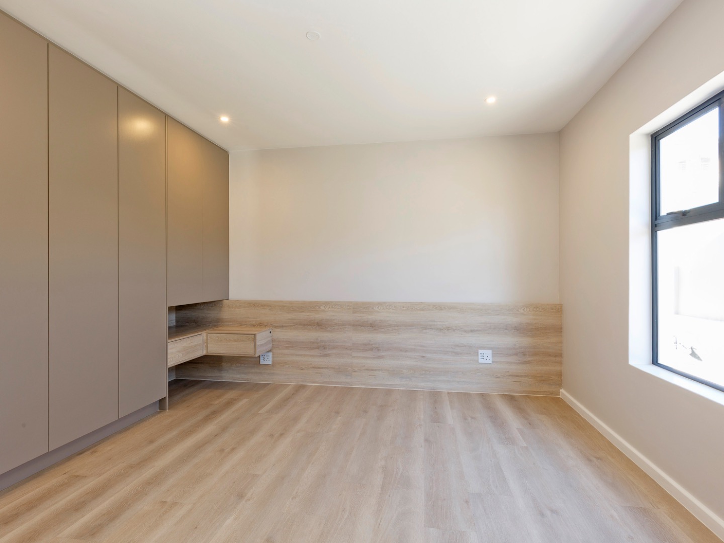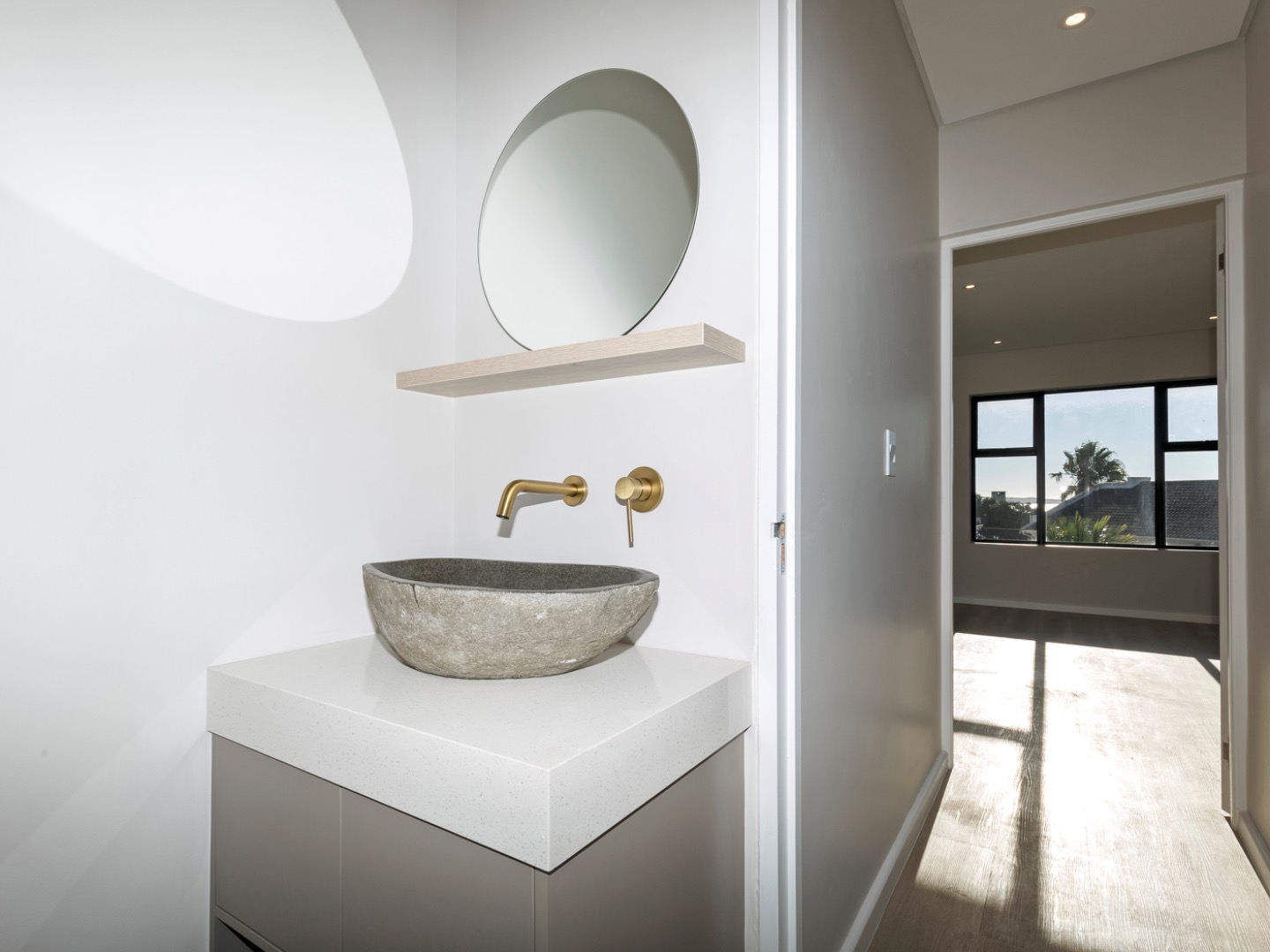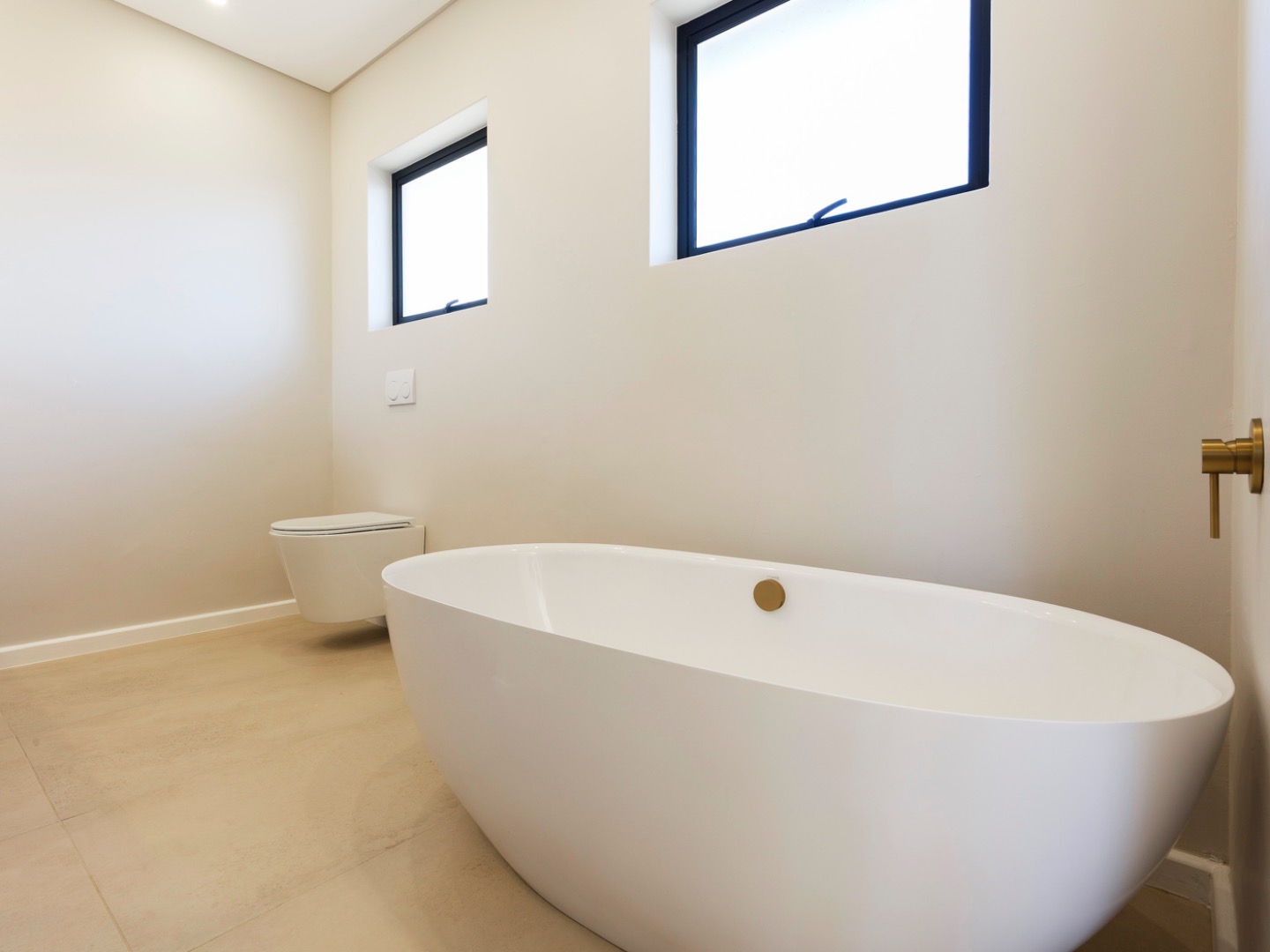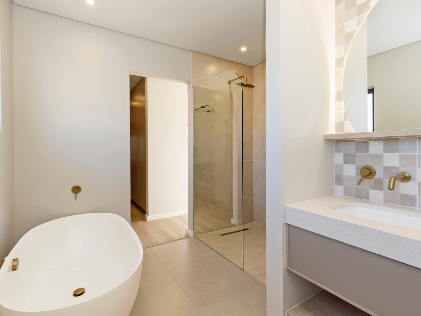 The main en-suite bedroom opens onto the balcony, enjoys north-facing light through sliding doors, and warm western sun through a side window. This is the only area of the home with a partial view of Langebaan Lagoon.