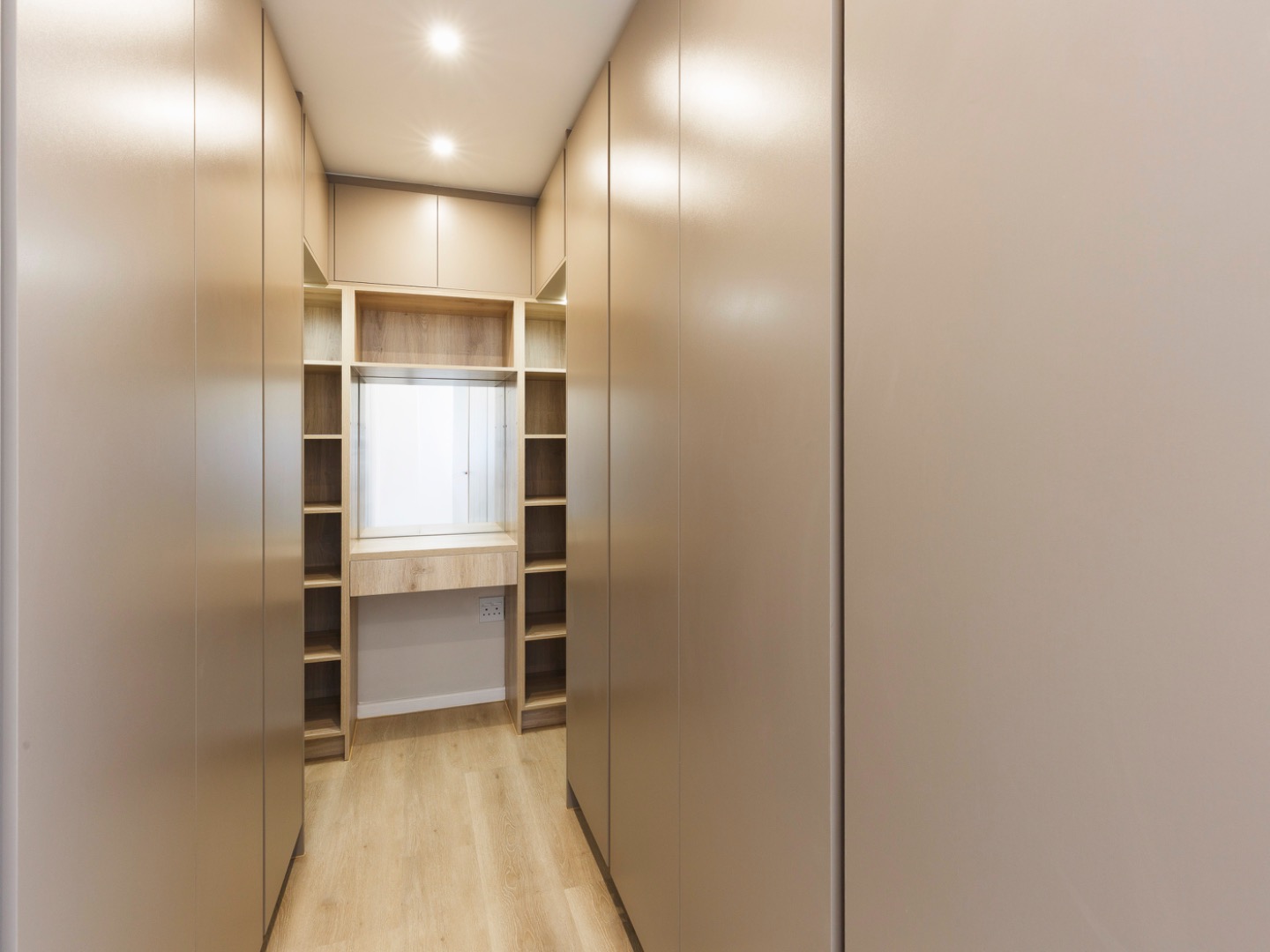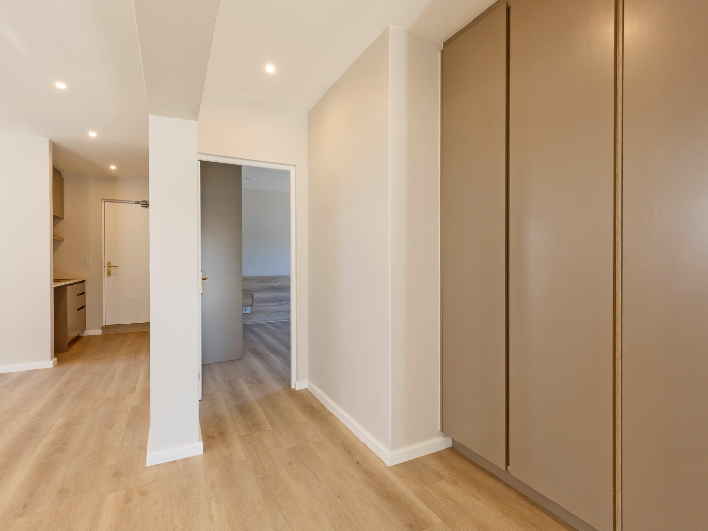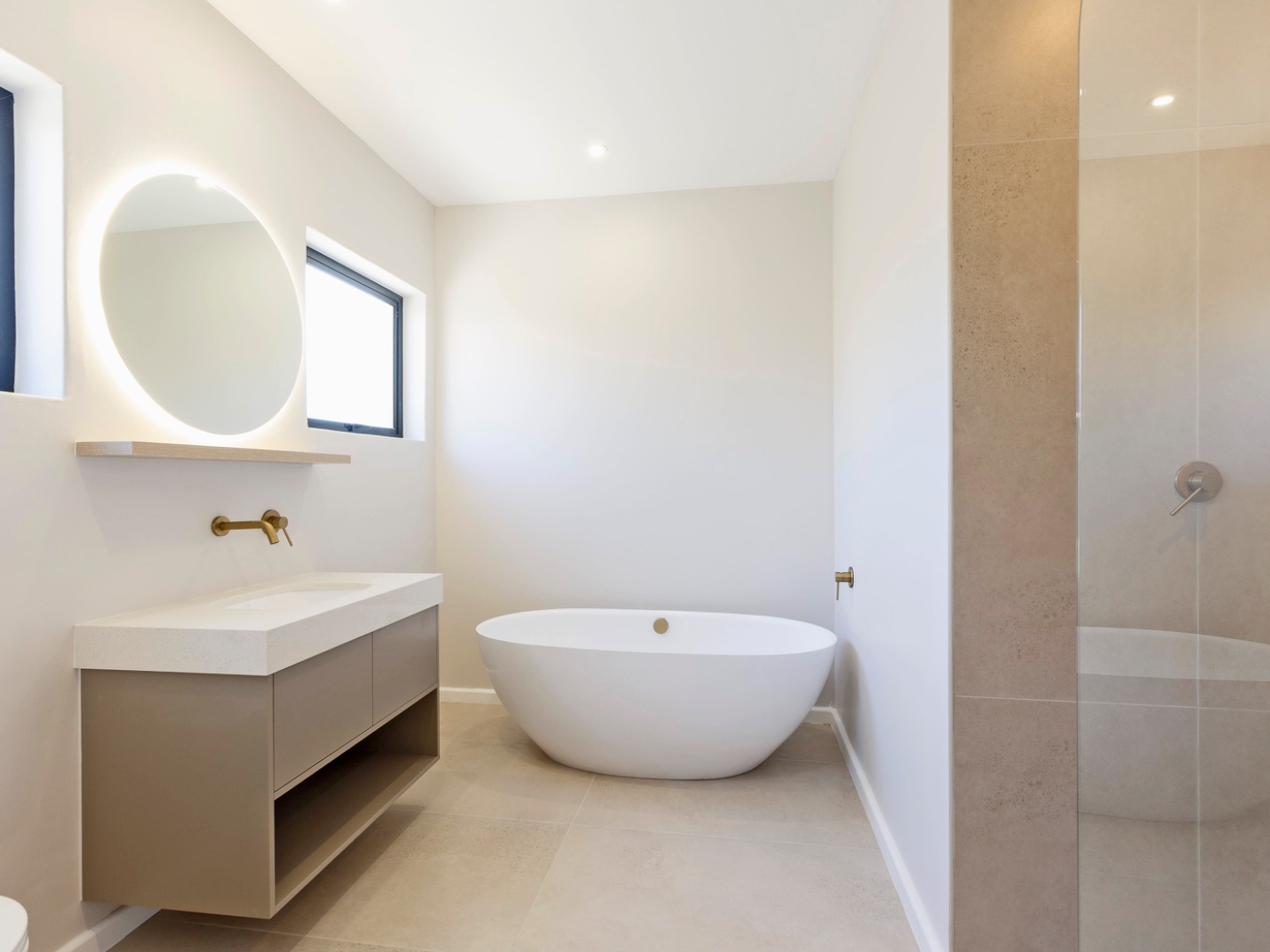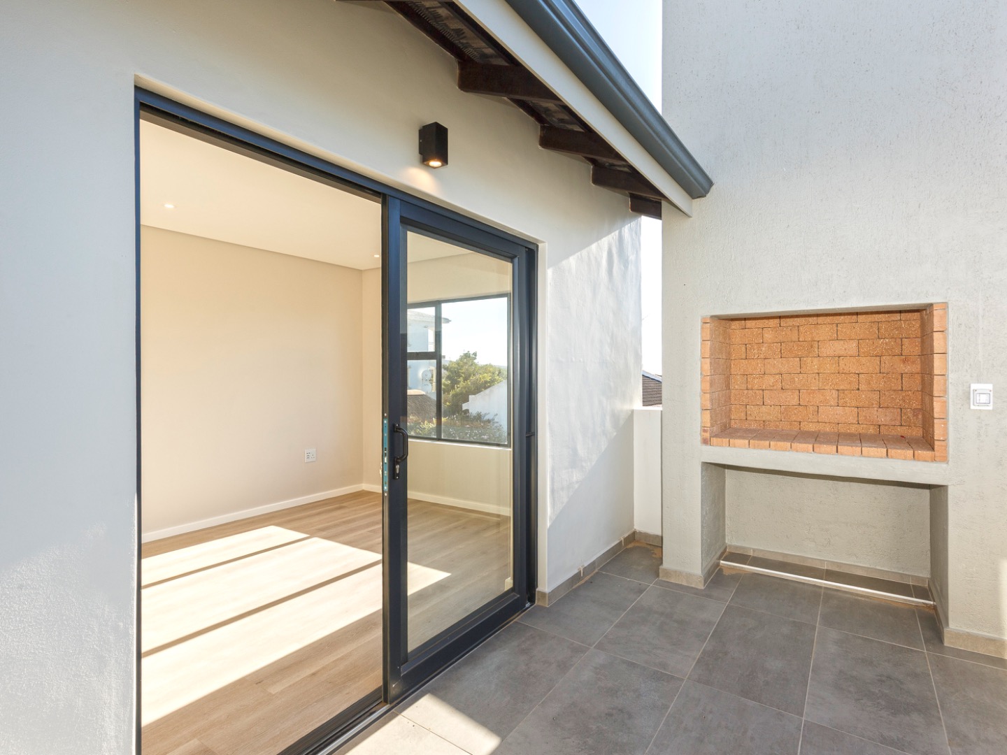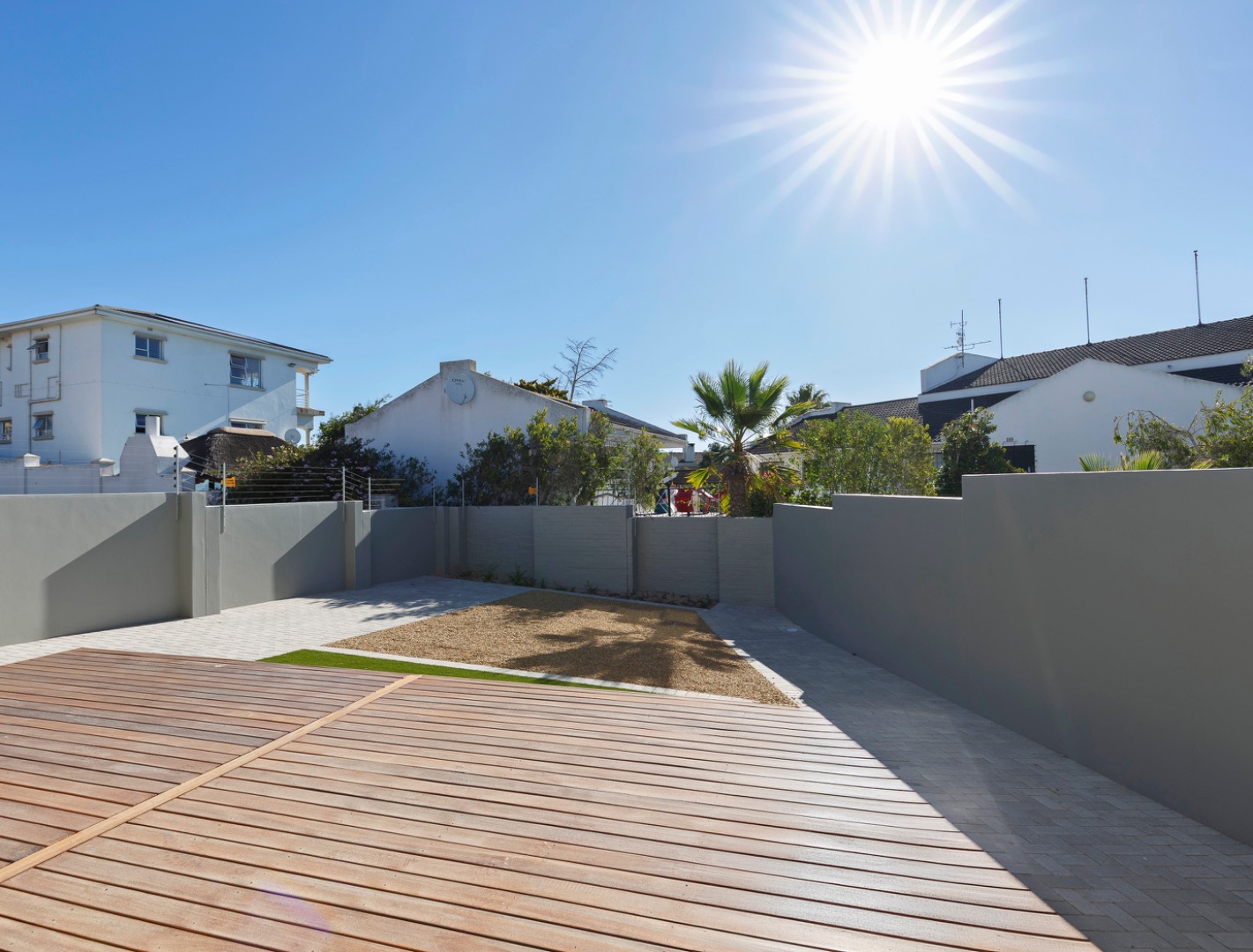 The main en-suite bedroom opens onto the balcony, enjoys north-facing light through sliding doors, and warm western sun through a side window. This is the only area of the home with a partial view of Langebaan Lagoon.