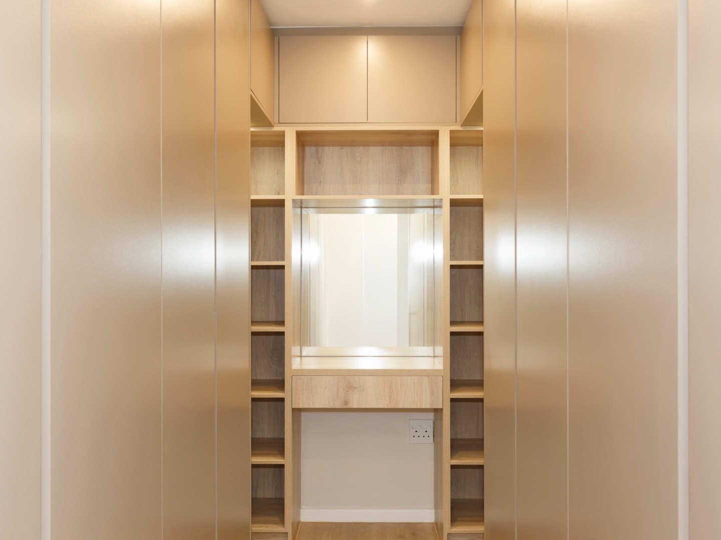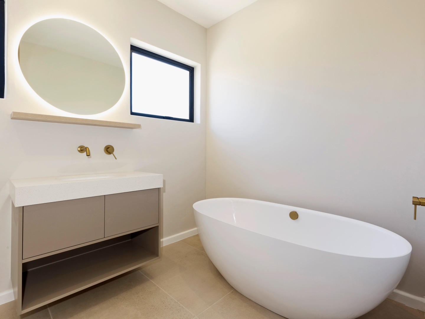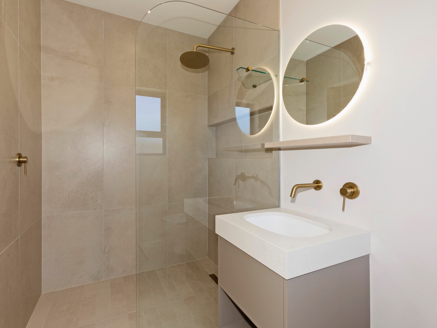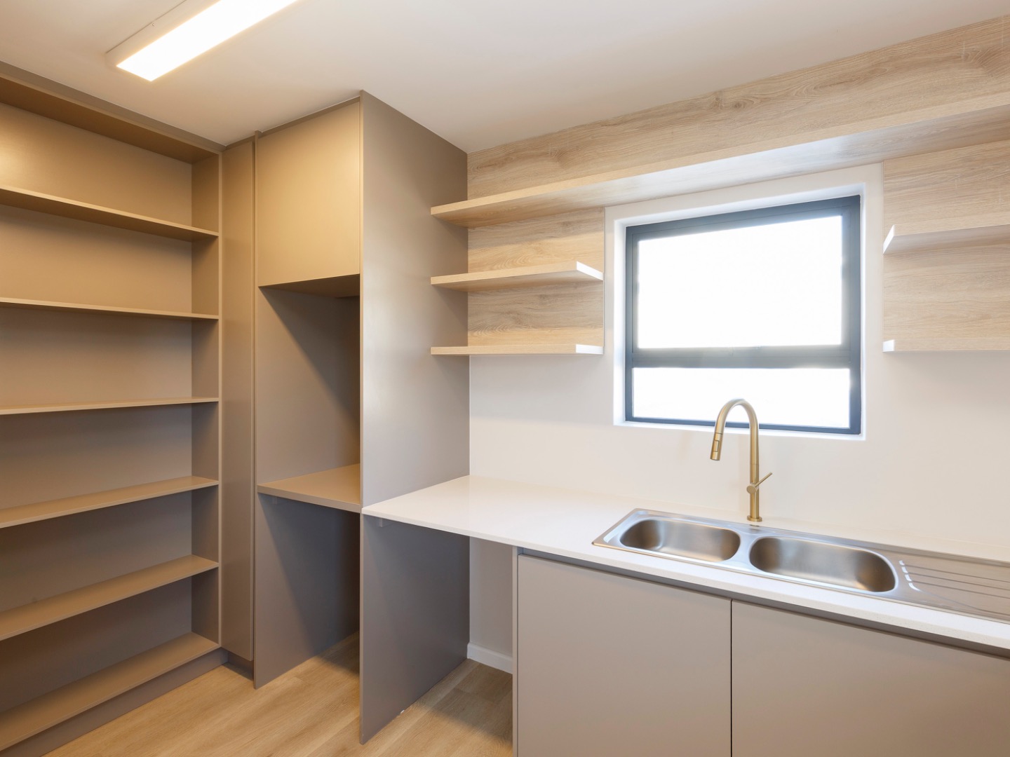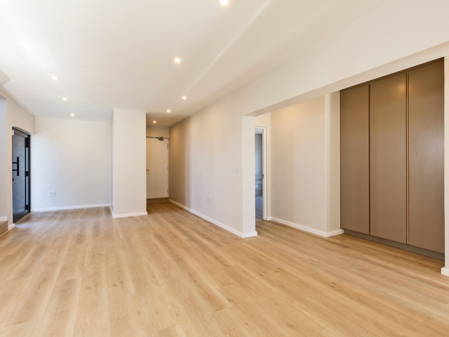 The main en-suite bedroom opens onto the balcony, enjoys north-facing light through sliding doors, and warm western sun through a side window. This is the only area of the home with a partial view of Langebaan Lagoon.