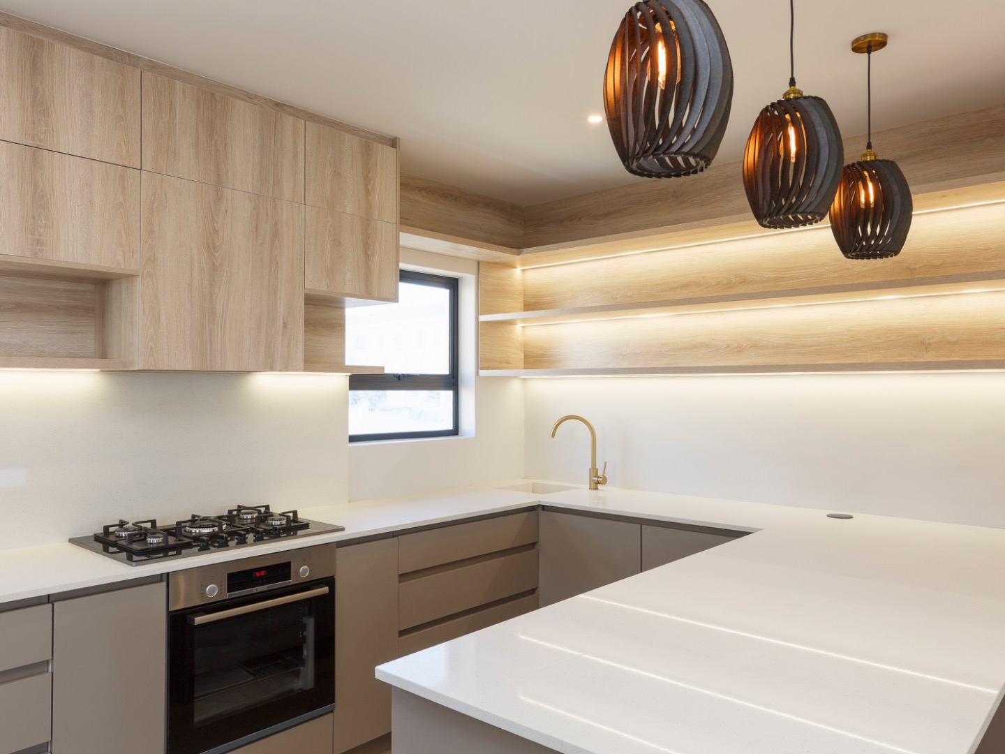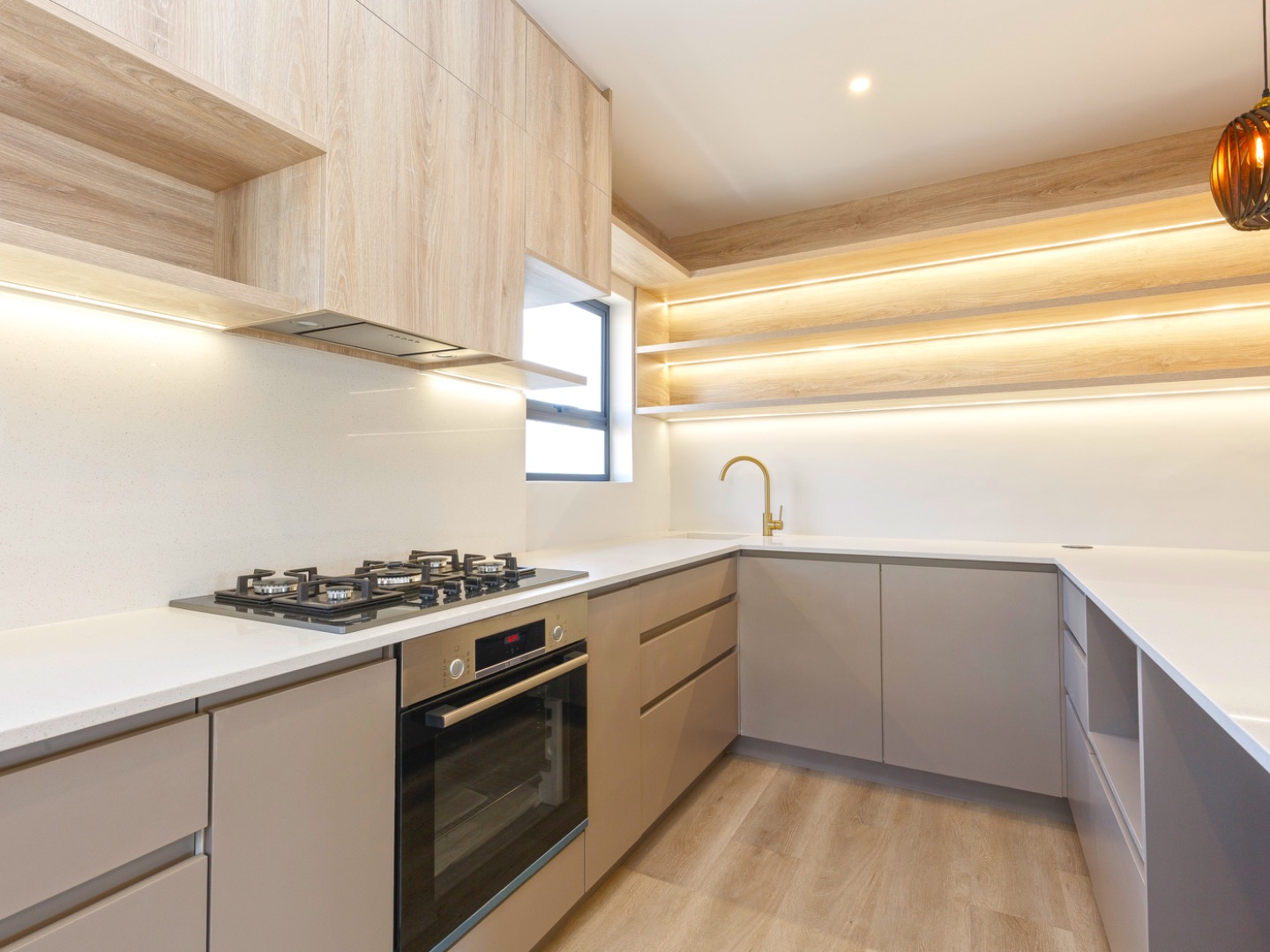 Kitchen with Caesarstone countertops, gas stove, electric oven