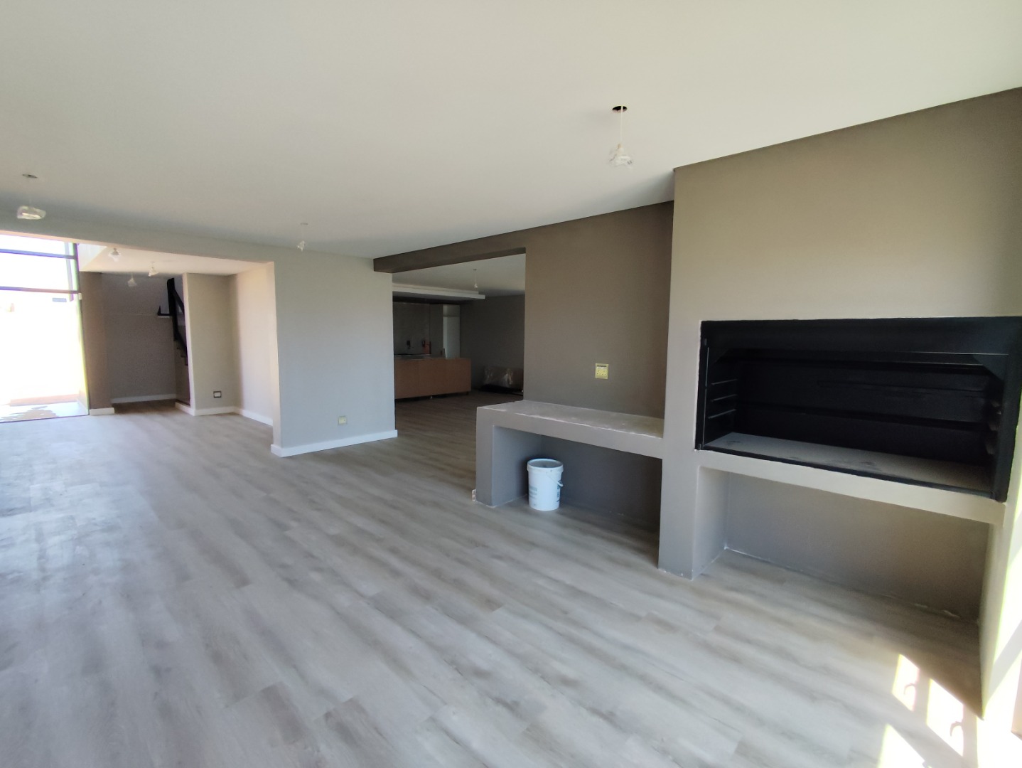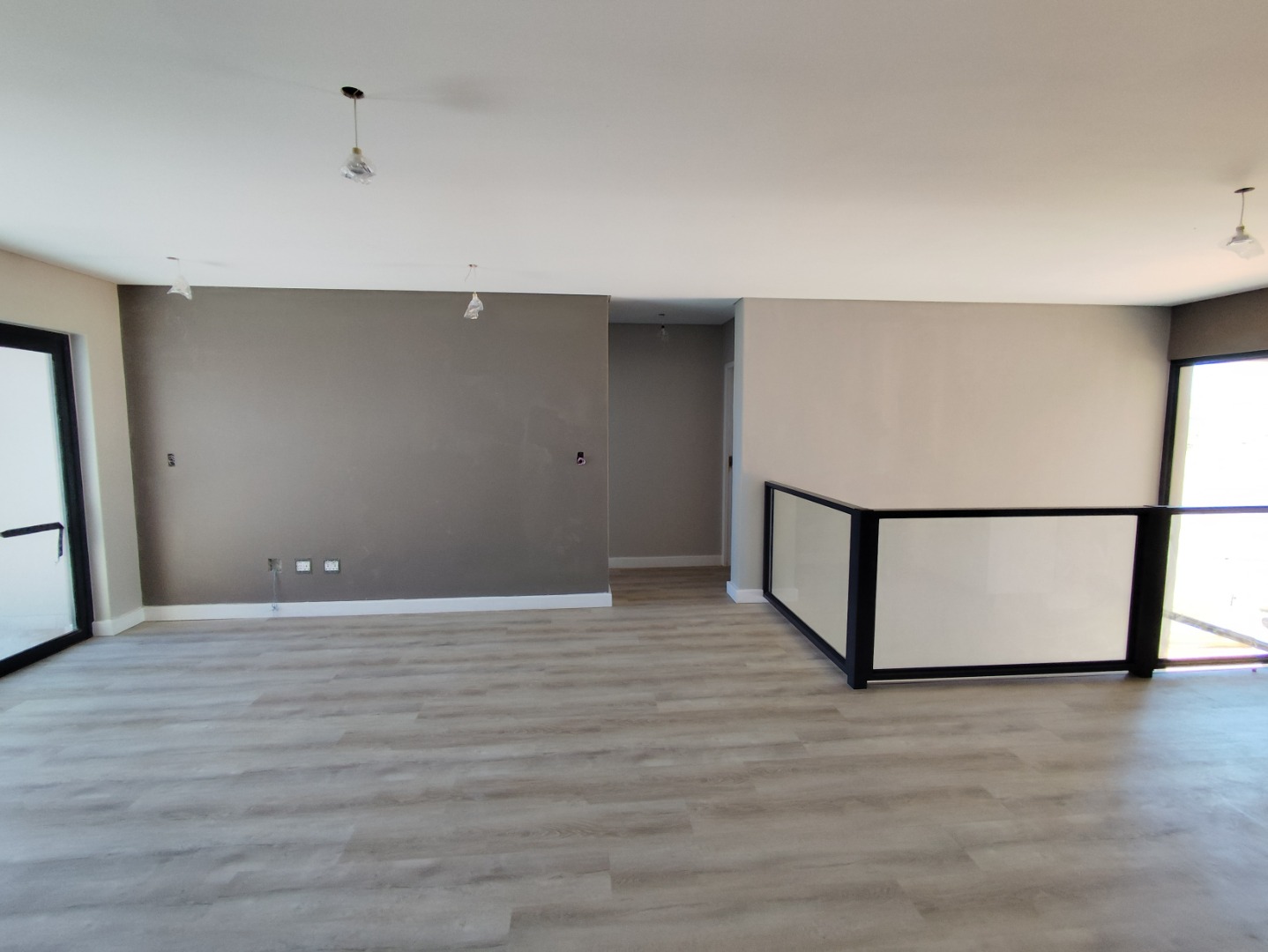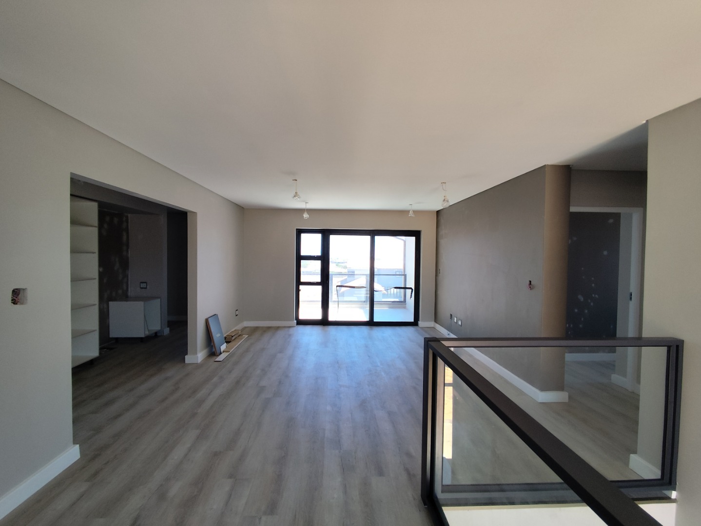 From the moment you step into the striking double-volume entrance, you’re welcomed into a spacious open-plan living area that connects effortlessly to the designer kitchen, dining space and braai room, ideal for both entertaining and relaxed family living. The sleek kitchen features a gas stove and hob, high-end finishes and a separate scullery to keep the space pristine. The ground floor also includes a guest suite with en-suite bathroom and a guest toilet, as well as seamless flow to the garden and outdoor entertainment area via the staircase and wooden deck.