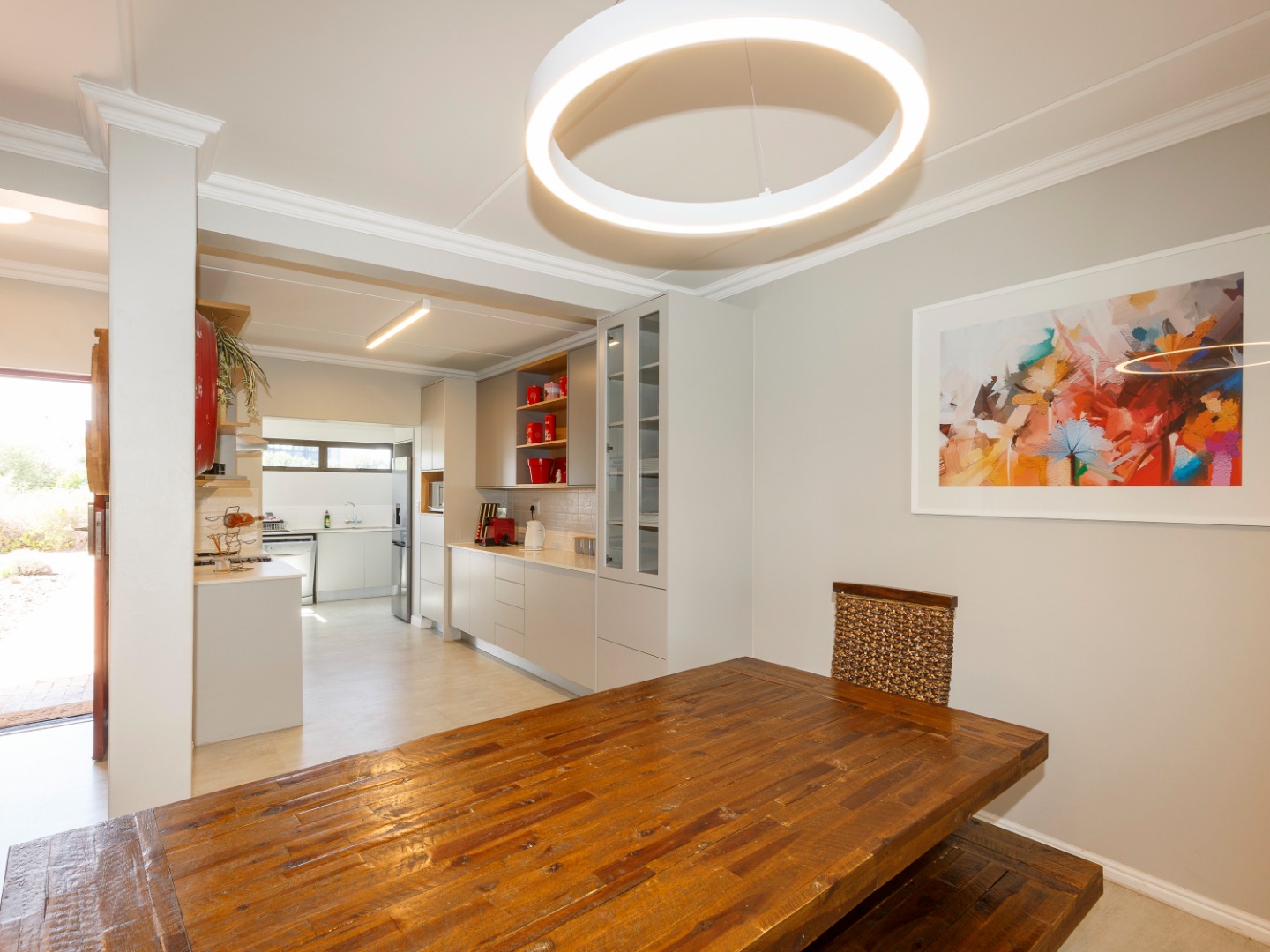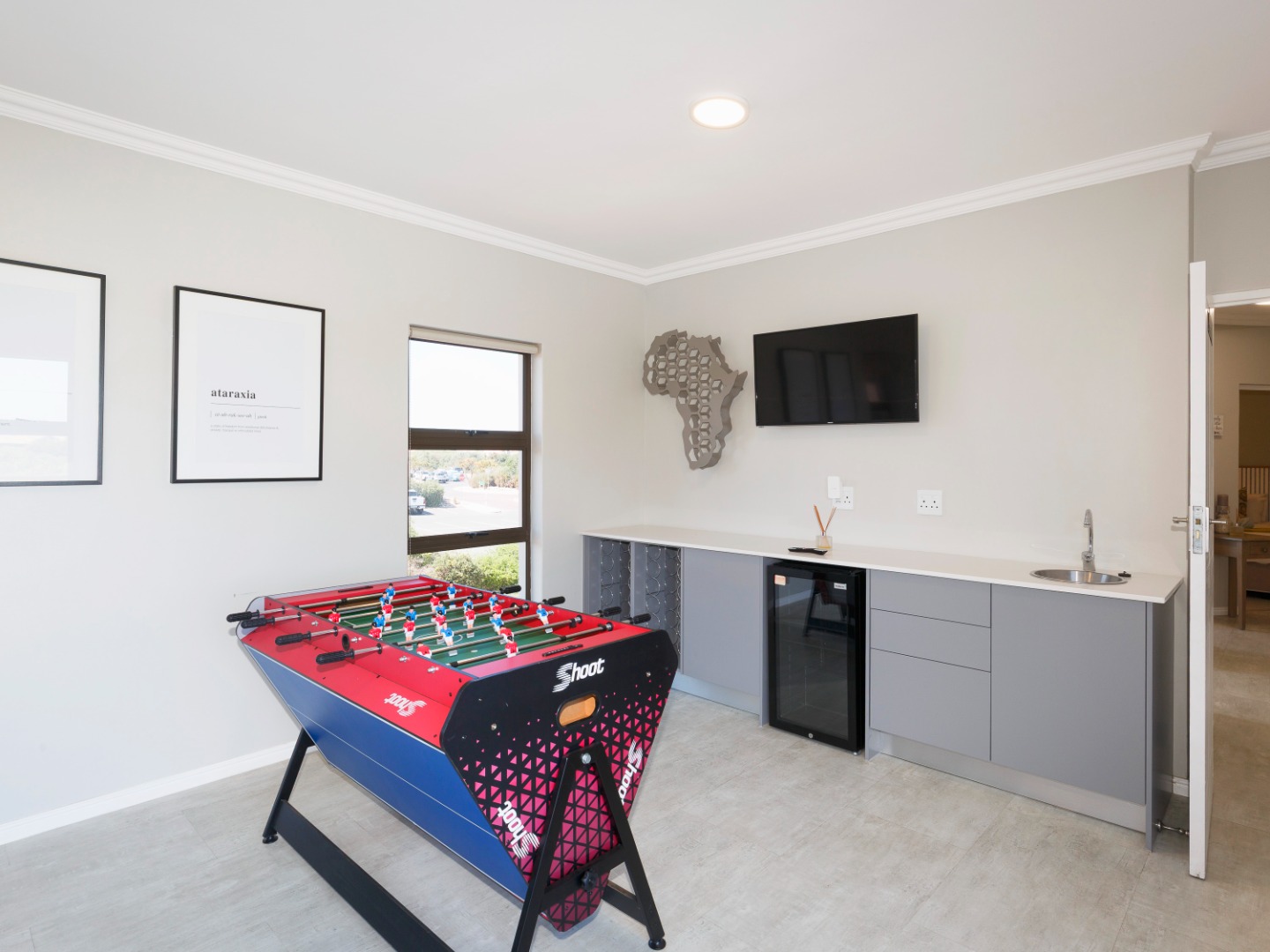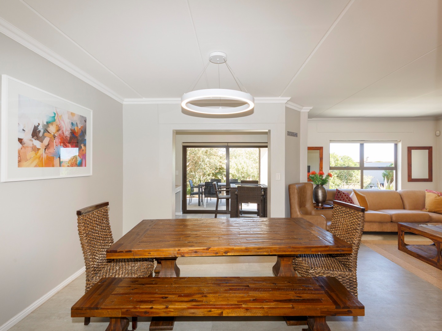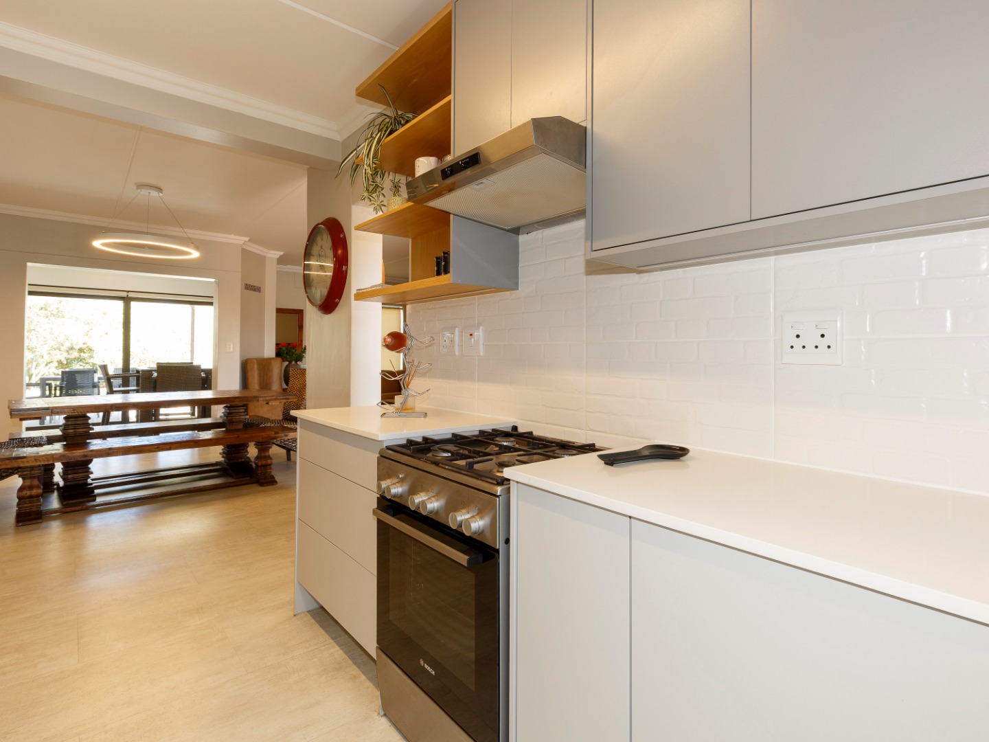 Downstairs, the home offers a modern kitchen that flows seamlessly into the open-plan living and dining area, creating a warm and inviting space ideal for both everyday living and entertaining. The living area leads out to an enclosed patio braai room, perfect for year-round entertaining.