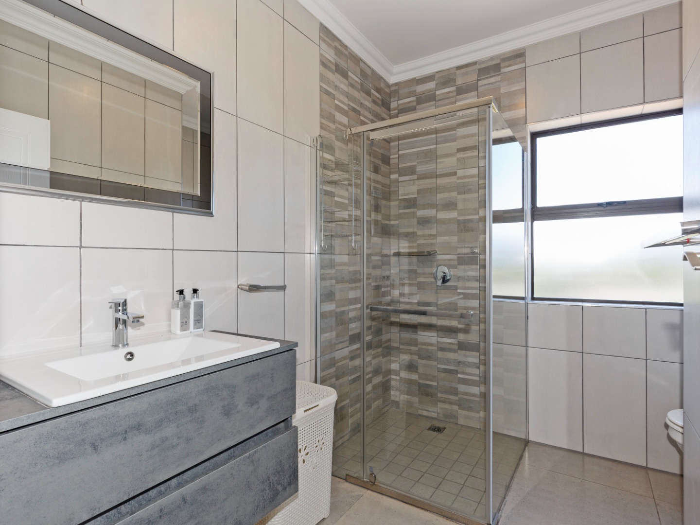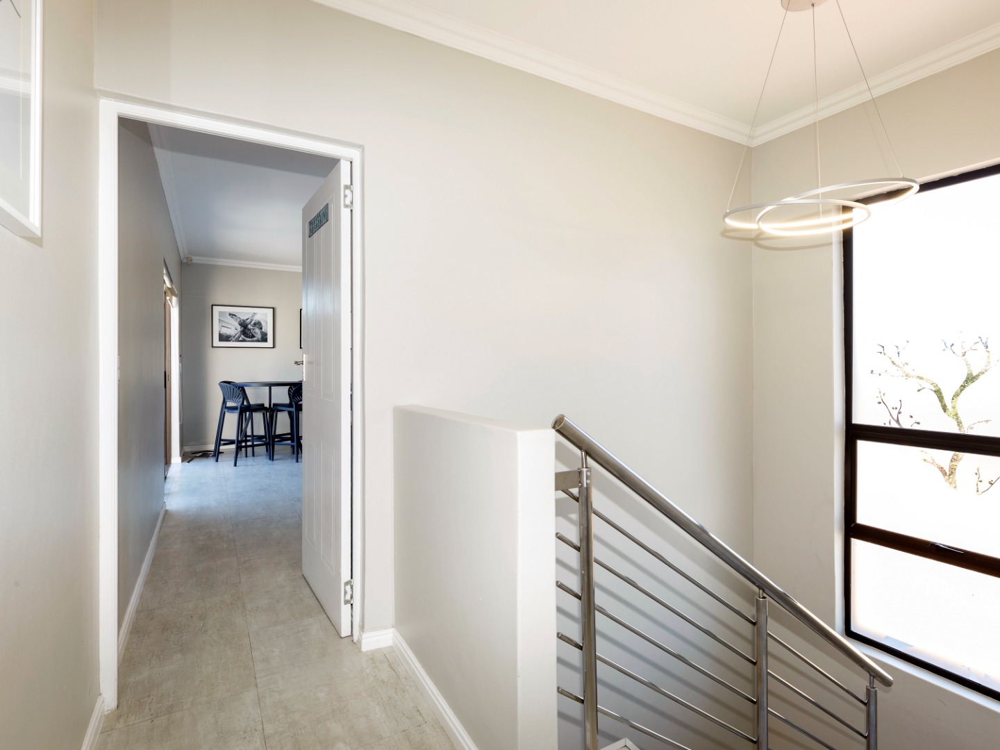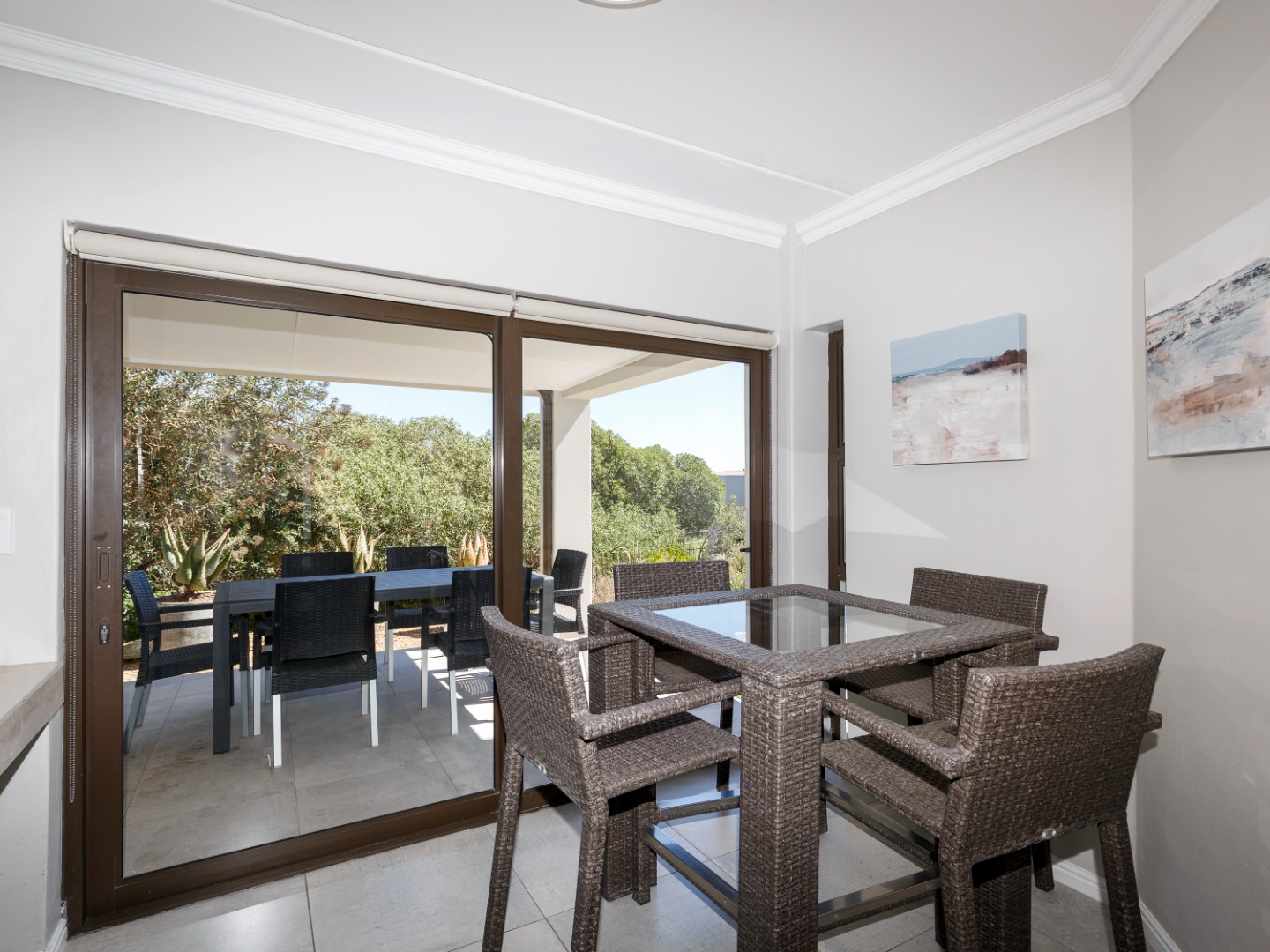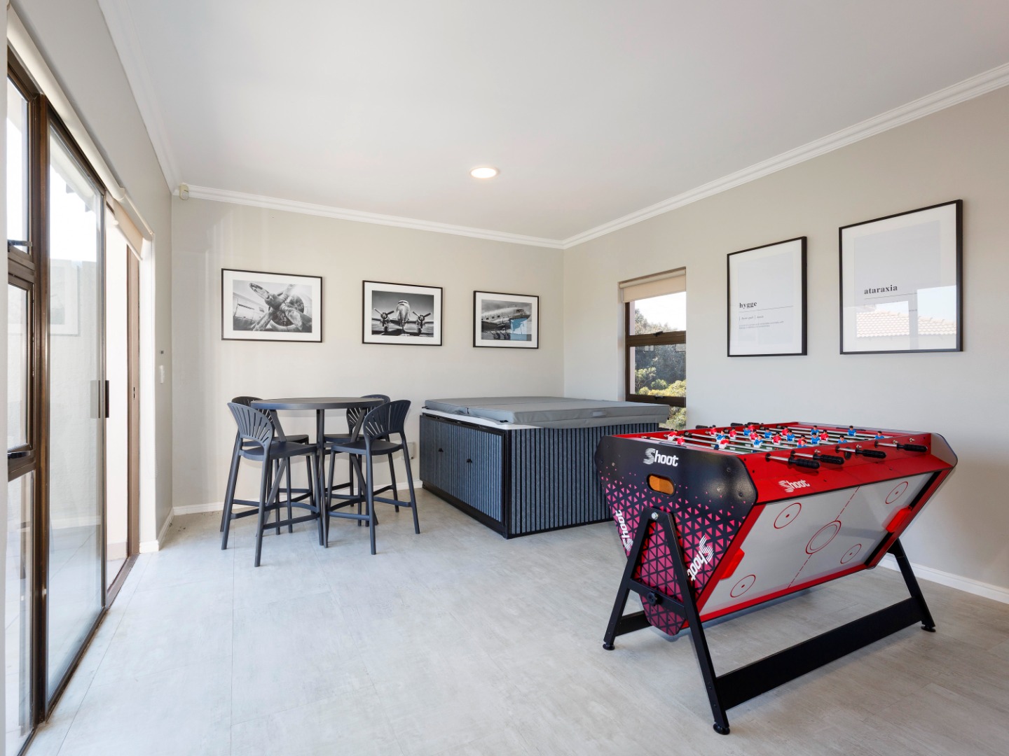 Upstairs, the home features a spacious main bedroom with a private en-suite bathroom, along with two well-sized guest bedrooms that share a full guest bathroom. There is also a separate entertainment room that opens onto its own private patio with an outdoor braai, creating the perfect space for hosting friends and family while enjoying the peaceful estate surroundings.