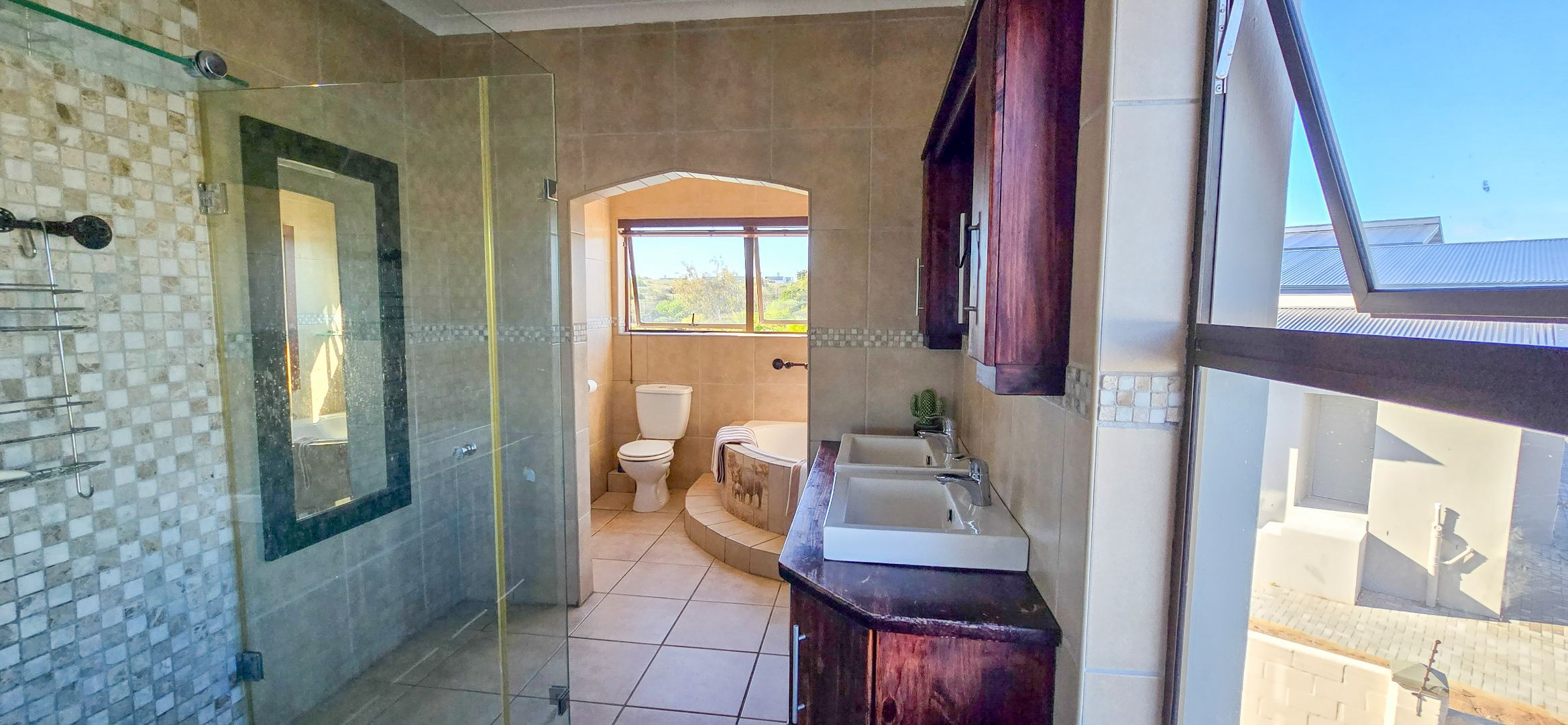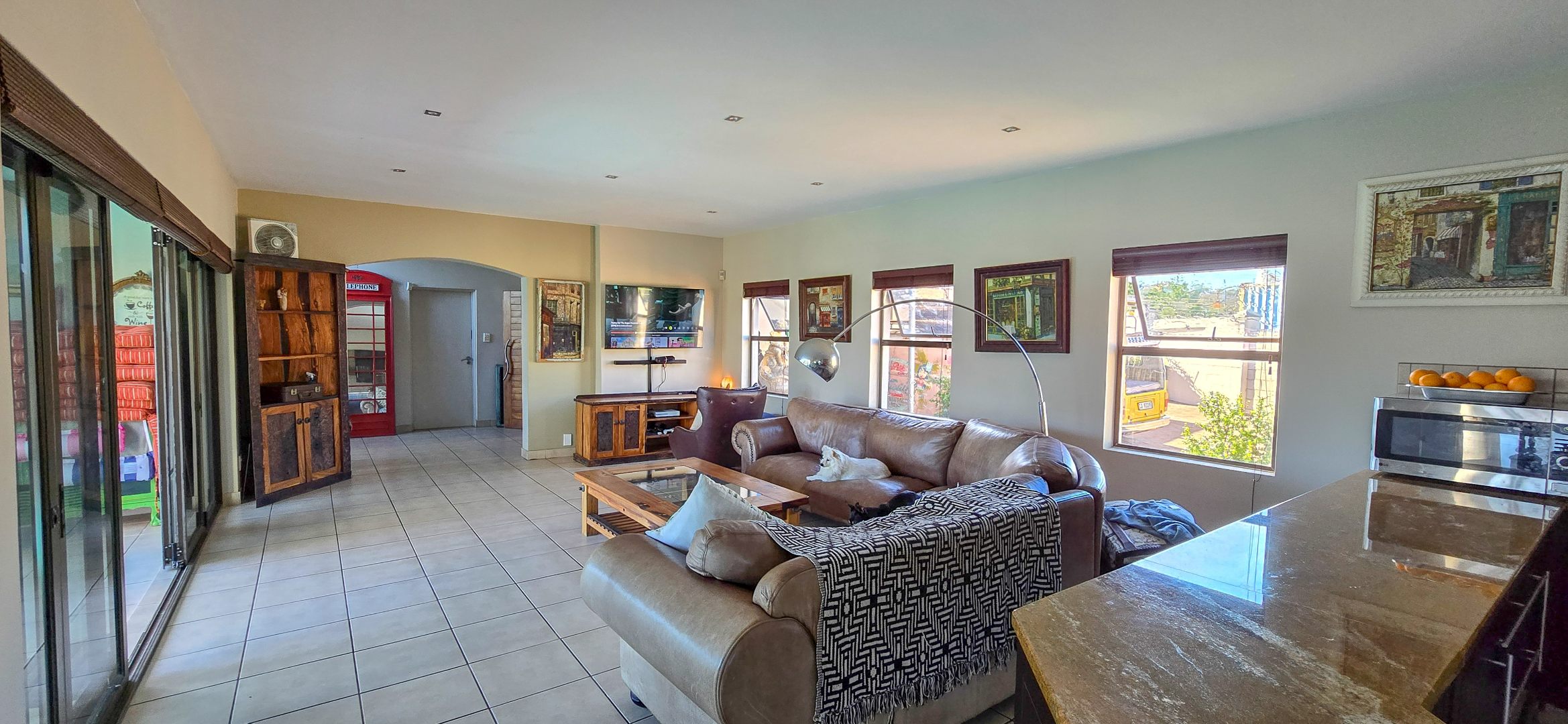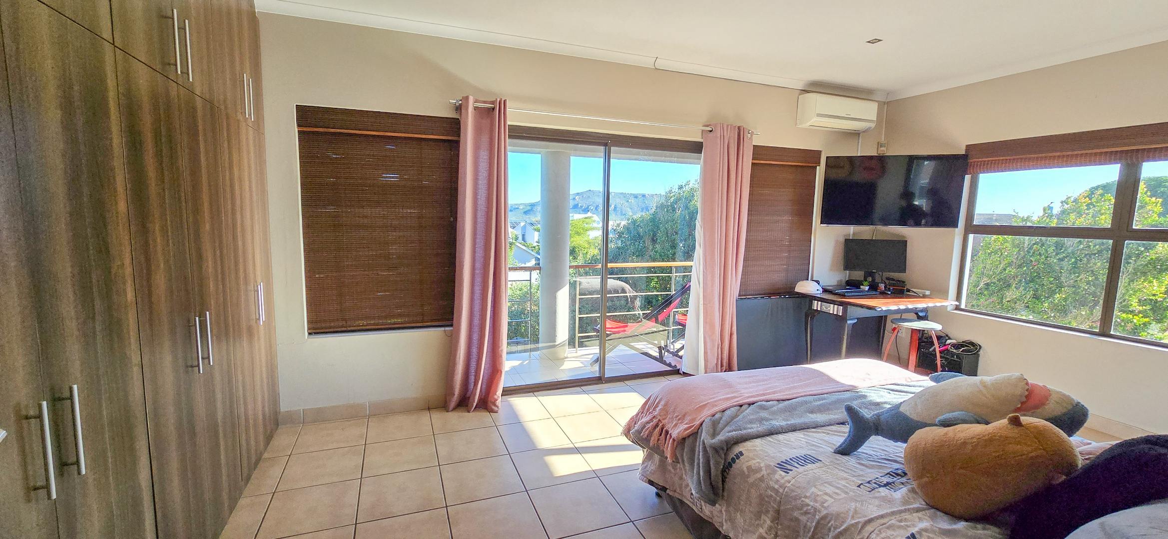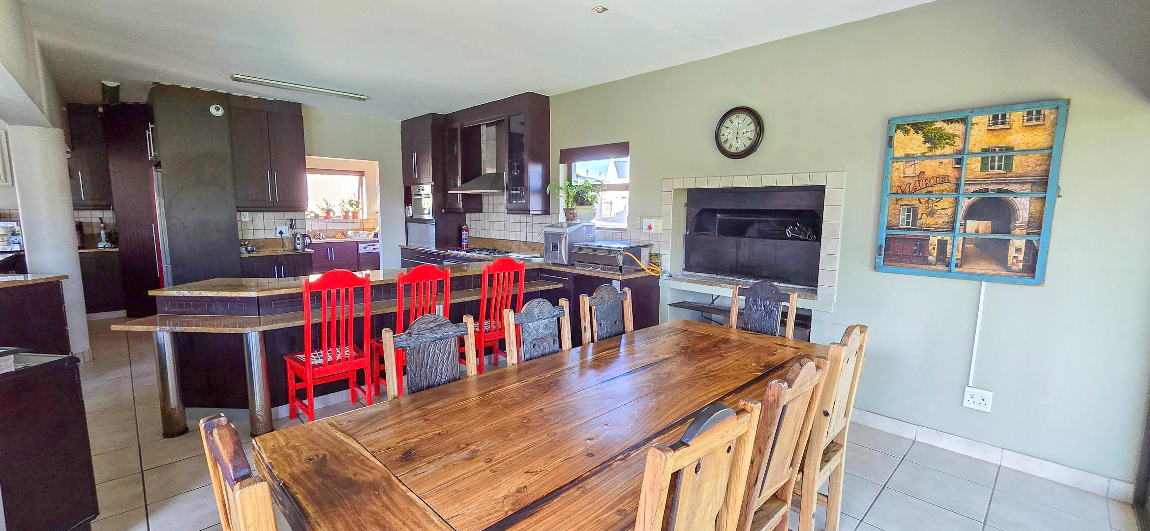 The downstairs living space is designed for easy entertaining, with an open-plan kitchen featuring a gas hob, electric oven, walk-in pantry, separate scullery and breakfast nook. The kitchen flows into a lounge with built-in braai and sliding doors that lead to a wooden deck and sparkling pool, perfect for family summer days. Underfloor heating keeps the space cosy in winter, while extras like a man cave and walk-in safe add unique appeal.