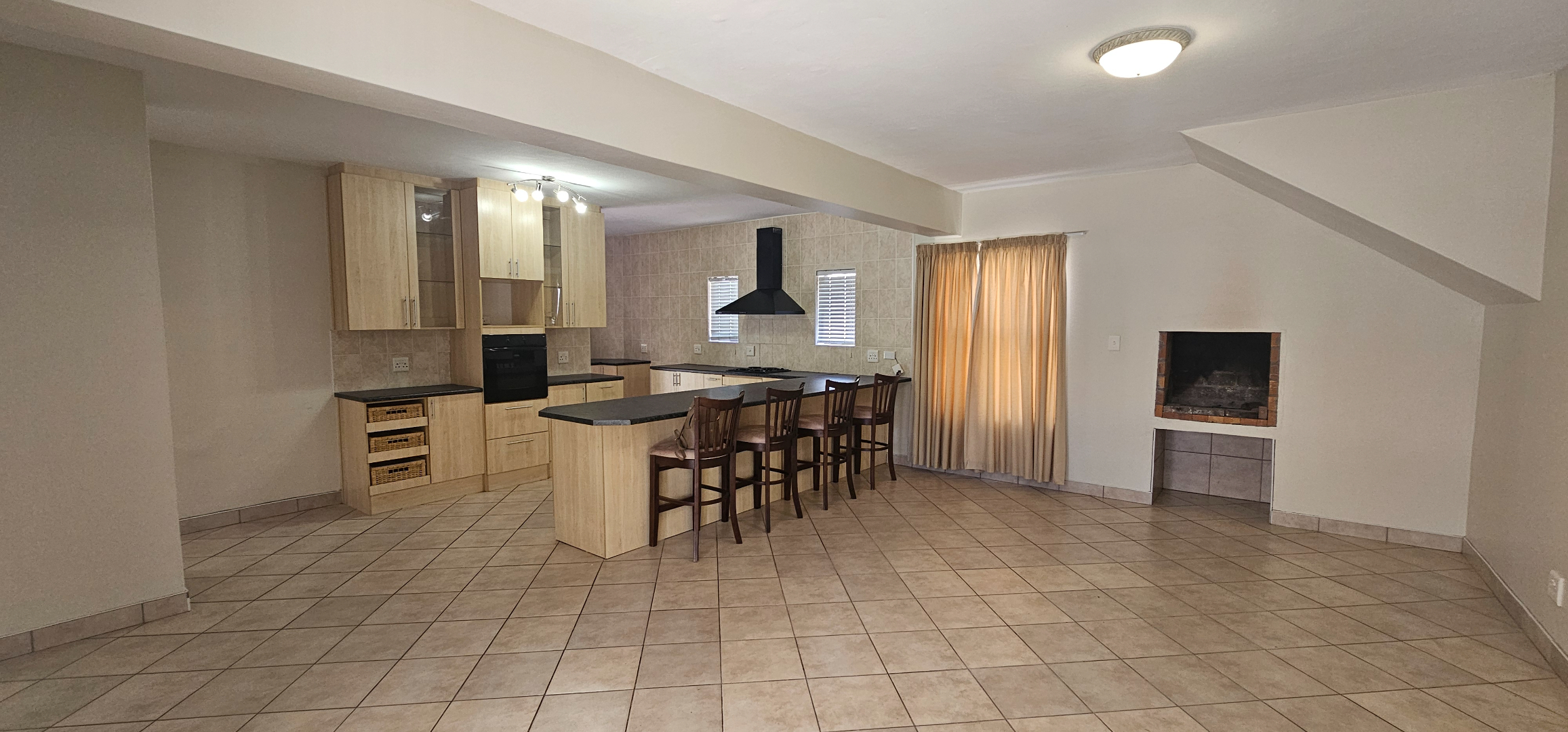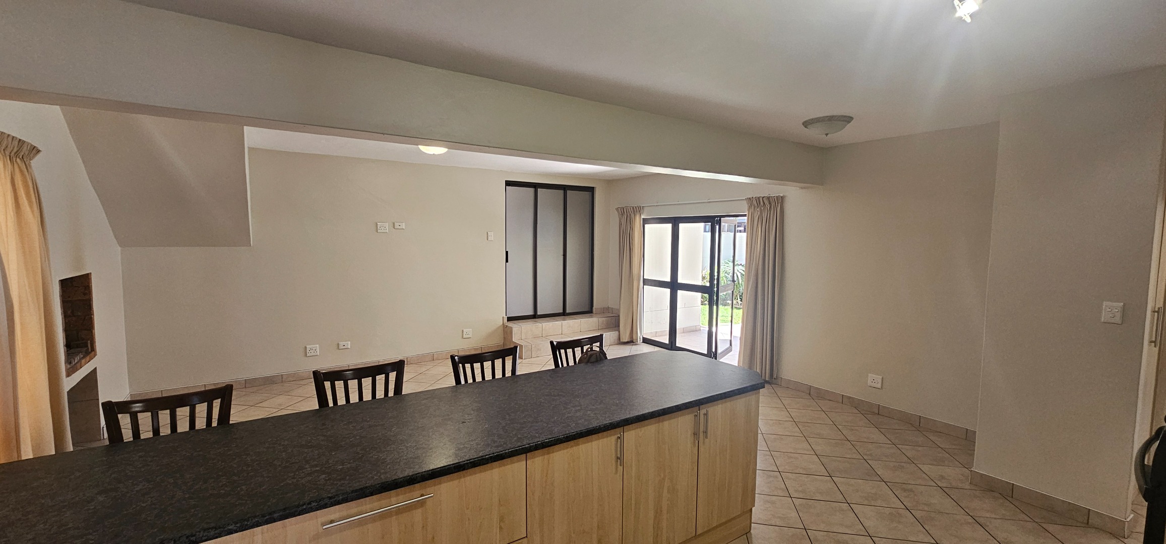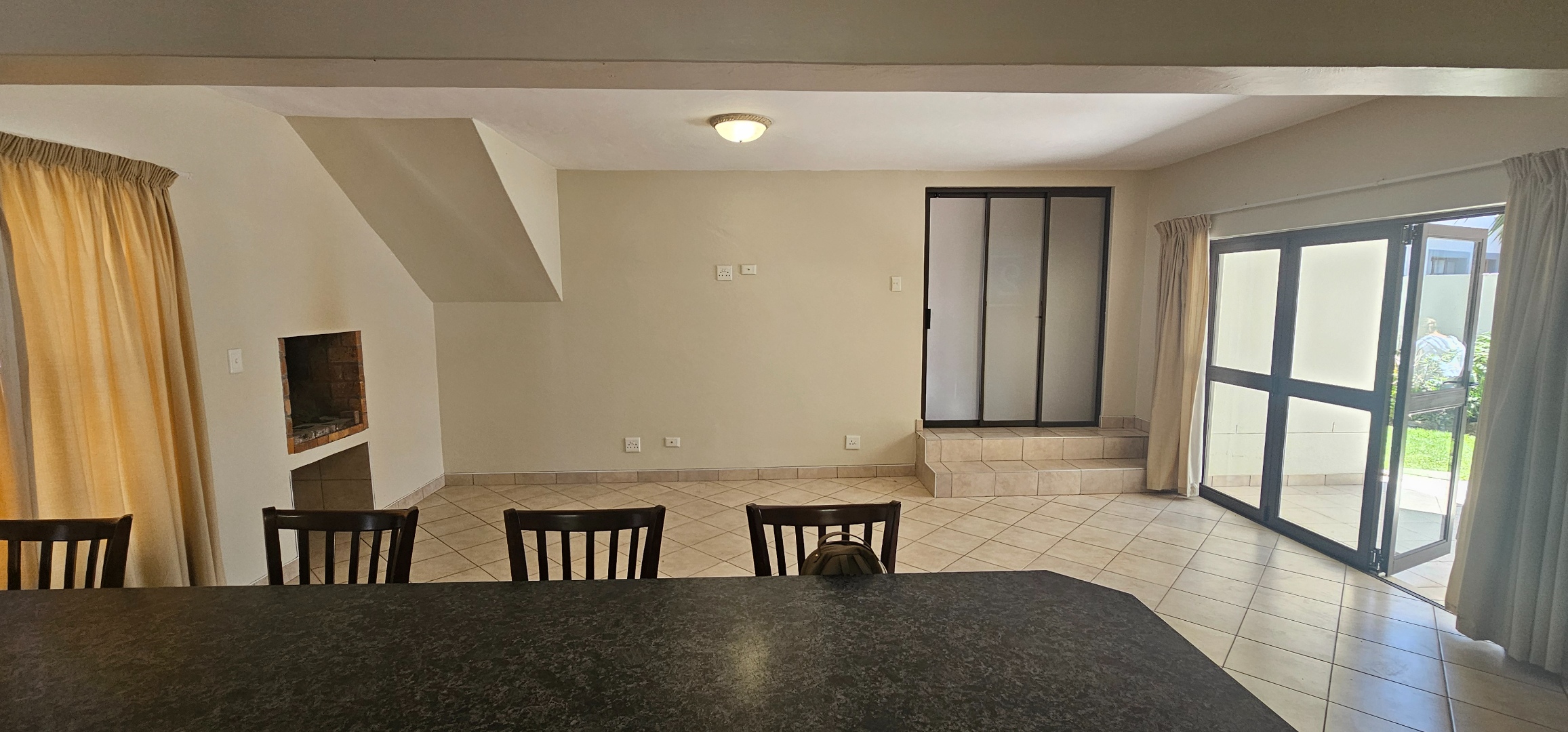 The spacious lounge area, perfect for relaxation and entertaining, includes a built-in braai. Large sliding glass doors provide abundant natural light and lead directly to a private, well-maintained garden and tiled patio, offering excellent indoor-outdoor flow.