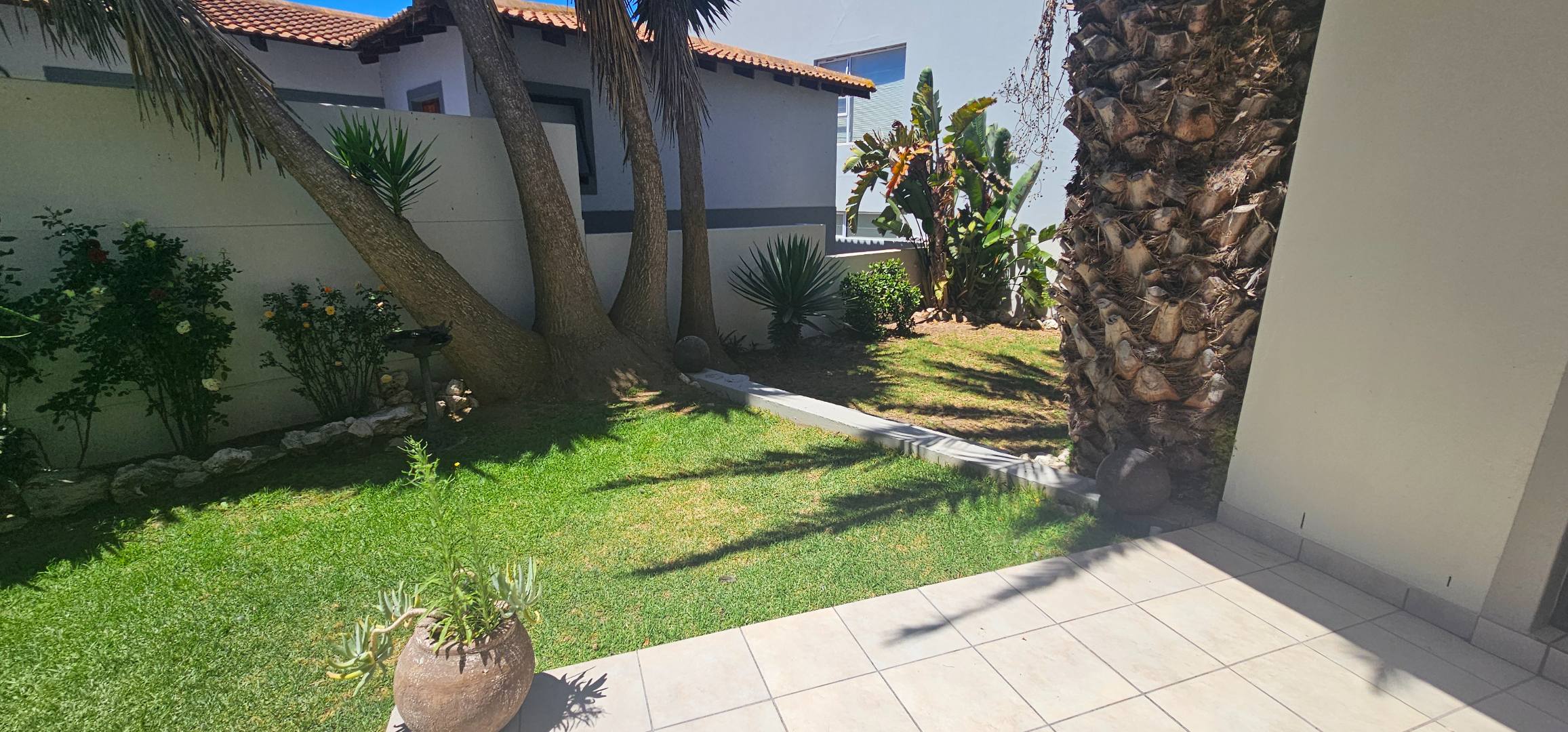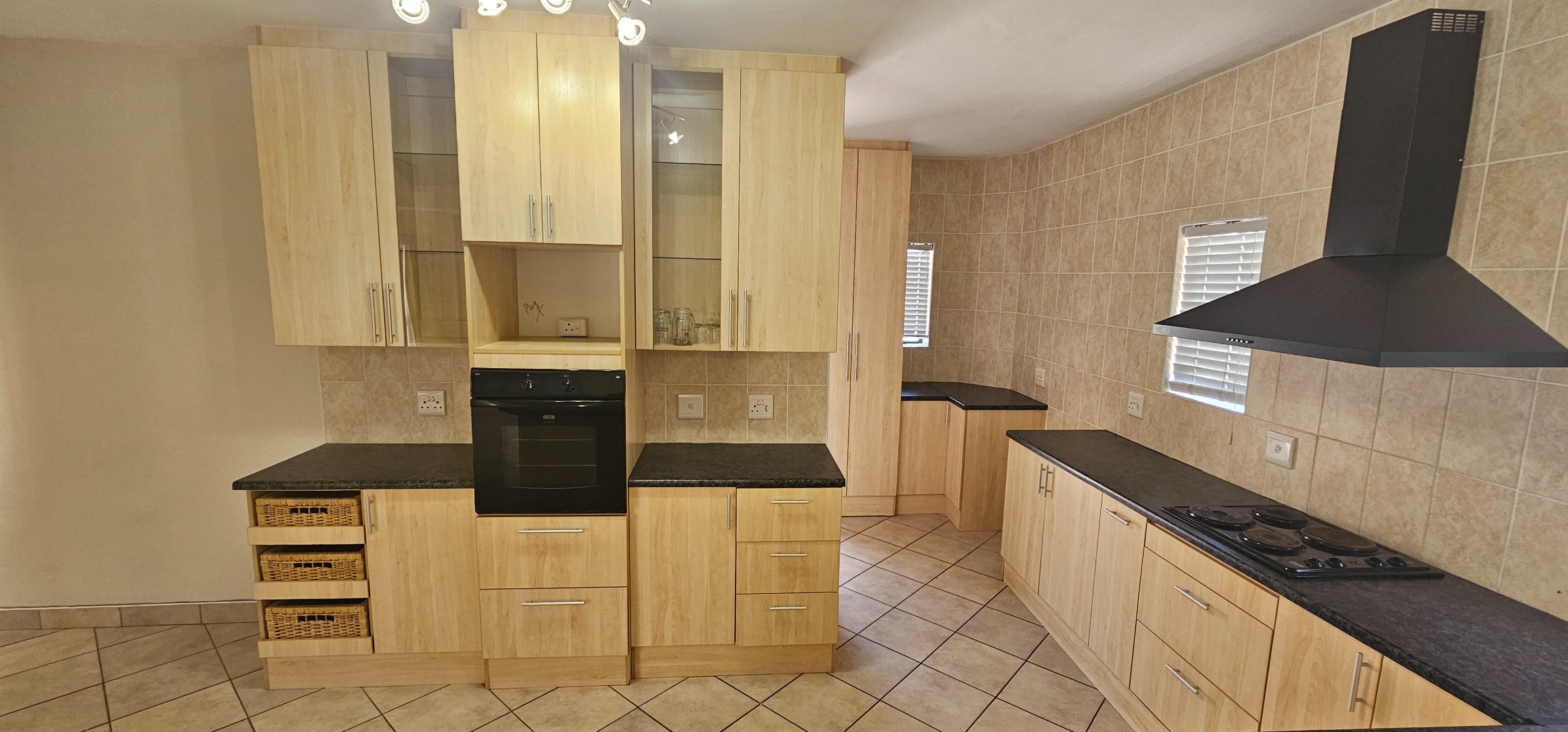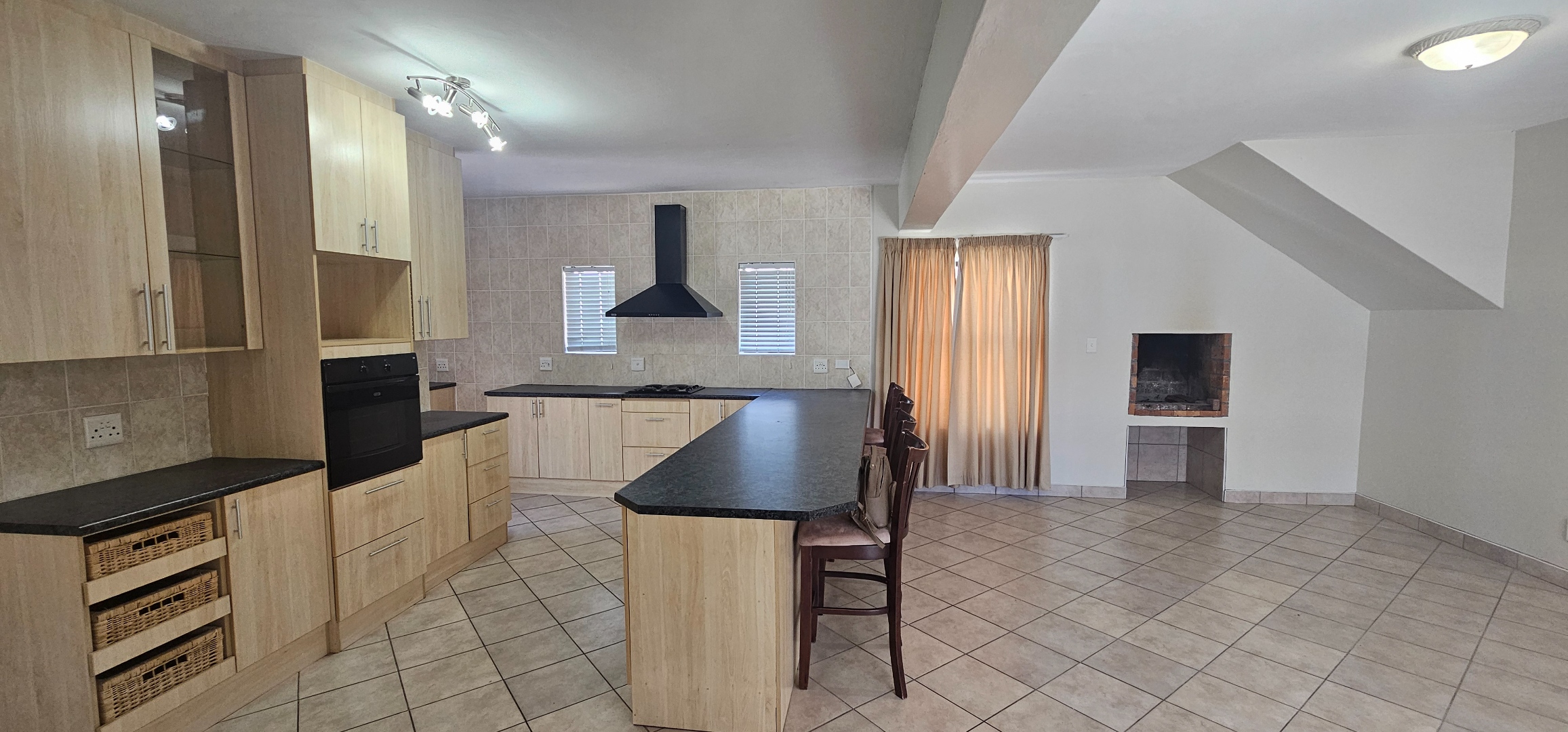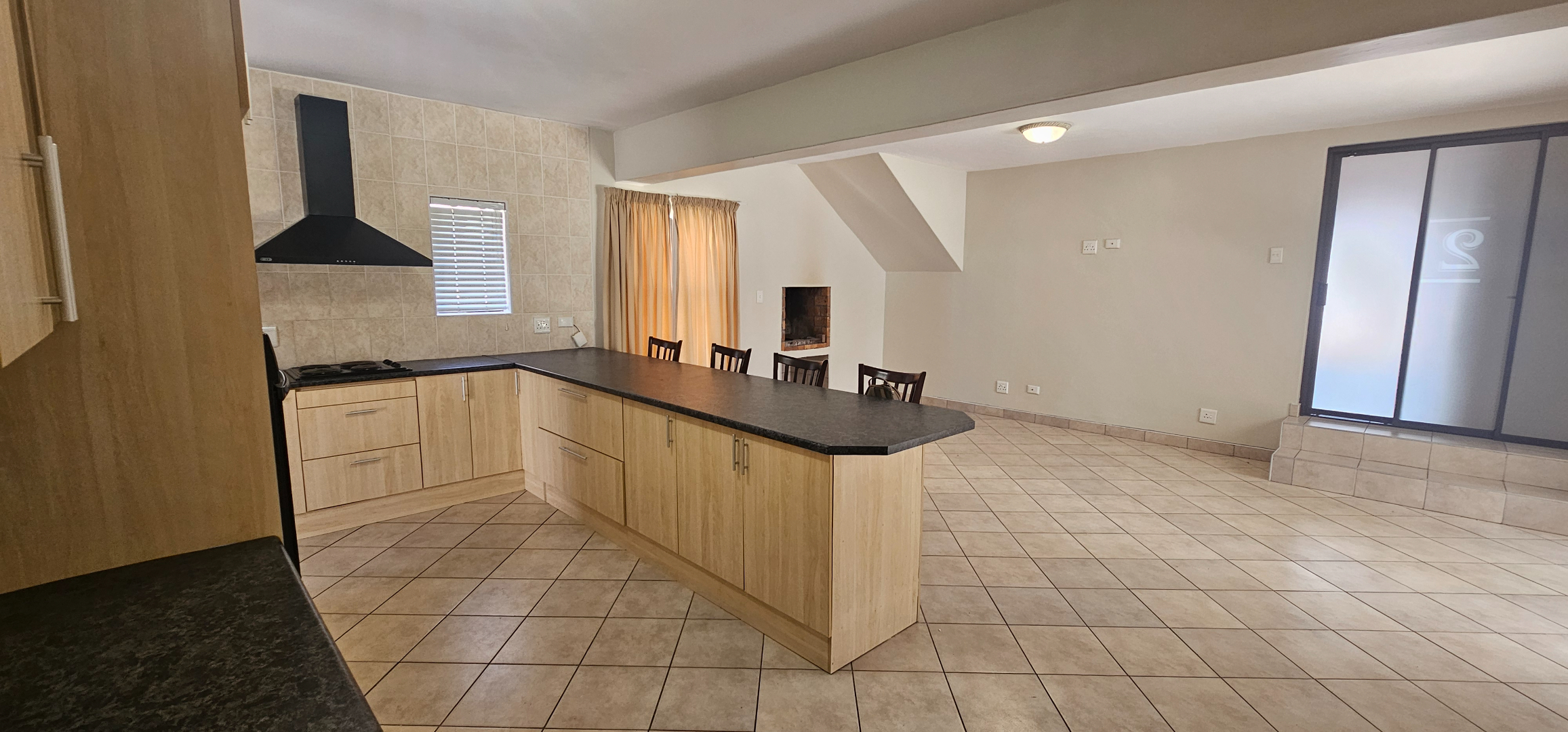 The spacious lounge area, perfect for relaxation and entertaining, includes a built-in braai. Large sliding glass doors provide abundant natural light and lead directly to a private, well-maintained garden and tiled patio, offering excellent indoor-outdoor flow.