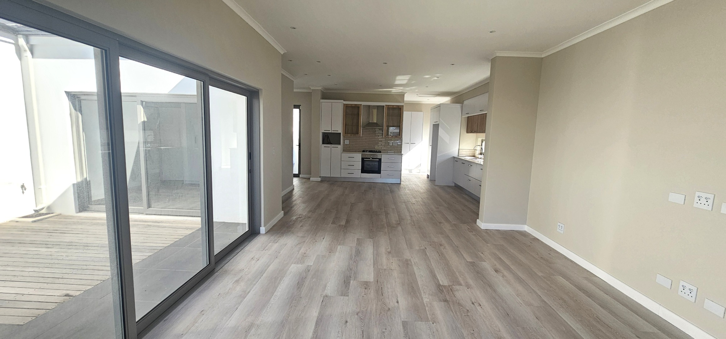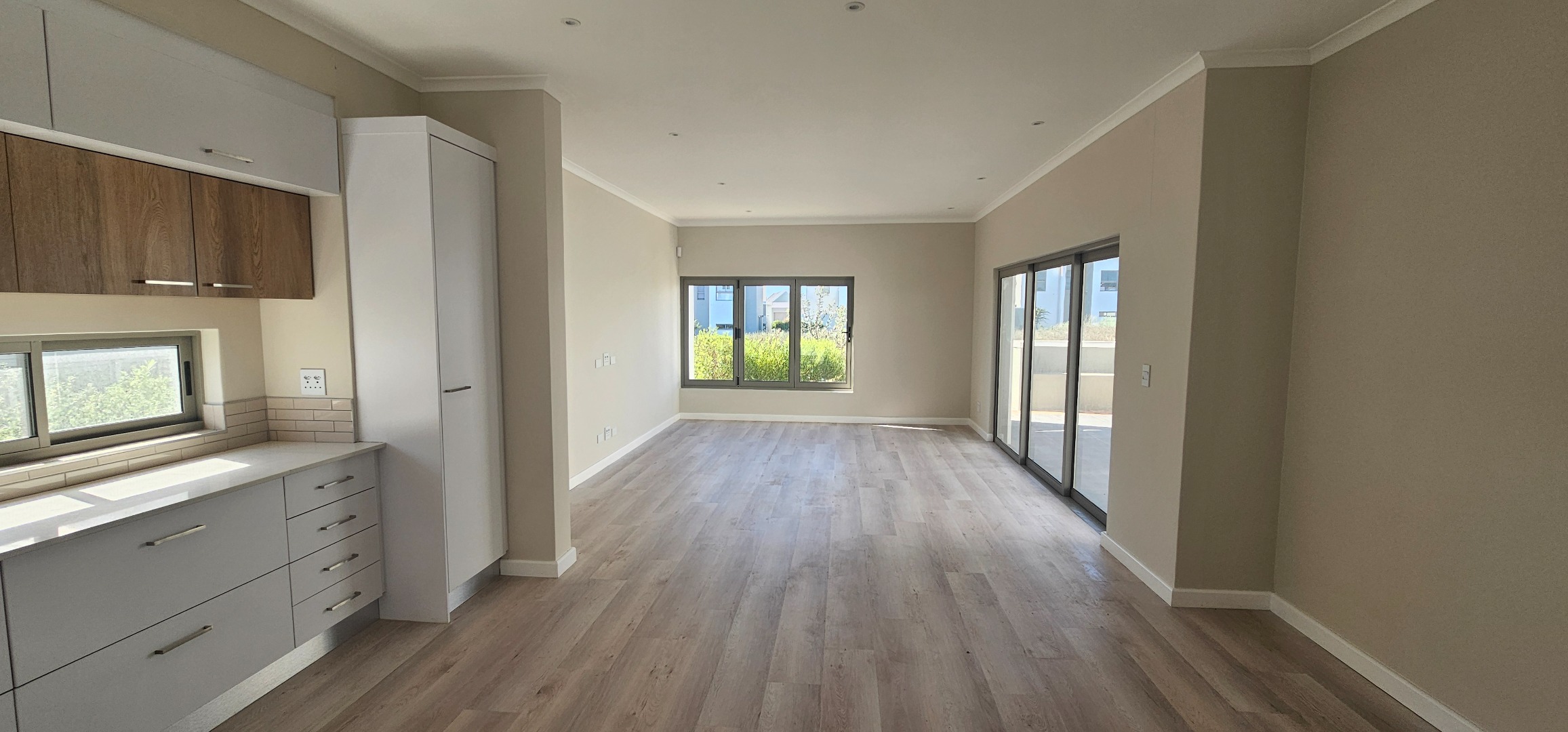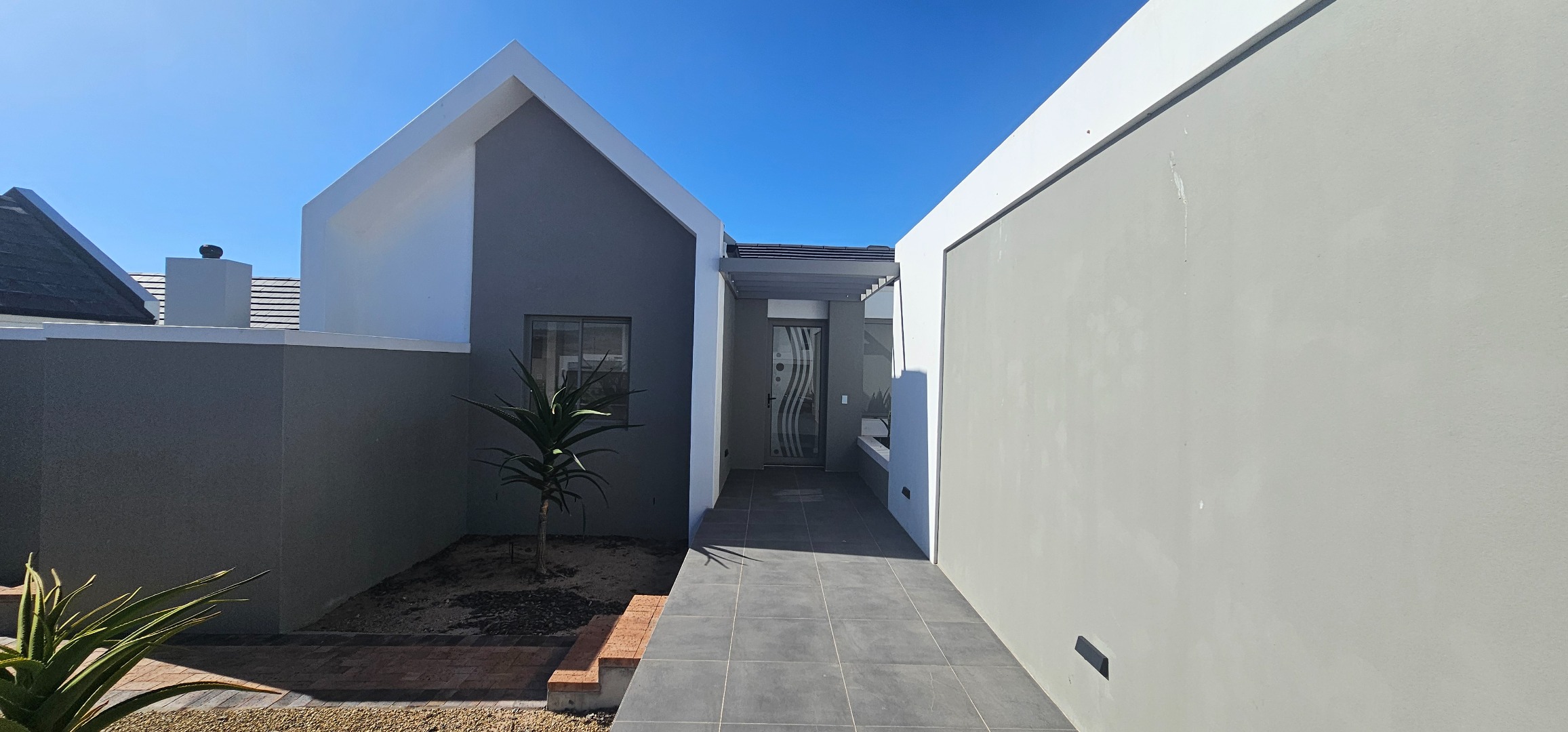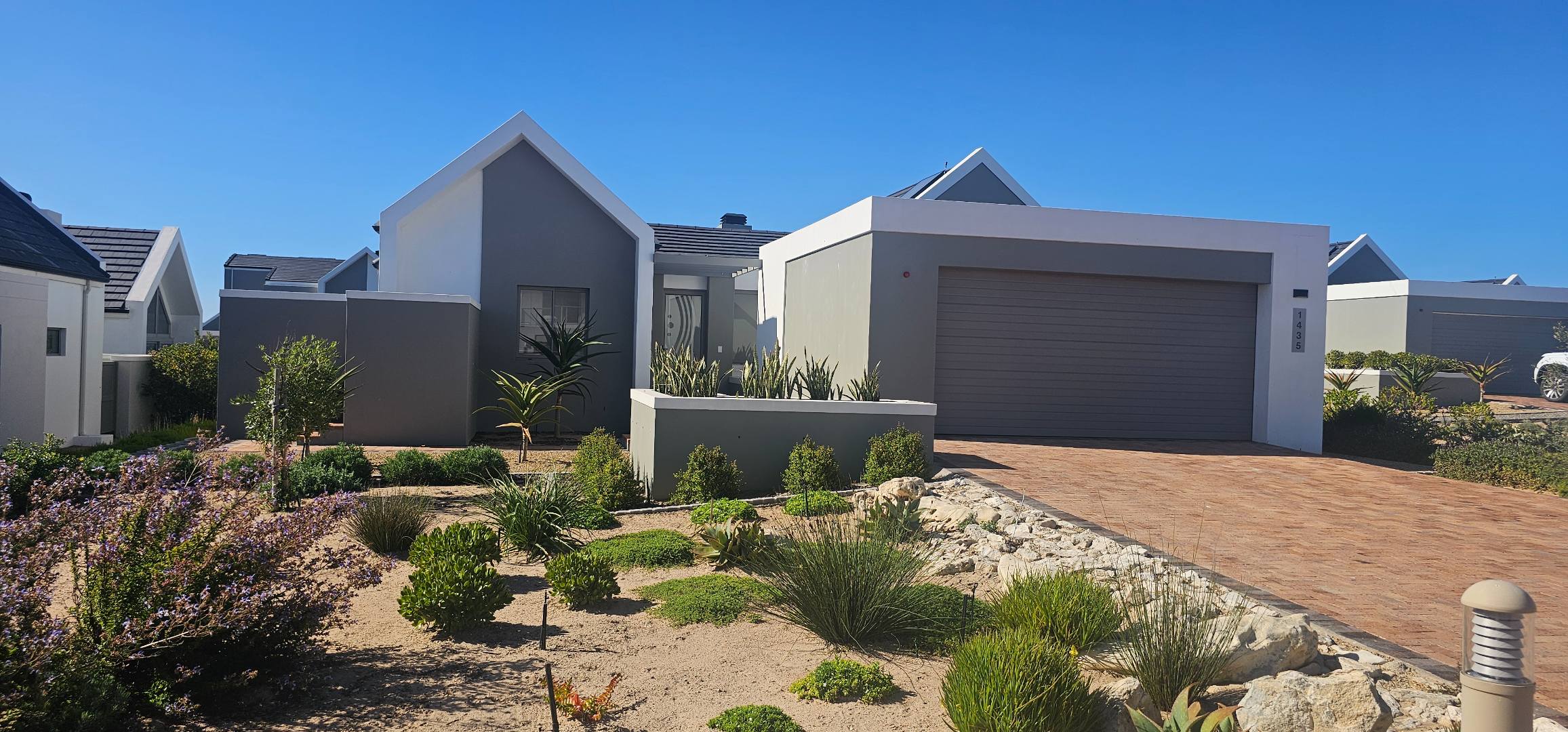 Modern 3-bedroom, 2-bathroom residence is situated within the prestigious Langebaan Country Estate. Designed with a contemporary aesthetic, the home features a well-appointed open-plan layout that seamlessly integrates living, dining, and kitchen areas. The property includes a double garage and two additional parking spaces, providing ample accommodation for vehicles. An entrance hall welcomes residents into a space characterized by clean lines and modern finishes, setting a comfortable tone throughout.