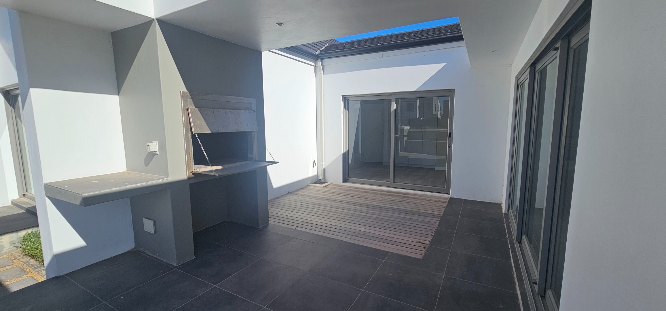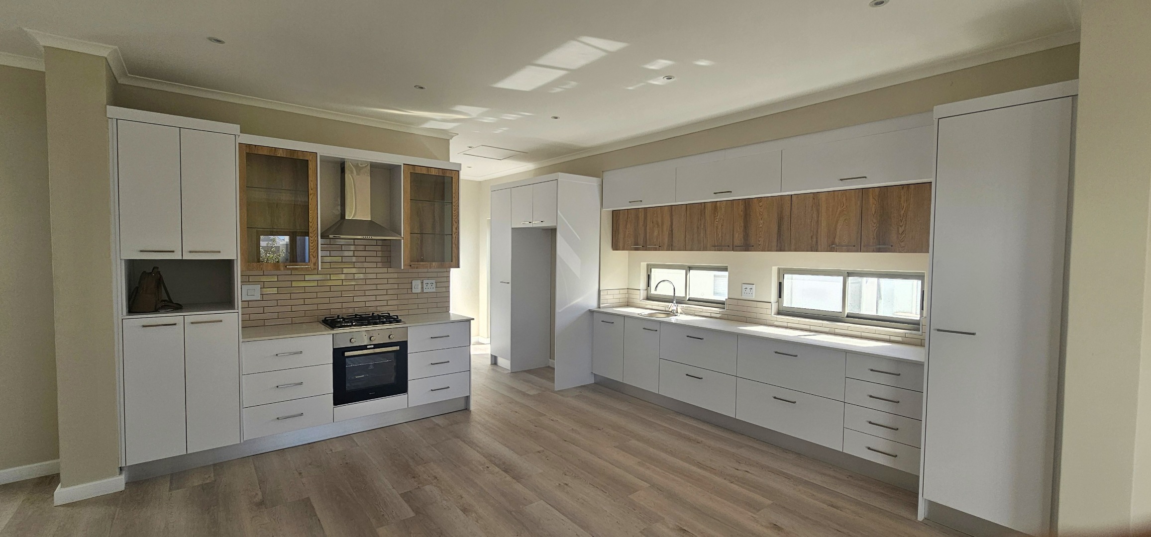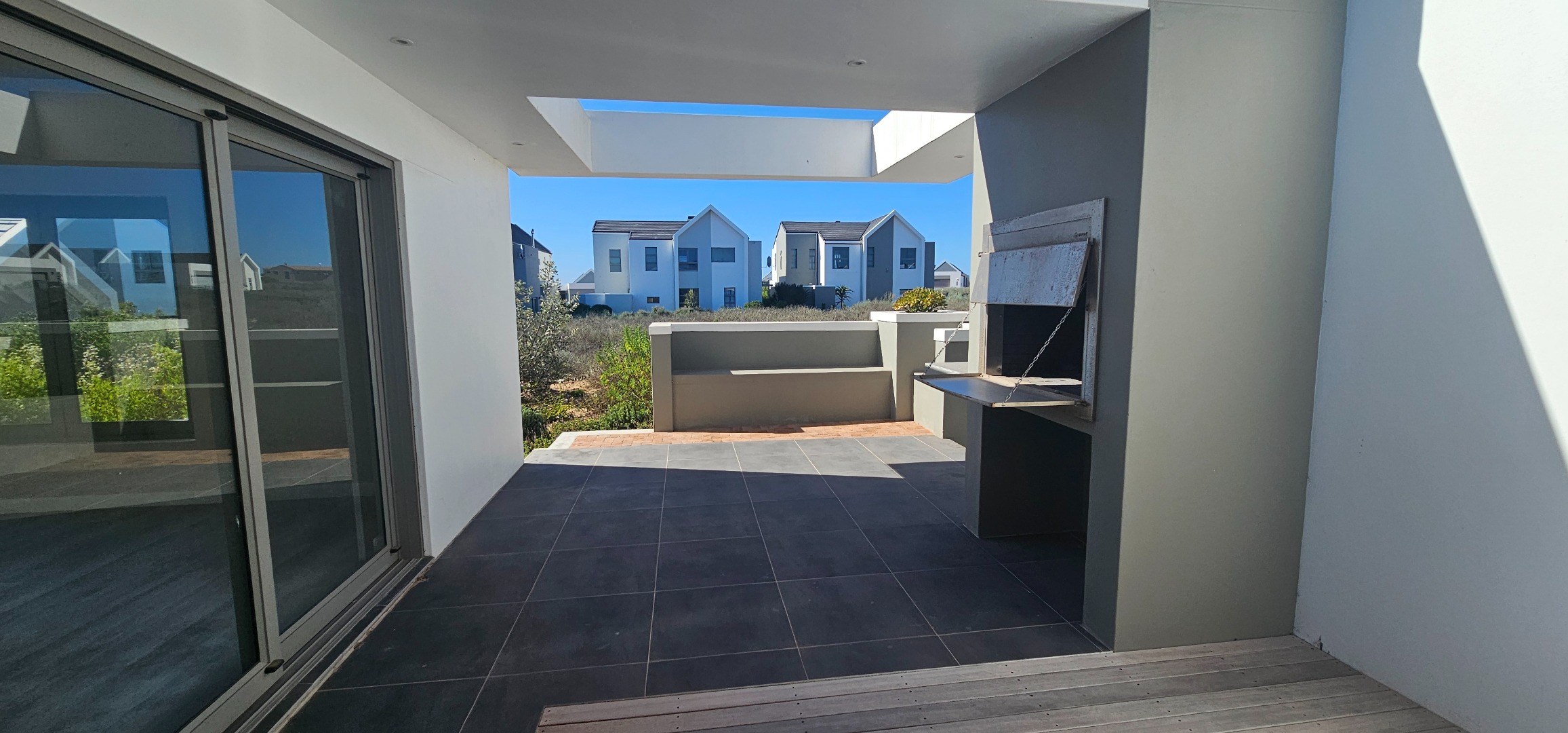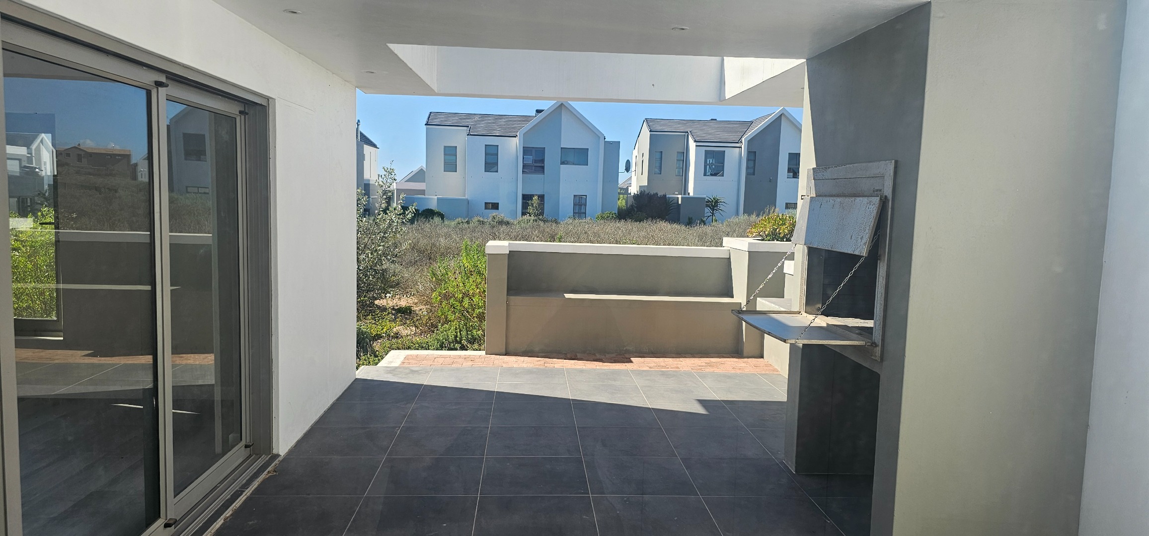 The heart of this home is its modern kitchen, equipped with a gas hob, oven, and extractor fan, complemented by stylish two-tone cabinetry and laminate flooring. Natural light floods the space, enhancing the bright and inviting atmosphere. Adjacent to the main living area, a dedicated laundry room and additional storage ensure practical living. The property also boasts a patio with a built-in braai, perfect for outdoor entertaining and enjoying the scenic views.