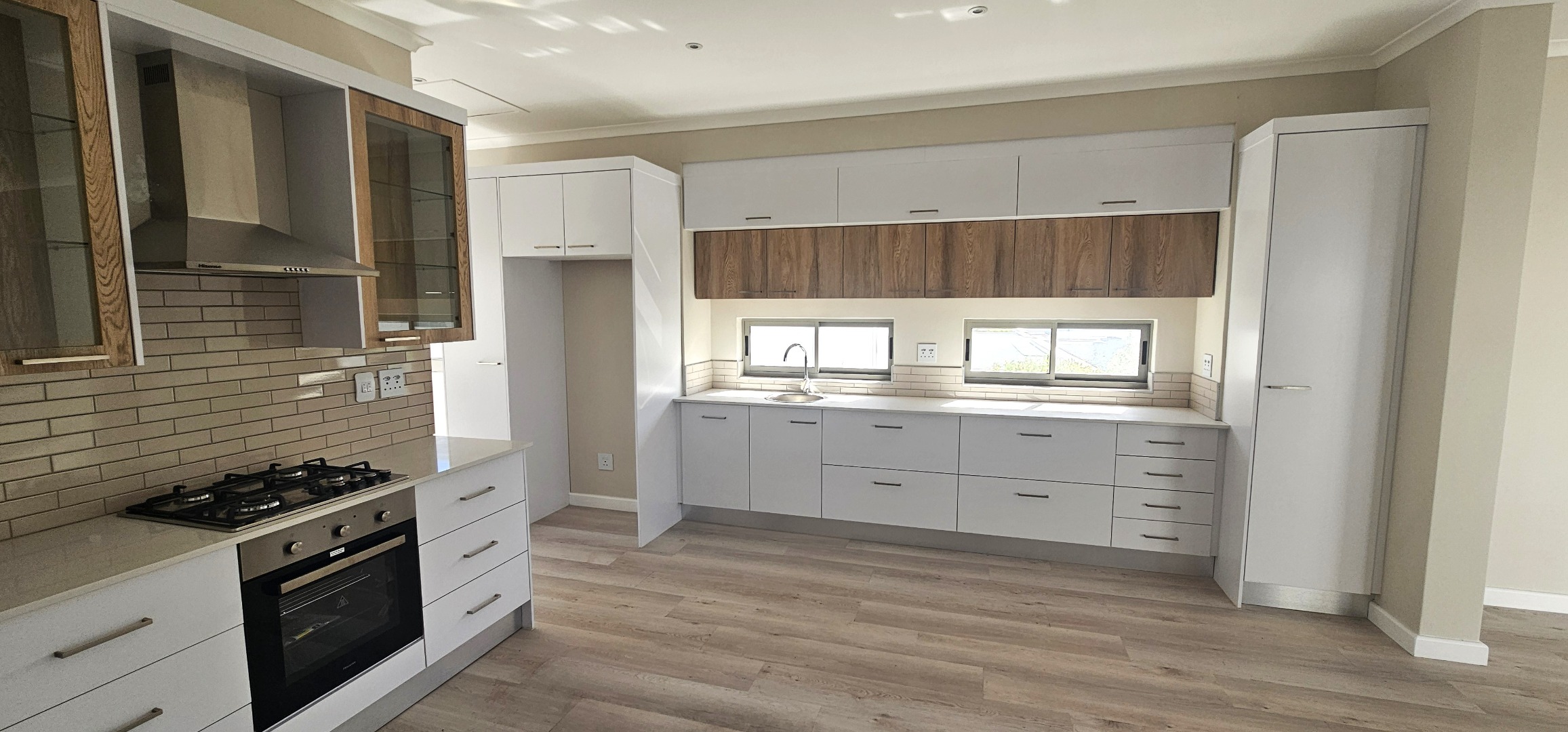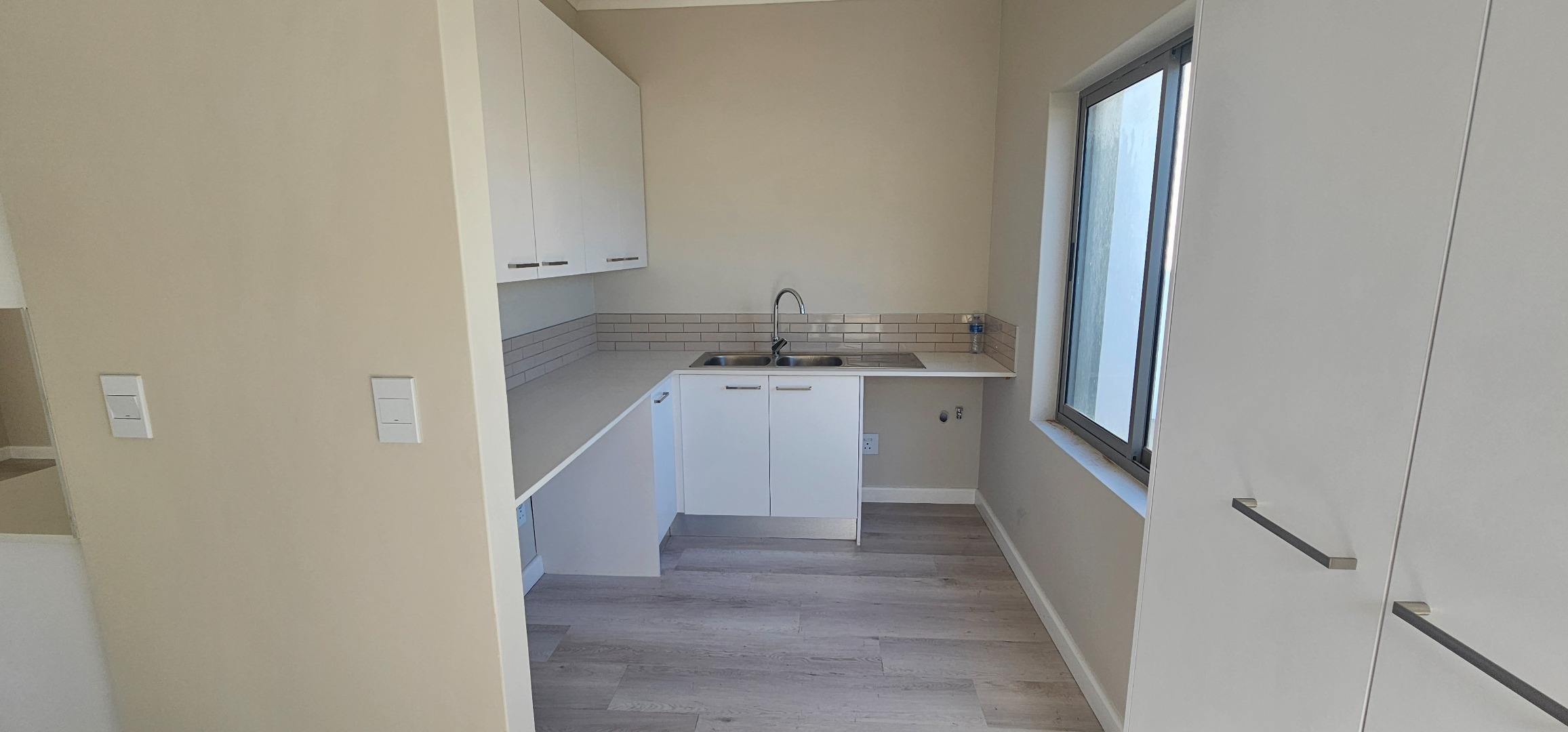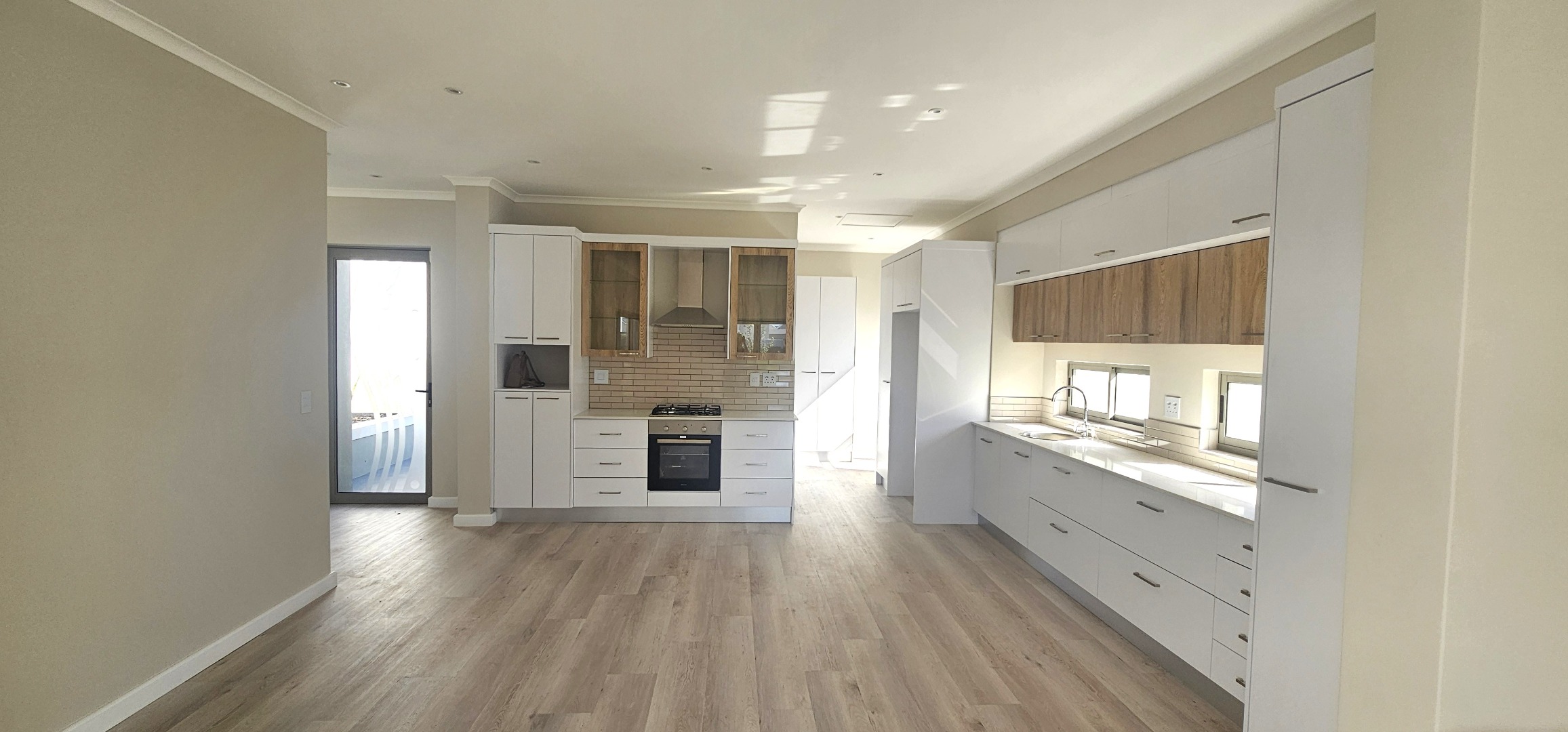 The heart of this home is its modern kitchen, equipped with a gas hob, oven, and extractor fan, complemented by stylish two-tone cabinetry and laminate flooring. Natural light floods the space, enhancing the bright and inviting atmosphere. Adjacent to the main living area, a dedicated laundry room and additional storage ensure practical living. The property also boasts a patio with a built-in braai, perfect for outdoor entertaining and enjoying the scenic views.