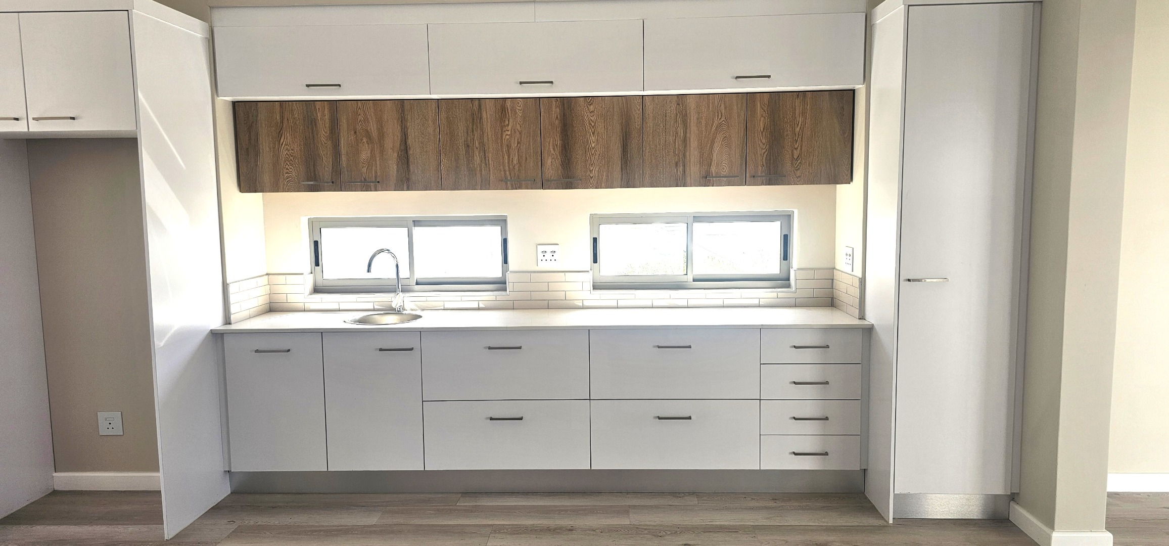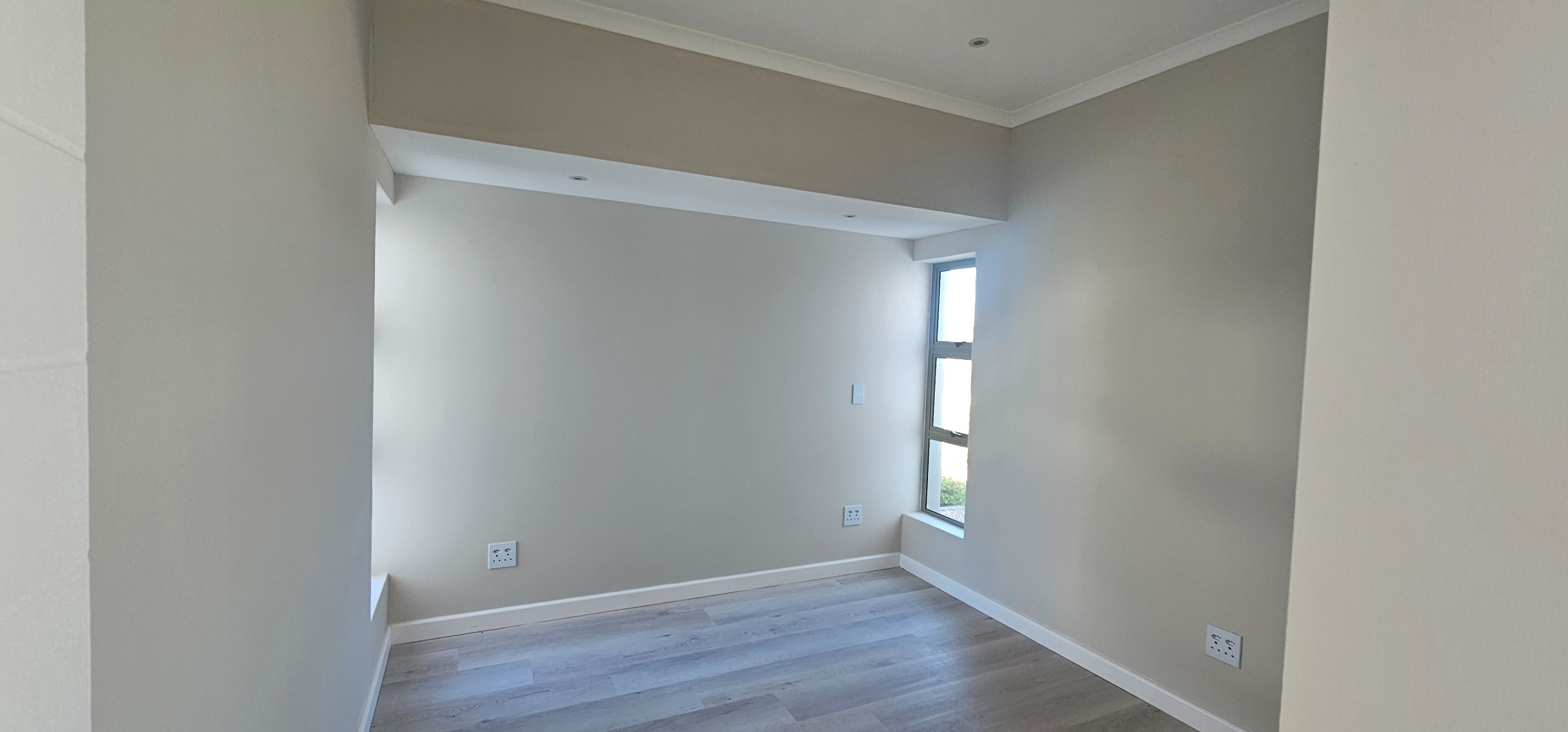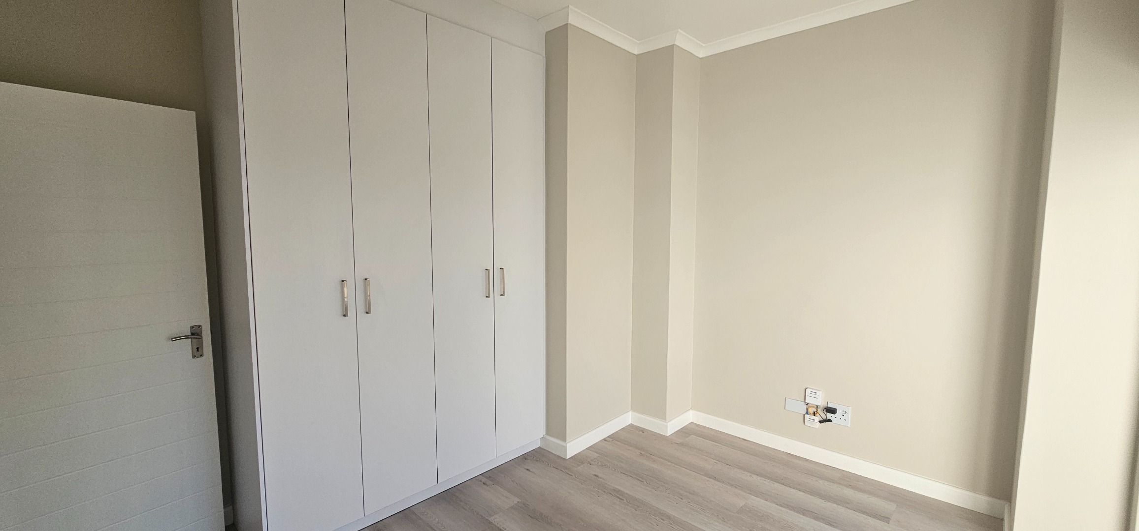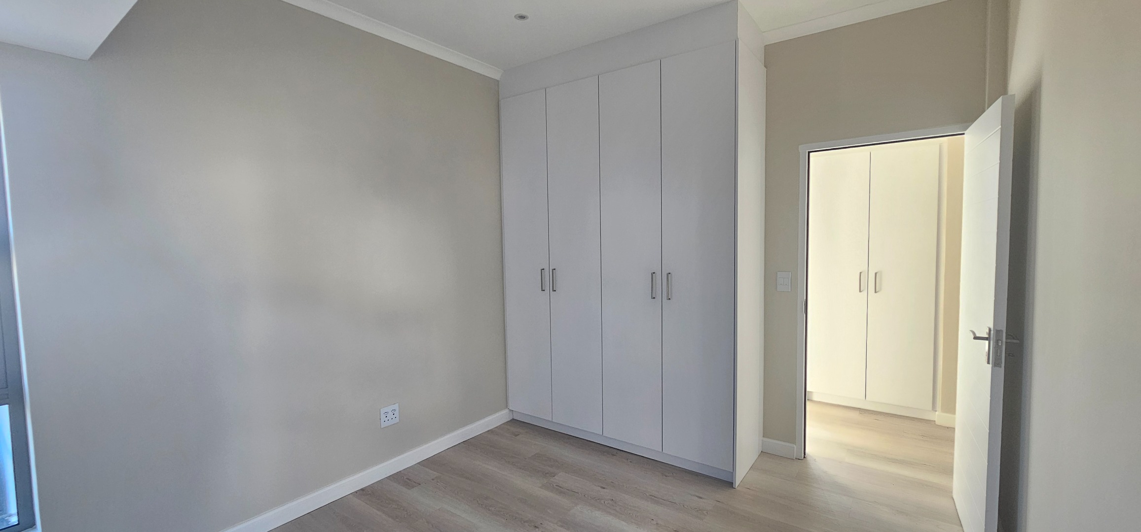 The heart of this home is its modern kitchen, equipped with a gas hob, oven, and extractor fan, complemented by stylish two-tone cabinetry and laminate flooring. Natural light floods the space, enhancing the bright and inviting atmosphere. Adjacent to the main living area, a dedicated laundry room and additional storage ensure practical living. The property also boasts a patio with a built-in braai, perfect for outdoor entertaining and enjoying the scenic views.